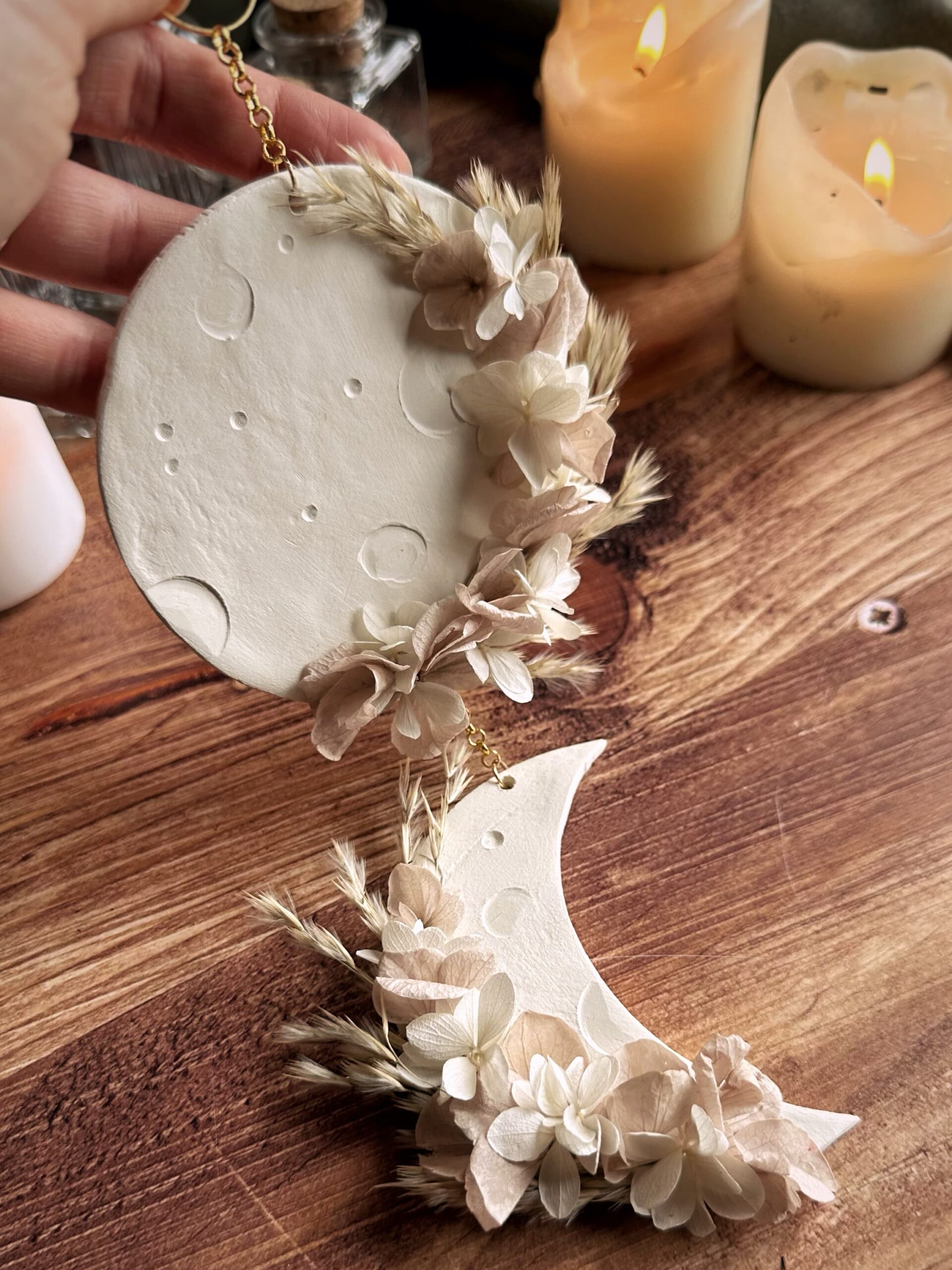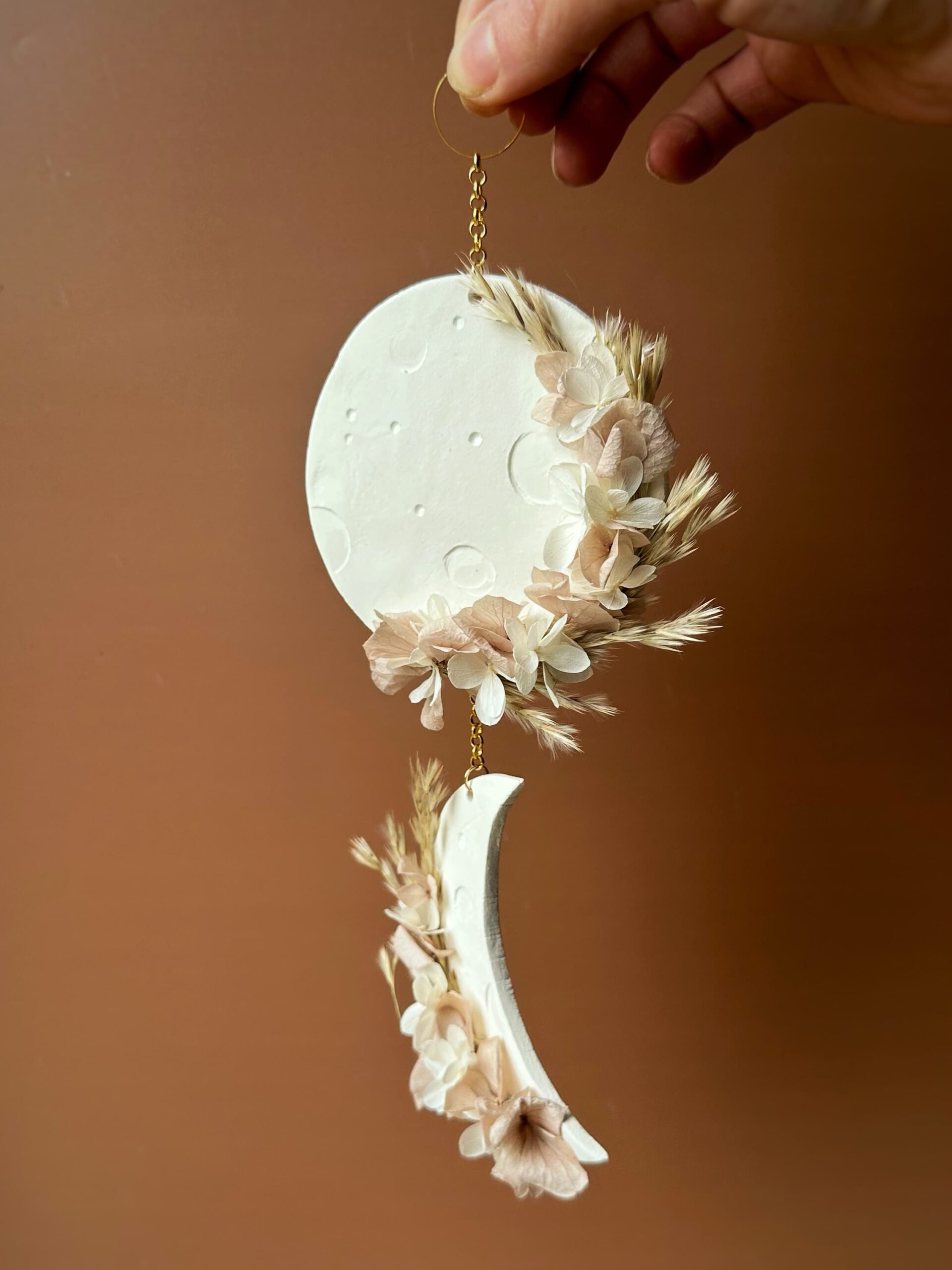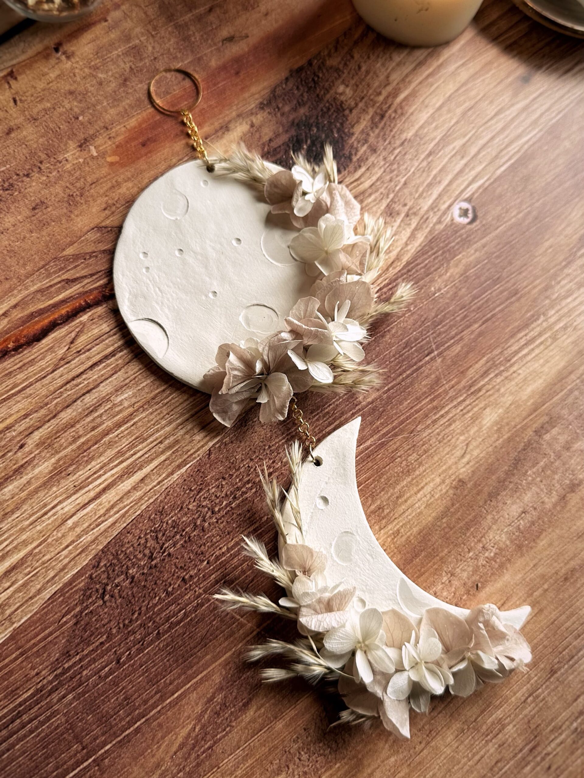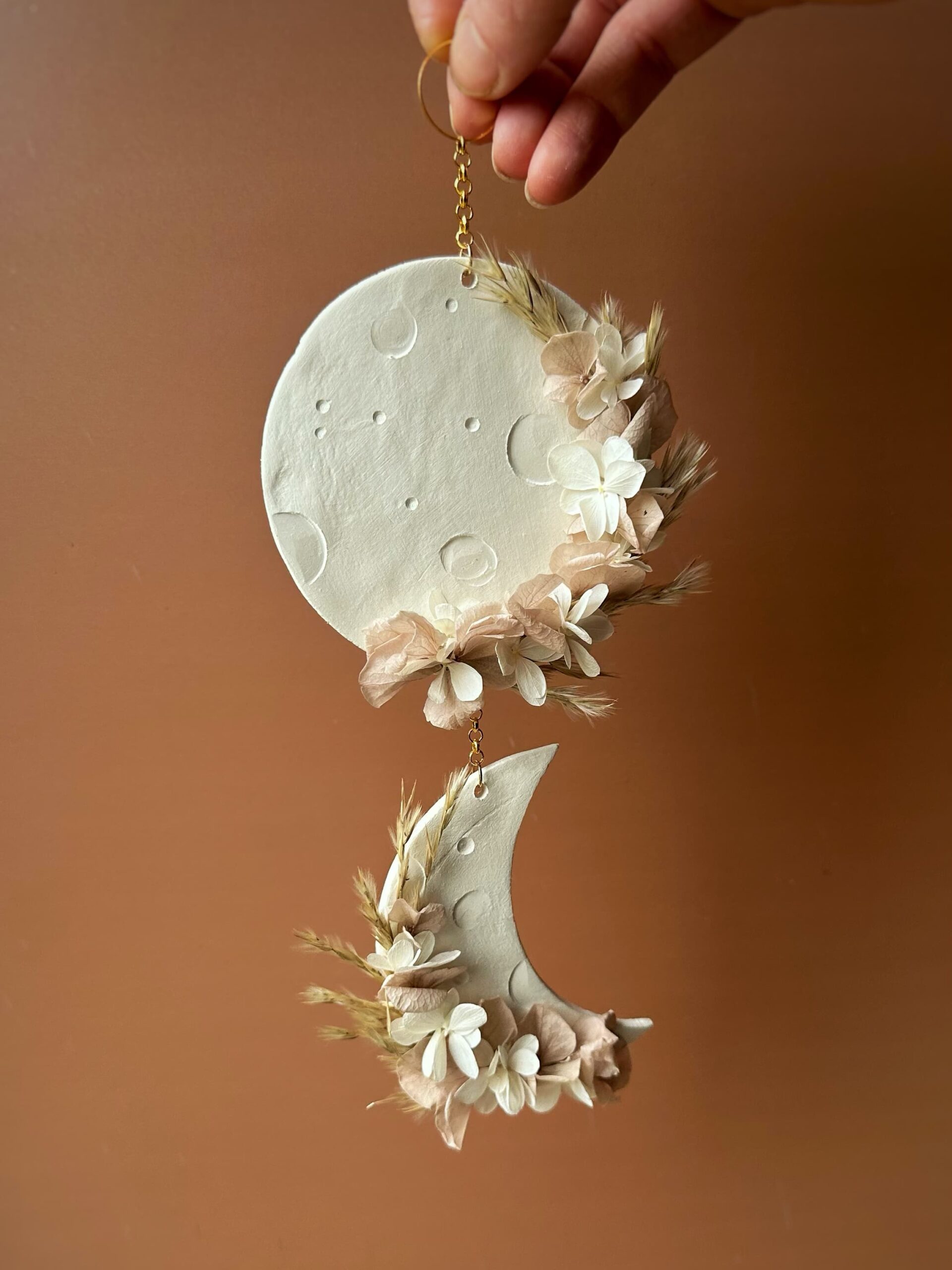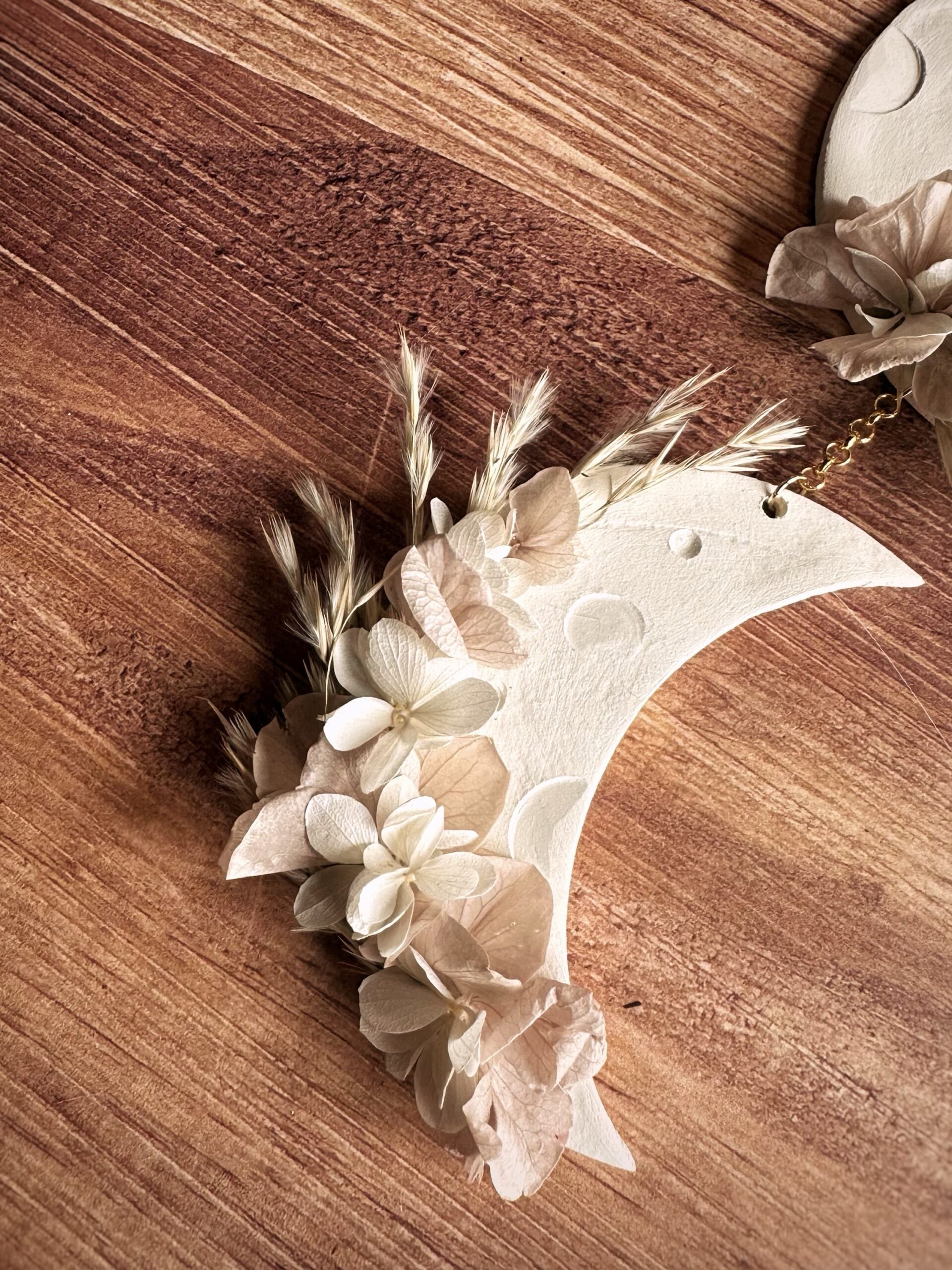 Aube – Suspension deux lunes en fleurs séchées et stabilisées et argile