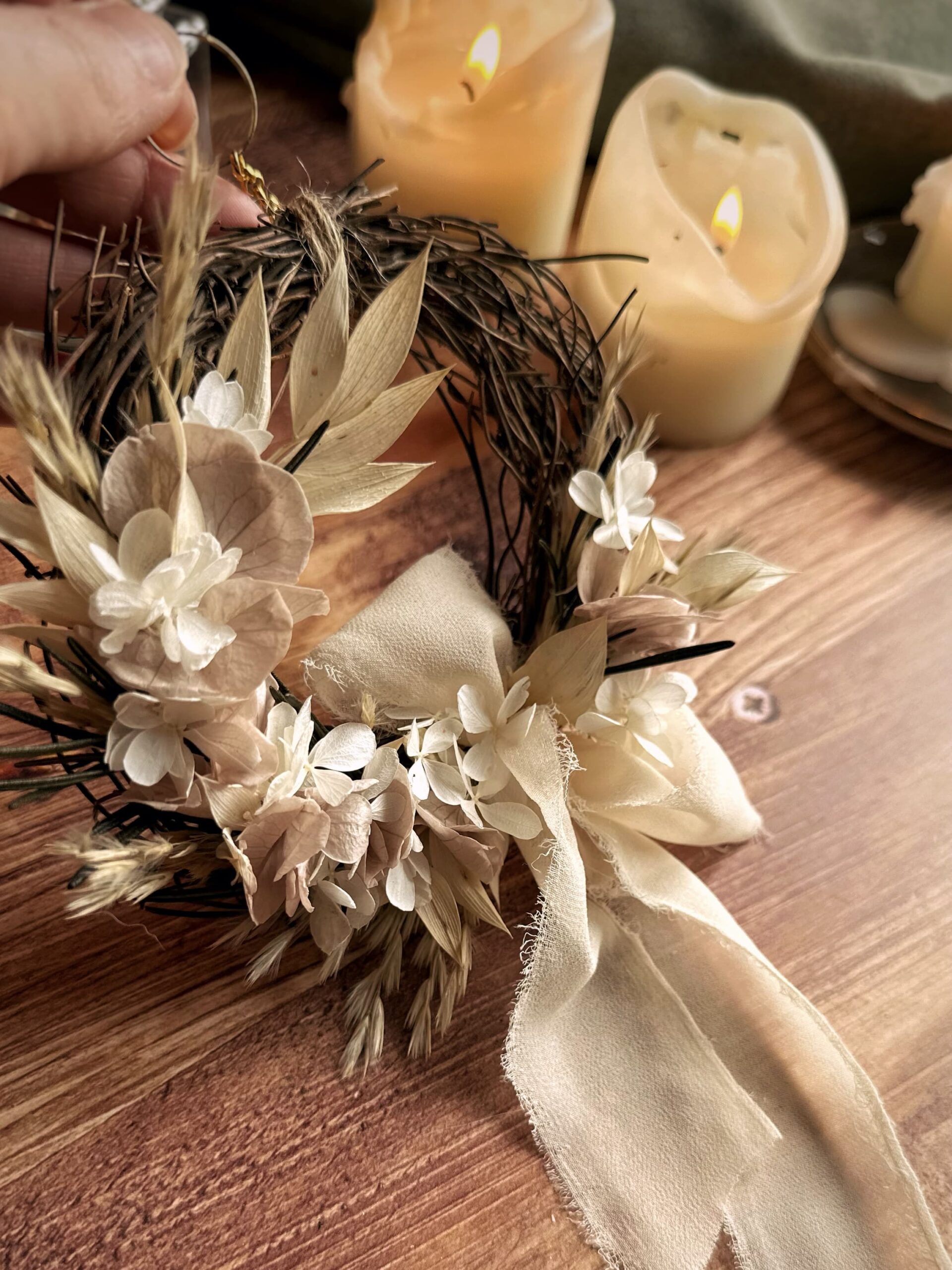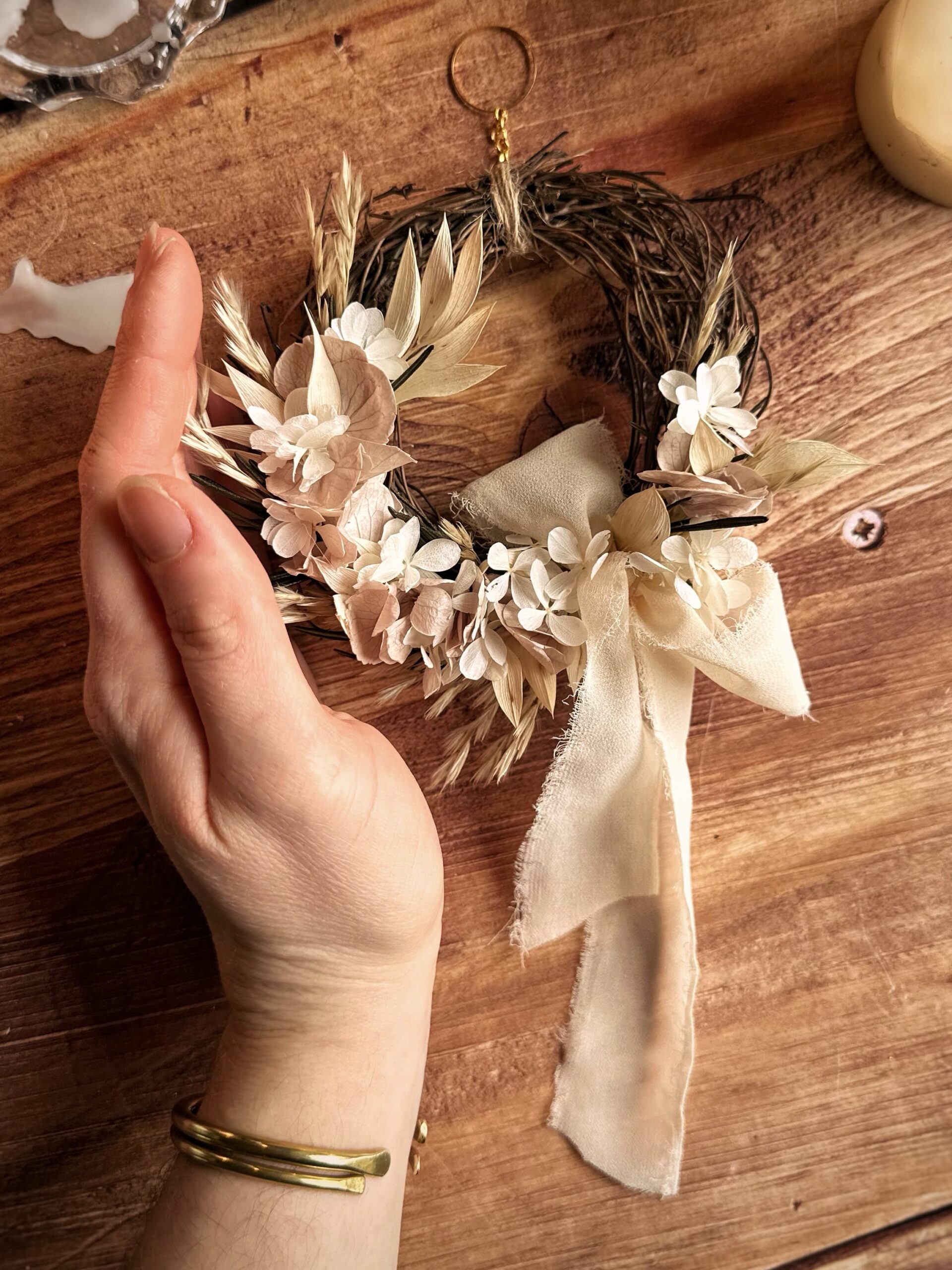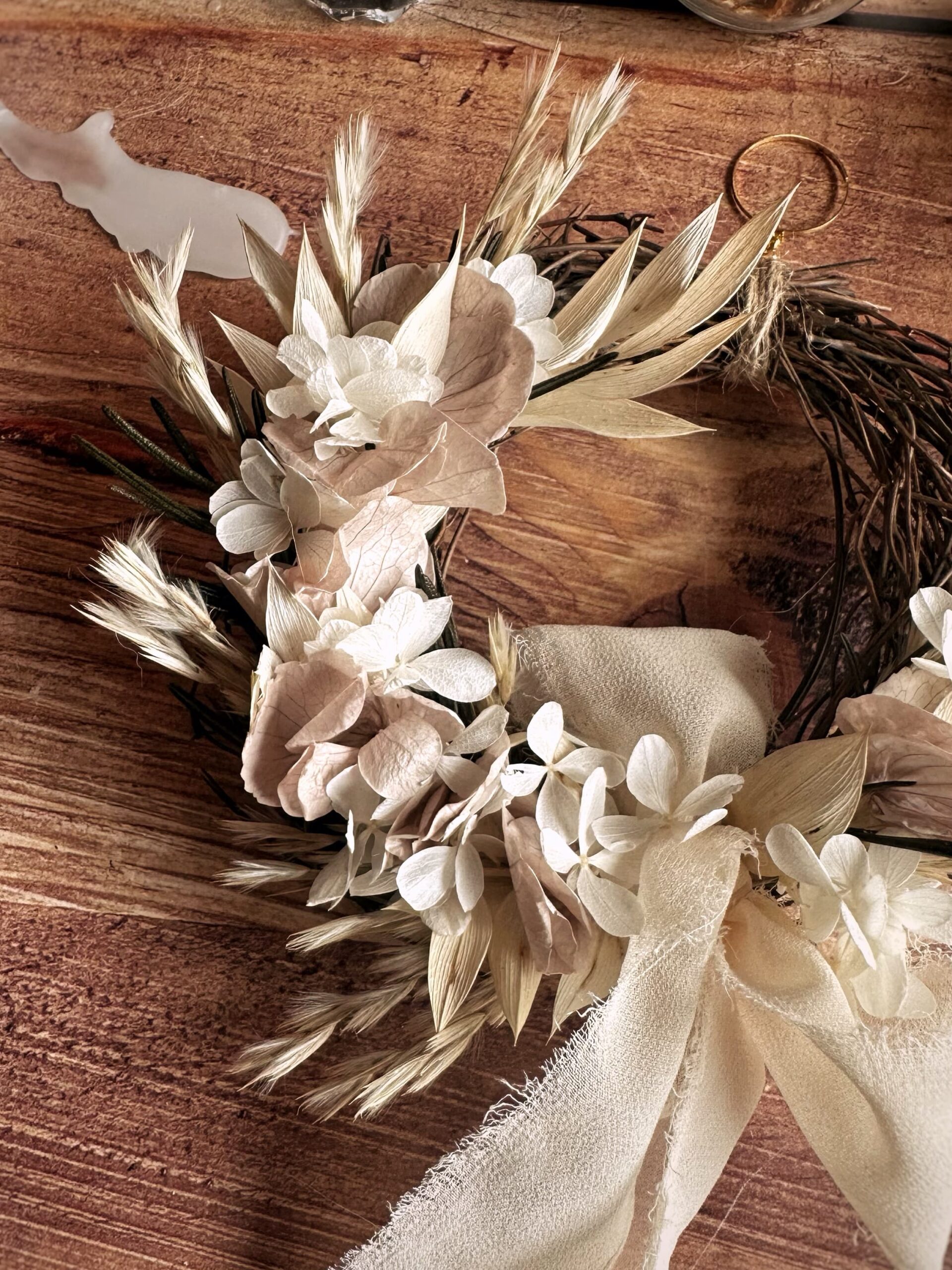 Création unique en fleurs séchées et stabilisées, réalisée à l’instinct.