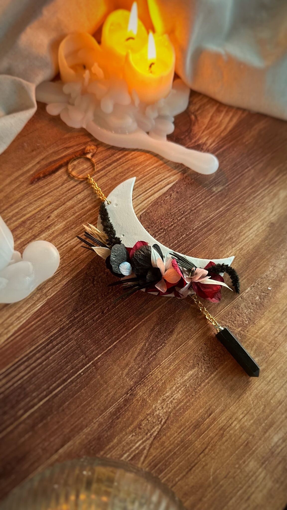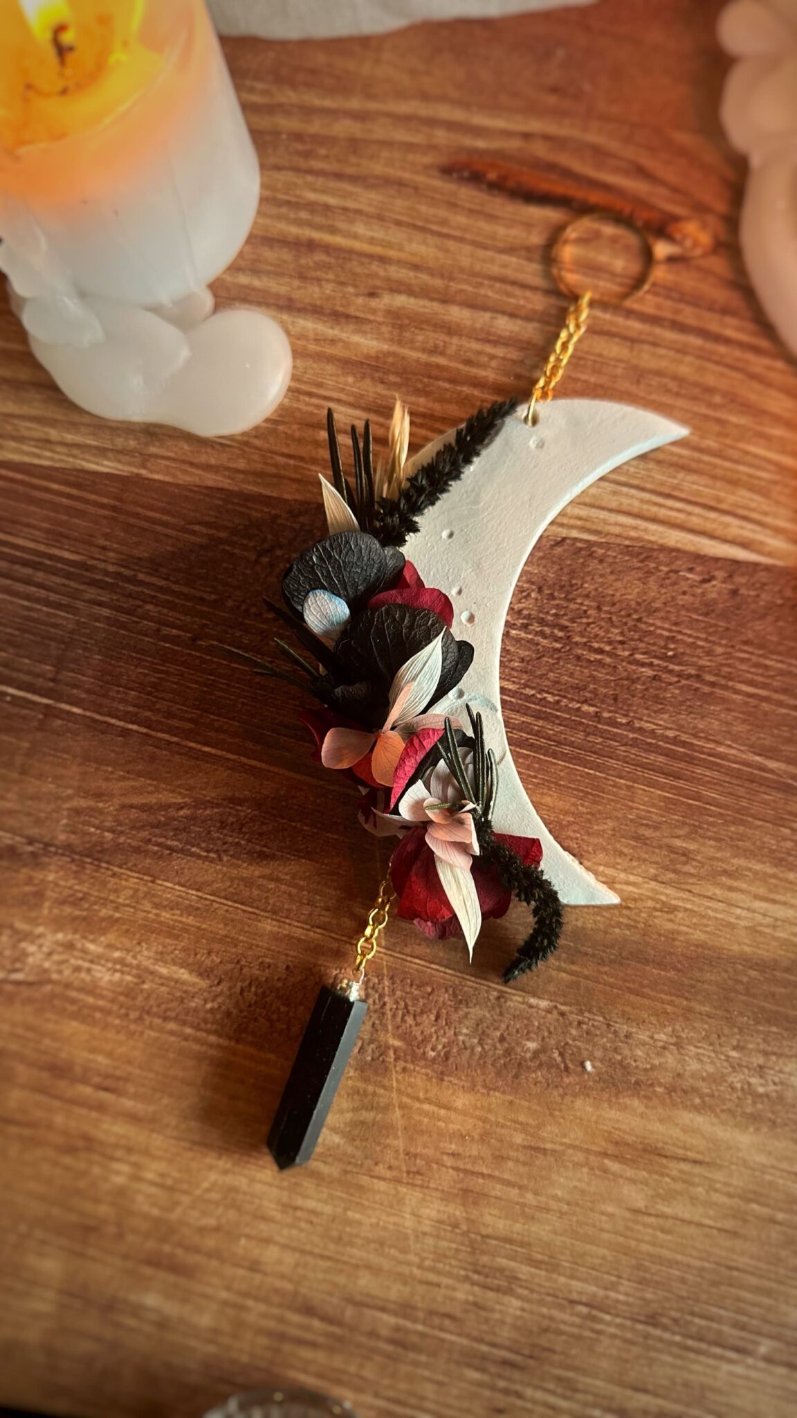 Un croissant de lune en argile auto-durcissante, orné de fleurs séchées et stabilisées dans des nuances de rose, de bordeaux et de noir, qui évoquent la profondeur des émotions et la beauté du silence intérieur.