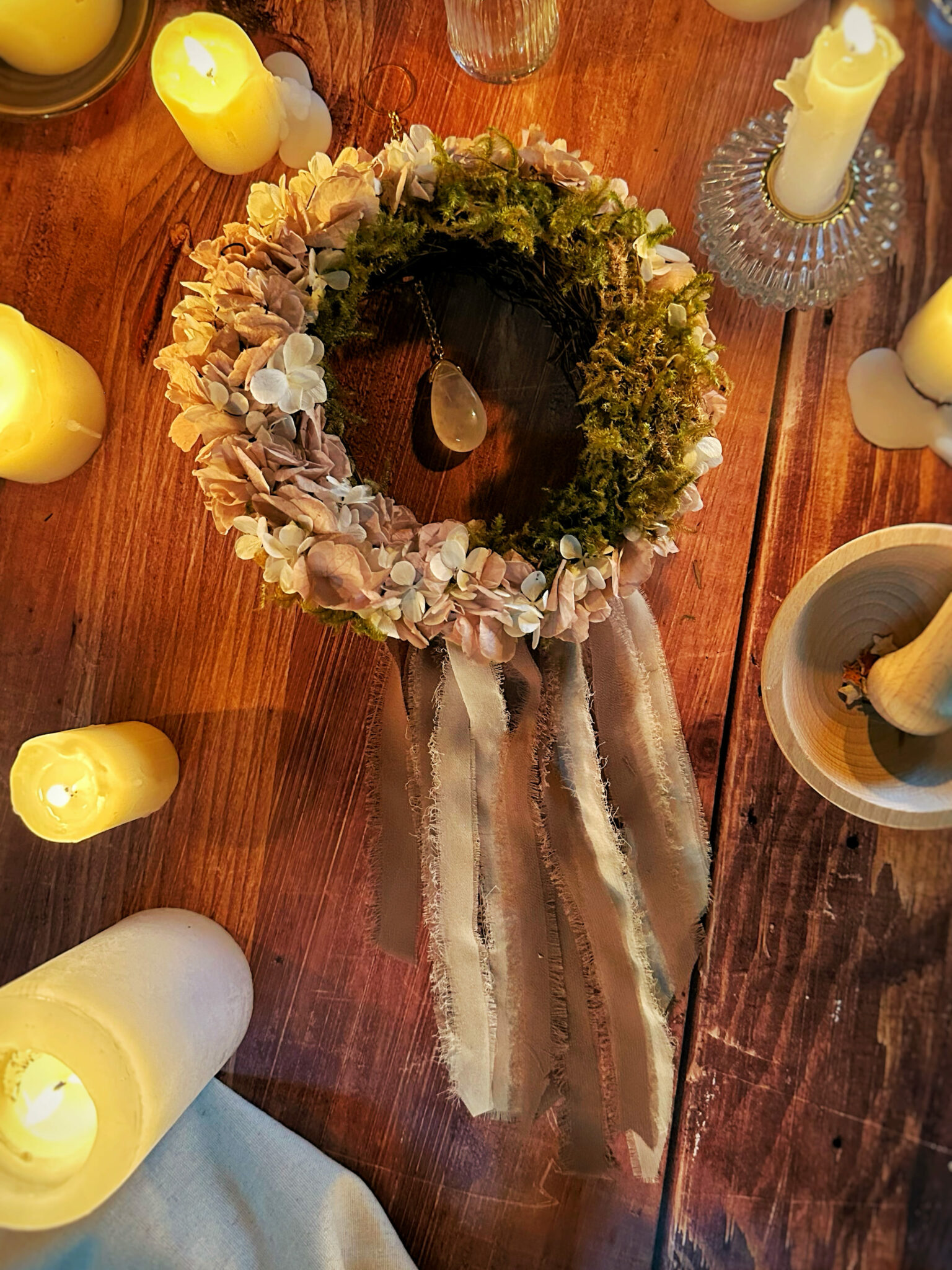 Une couronne ronde en tiges de Muehlenbeckia entièrement réalisée à la main, et poétiquement recouverte de fleurs séchées et stabilisées par mes soins.