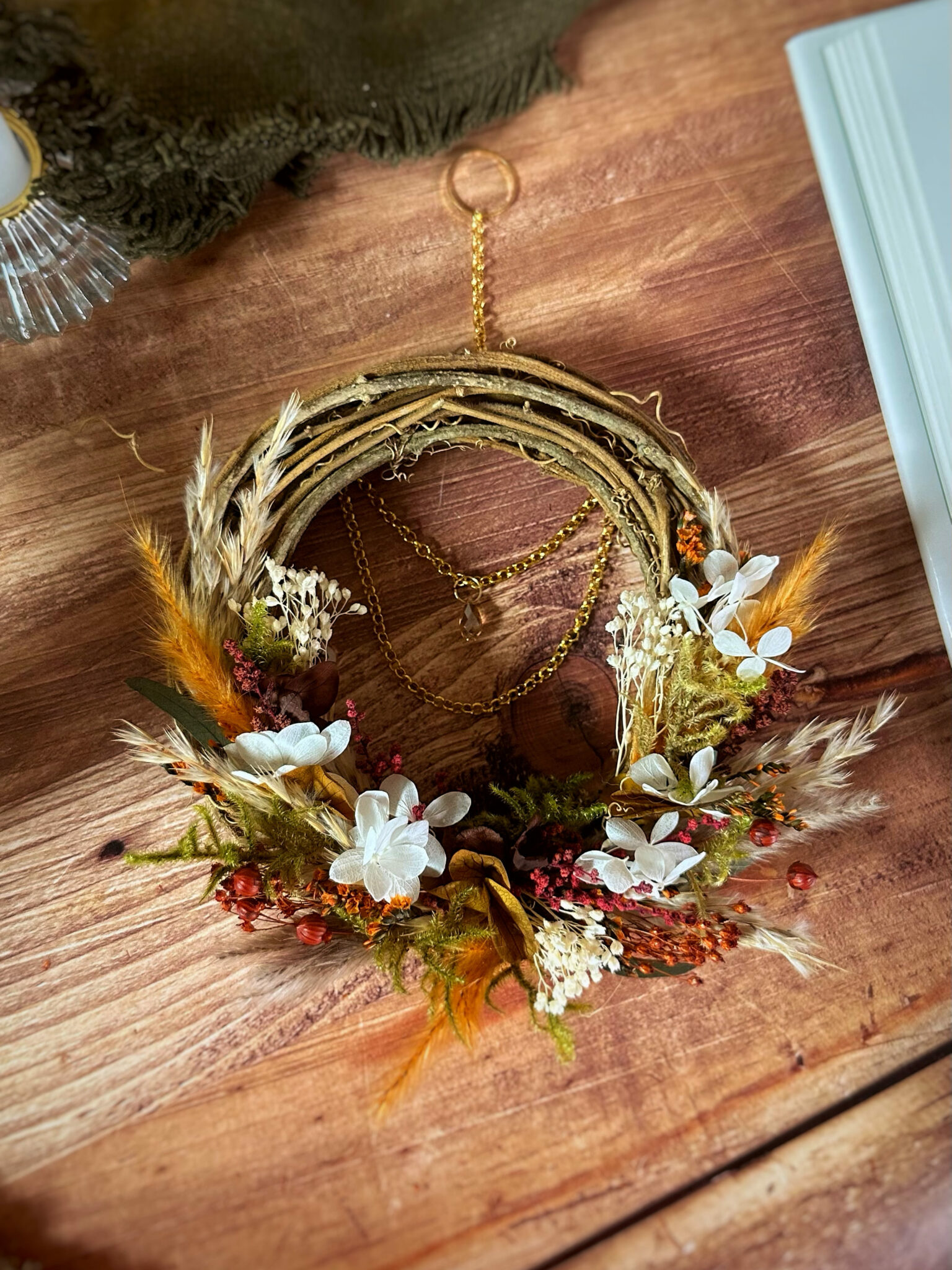 Une couronne en vigne, ornée de fleurs séchées et stabilisées, inspirée par l’énergie brute et libre de la forêt.