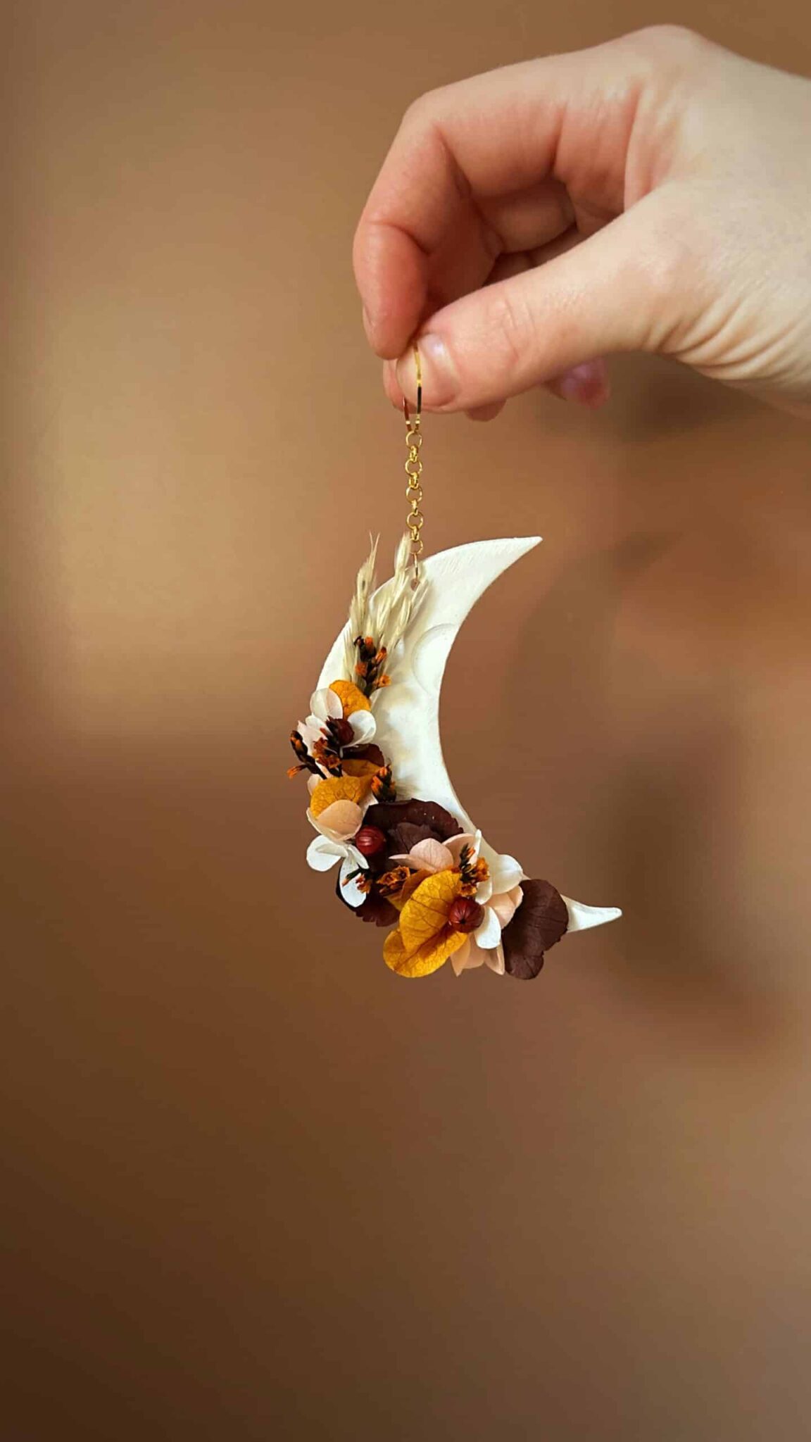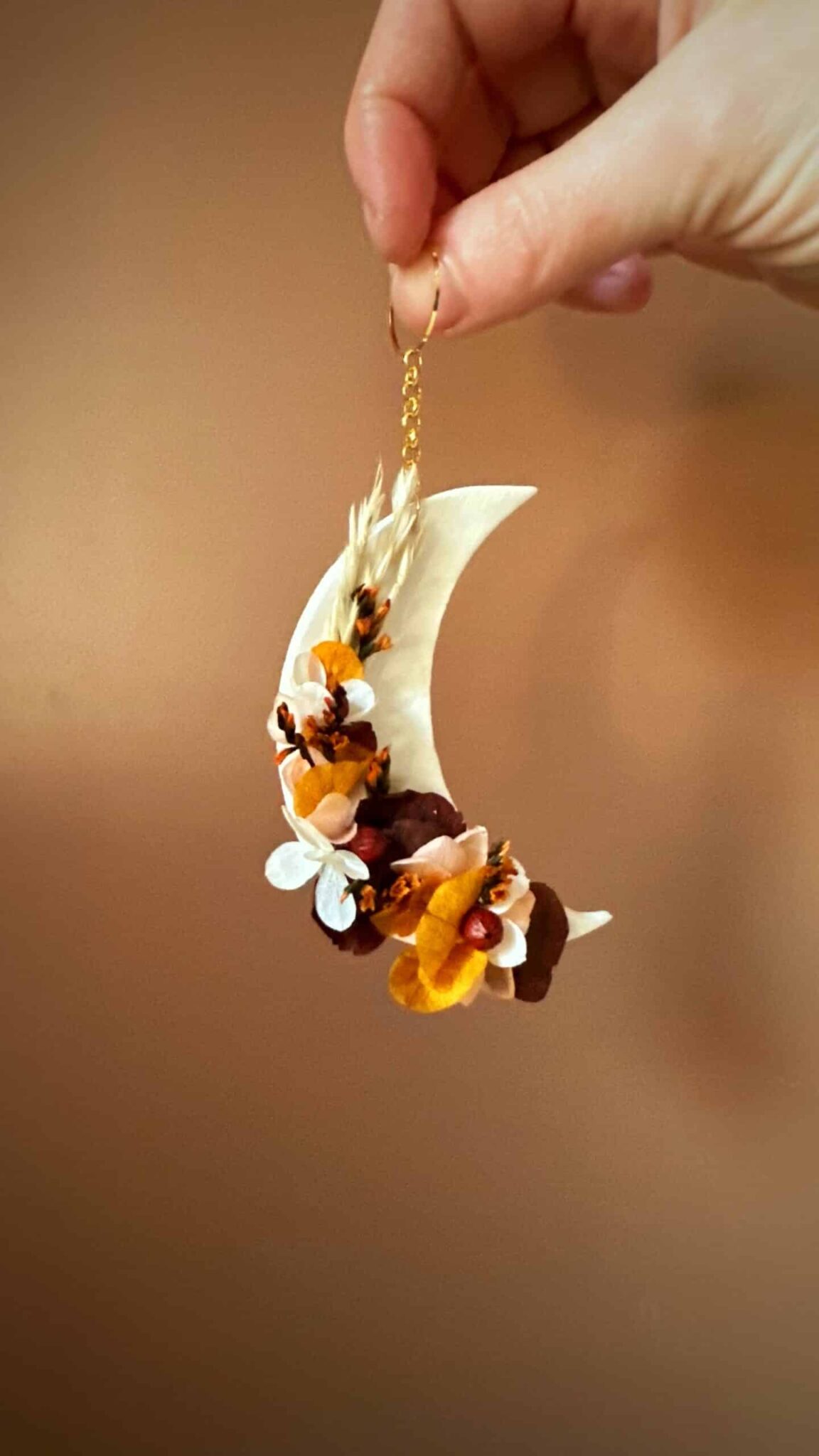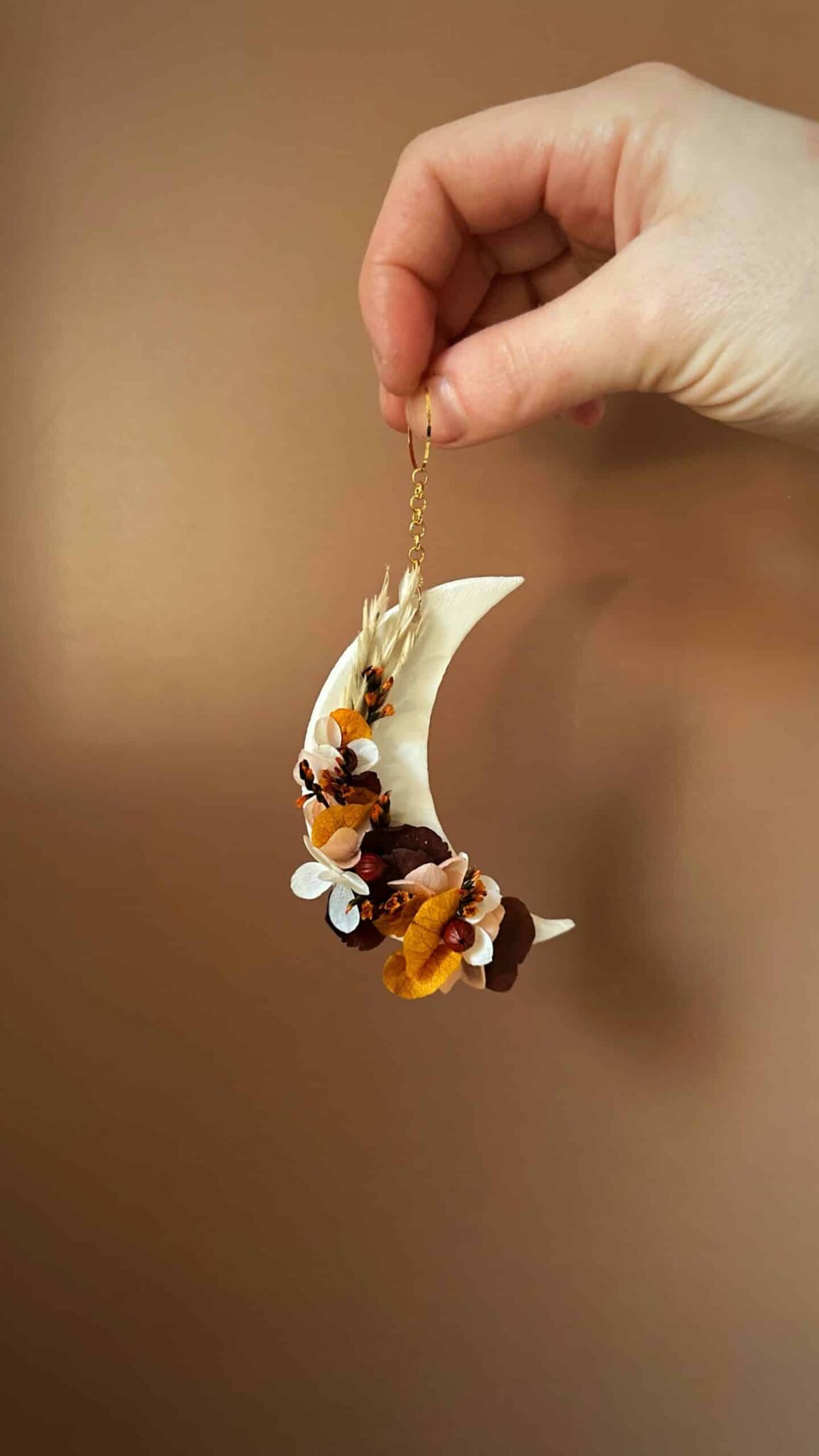 Feu intérieur – Suspension demi lune – Thème RENOUVEAU – Argile et fleurs séchée