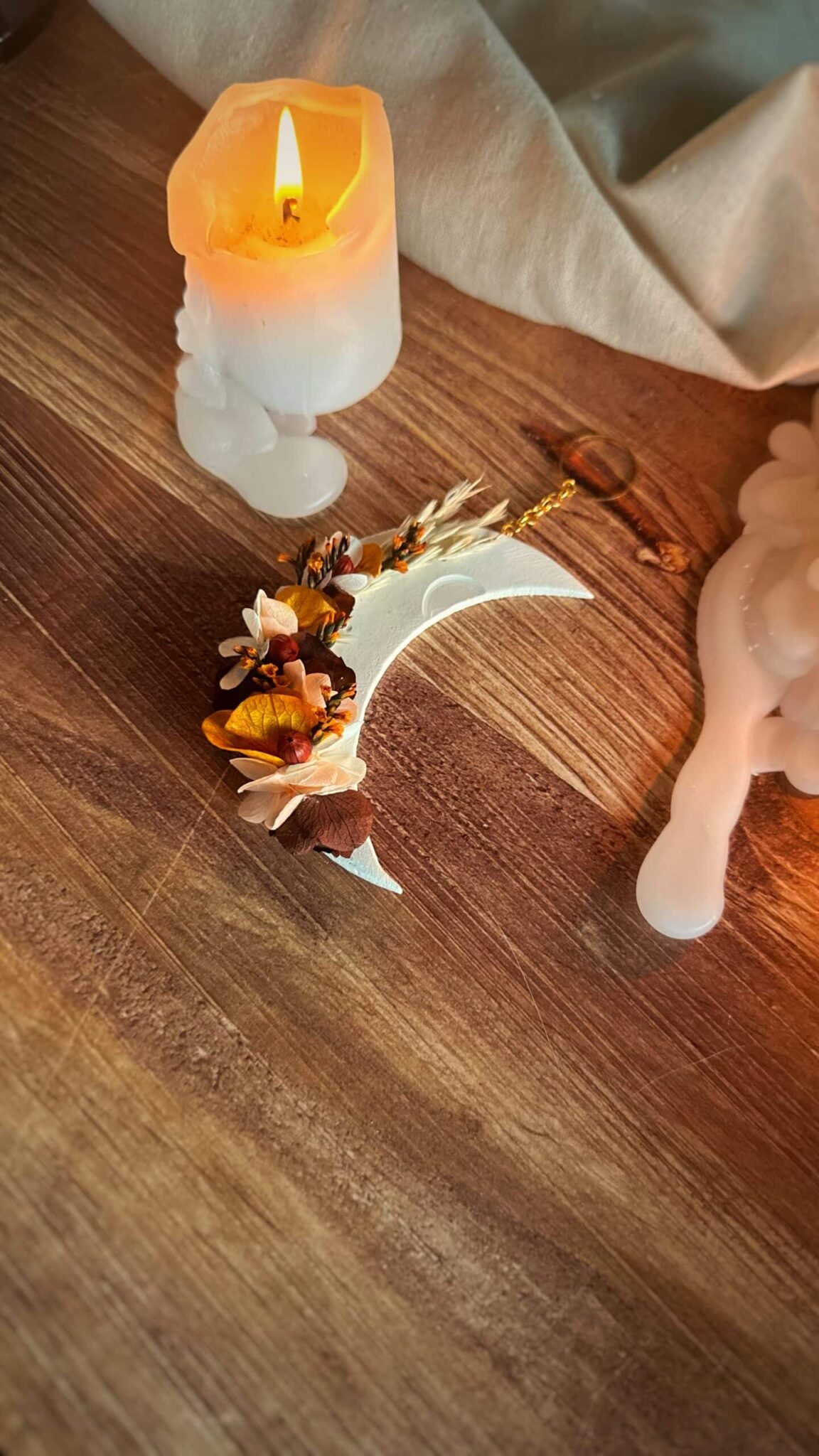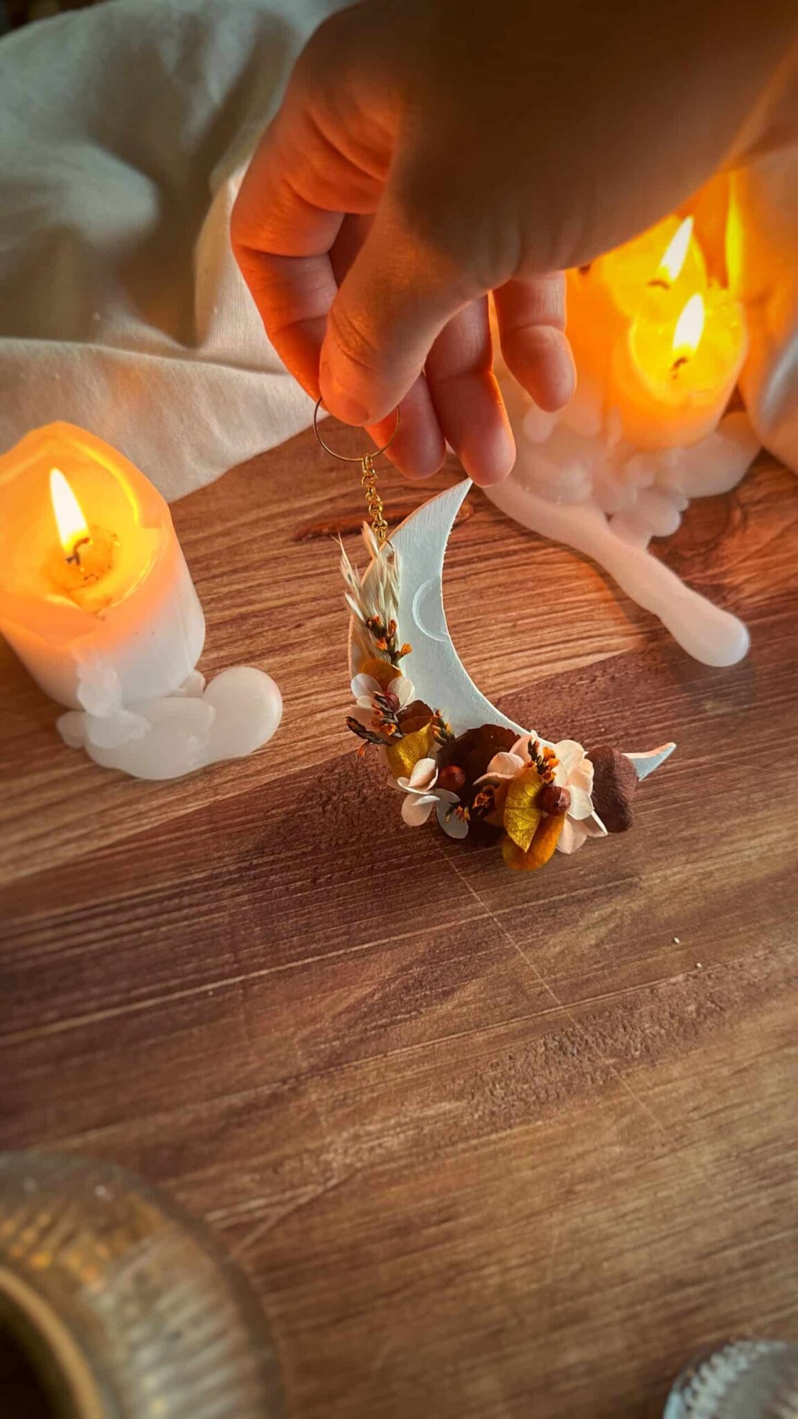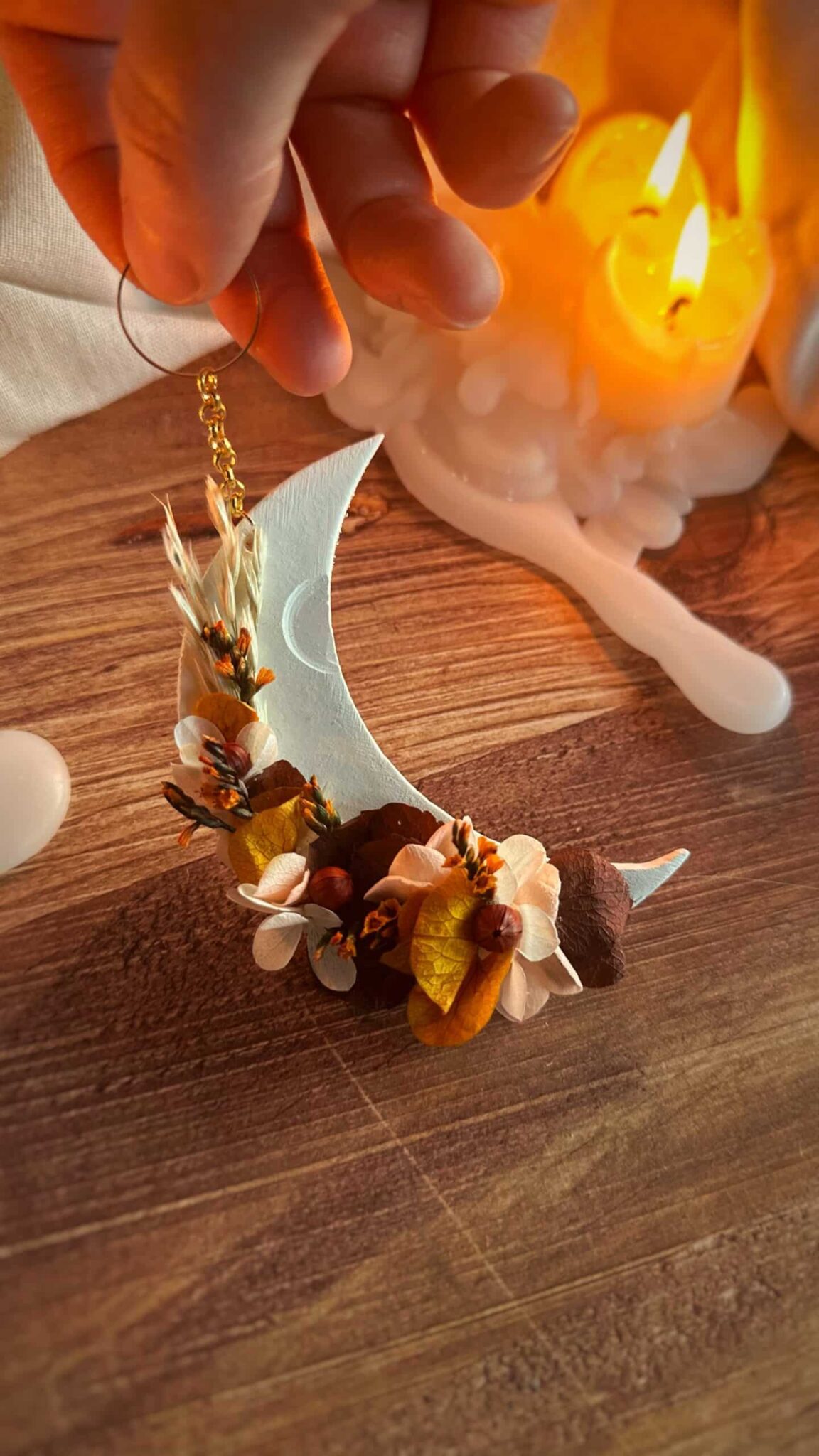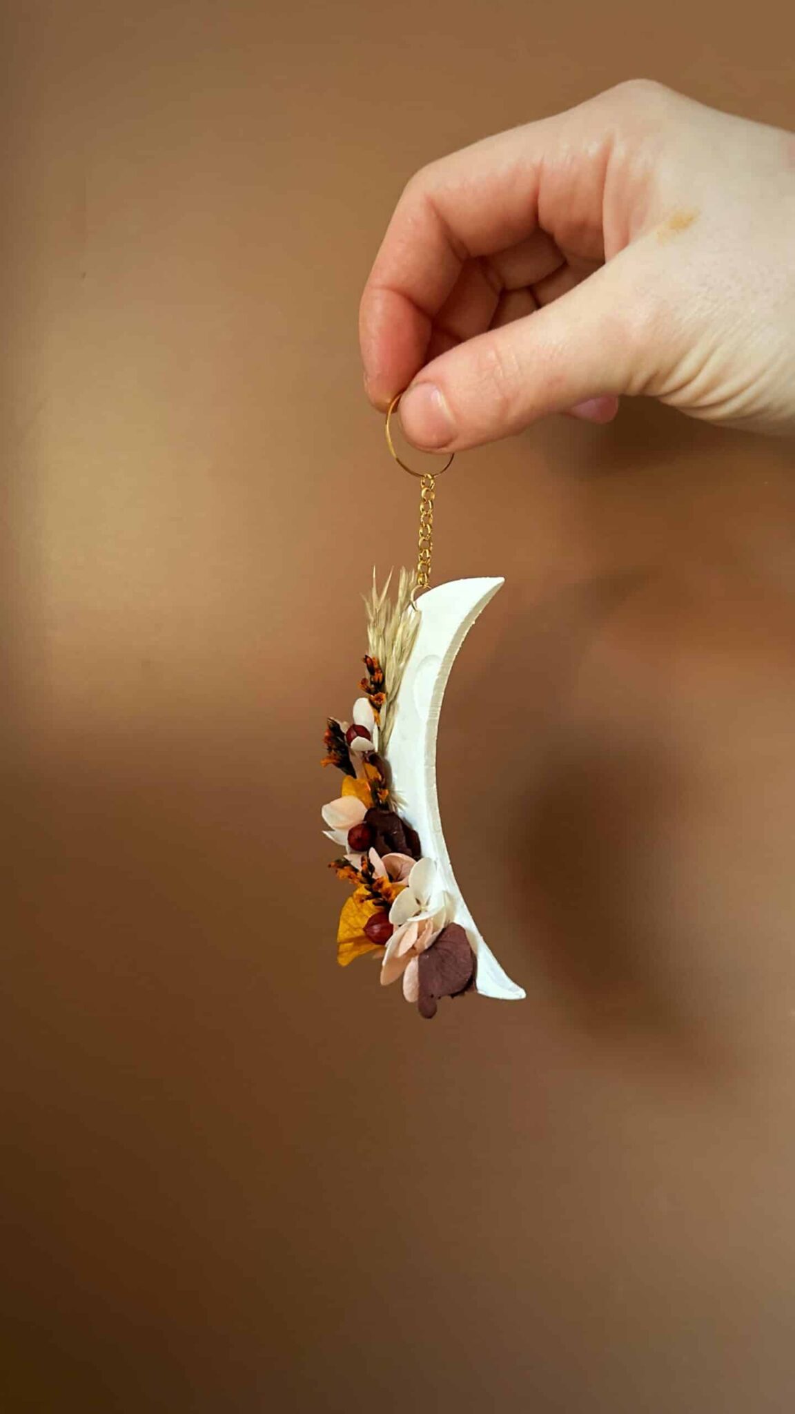 Feu intérieur – Suspension demi lune – Thème RENOUVEAU – Argile et fleurs séchée