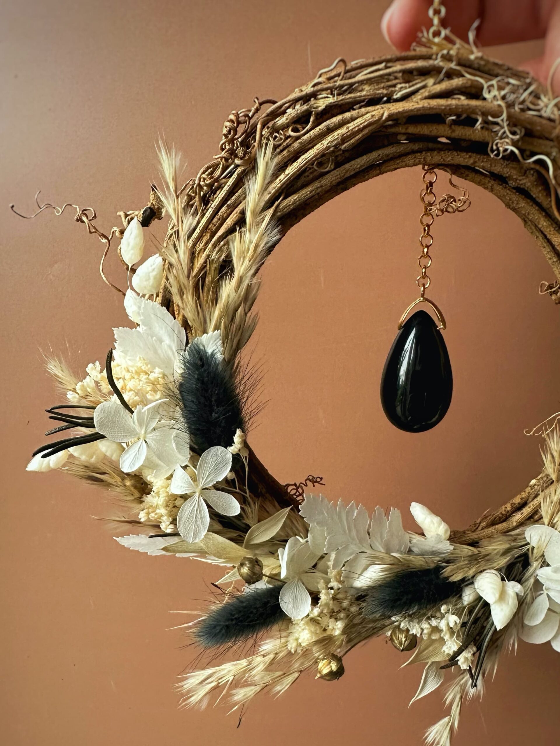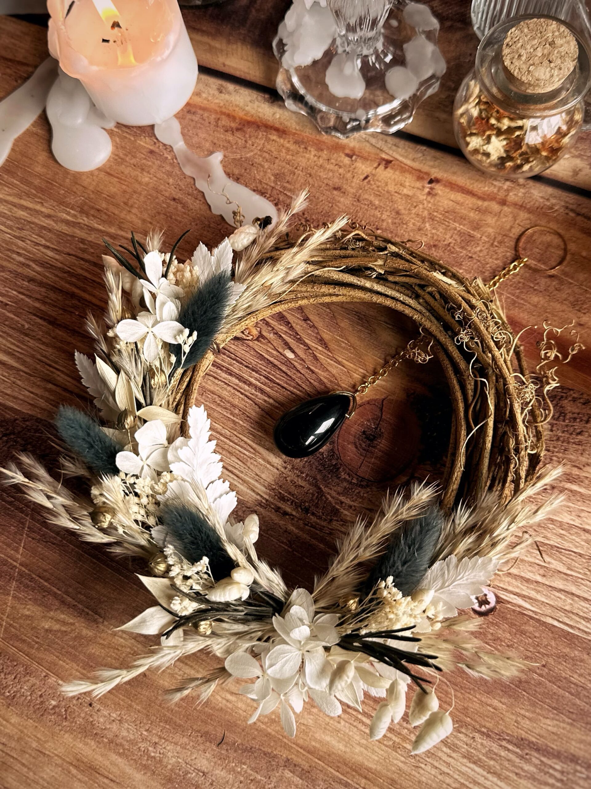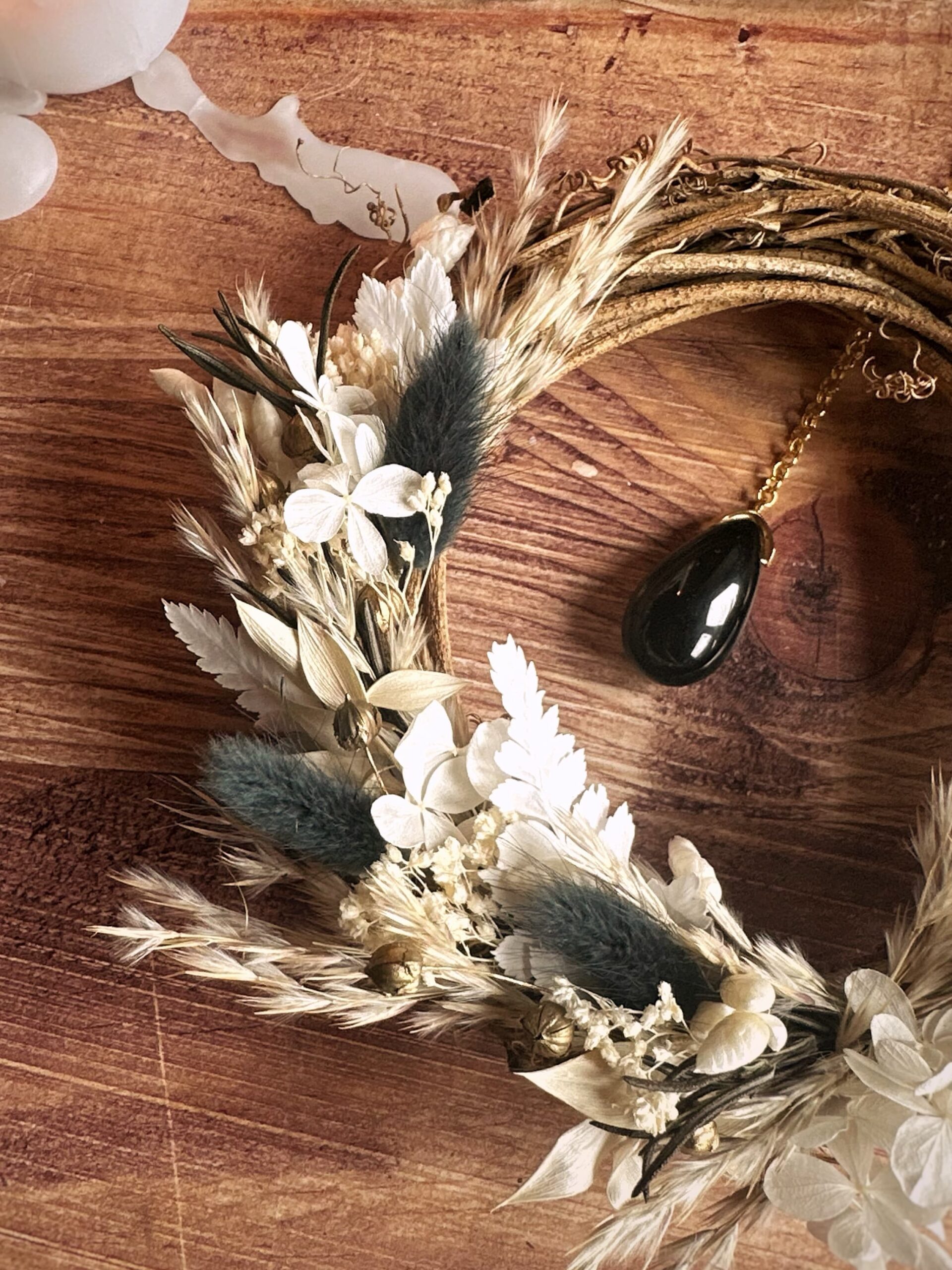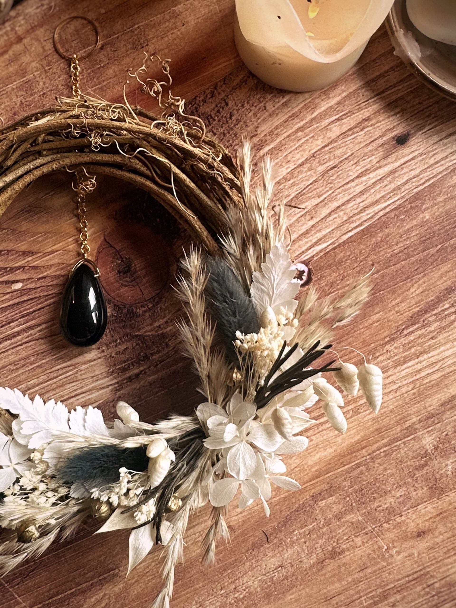 Obscur – Couronne en fleurs séchées et stabilisées et vigne