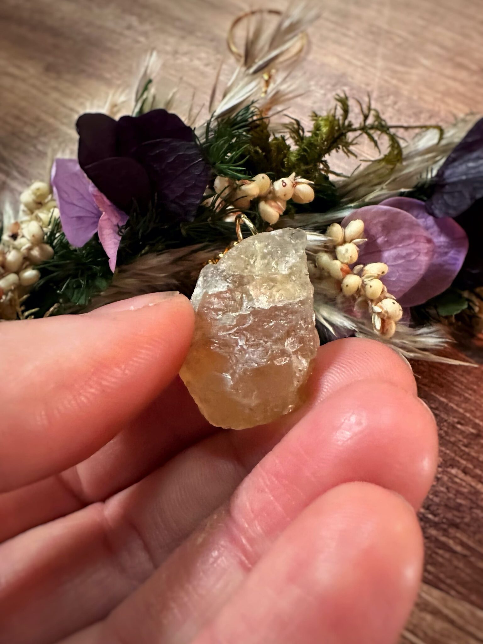 • Matériaux : Fleurs séchées et stabilisées, pierre de citrine, petit anneau en métal doré pour pouvoir l’accrocher au mur.