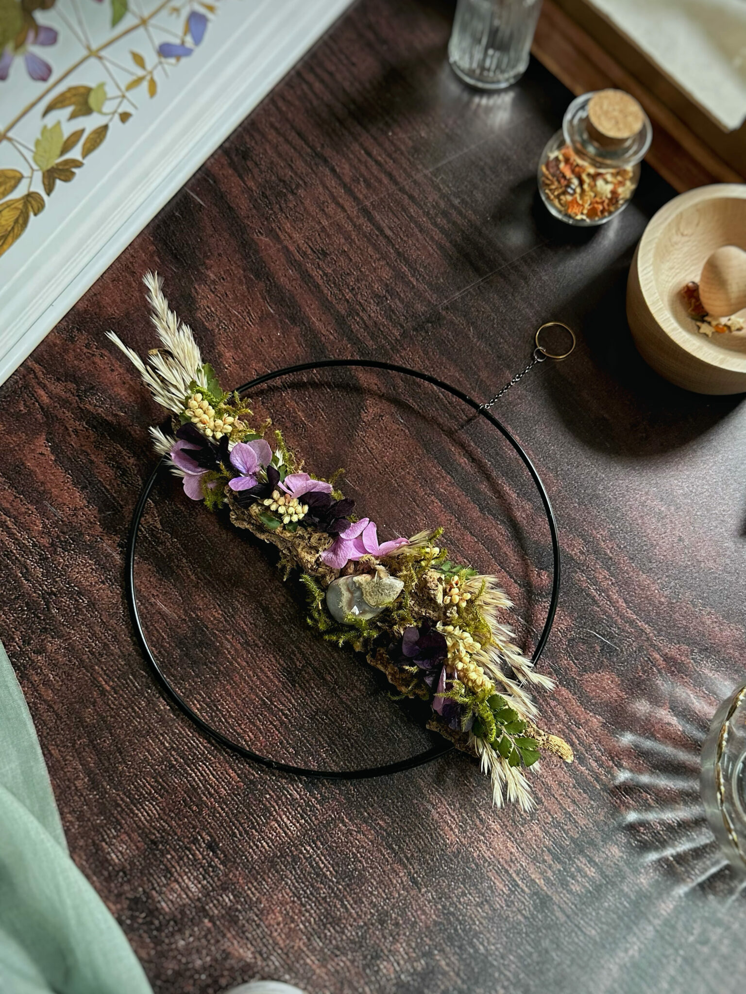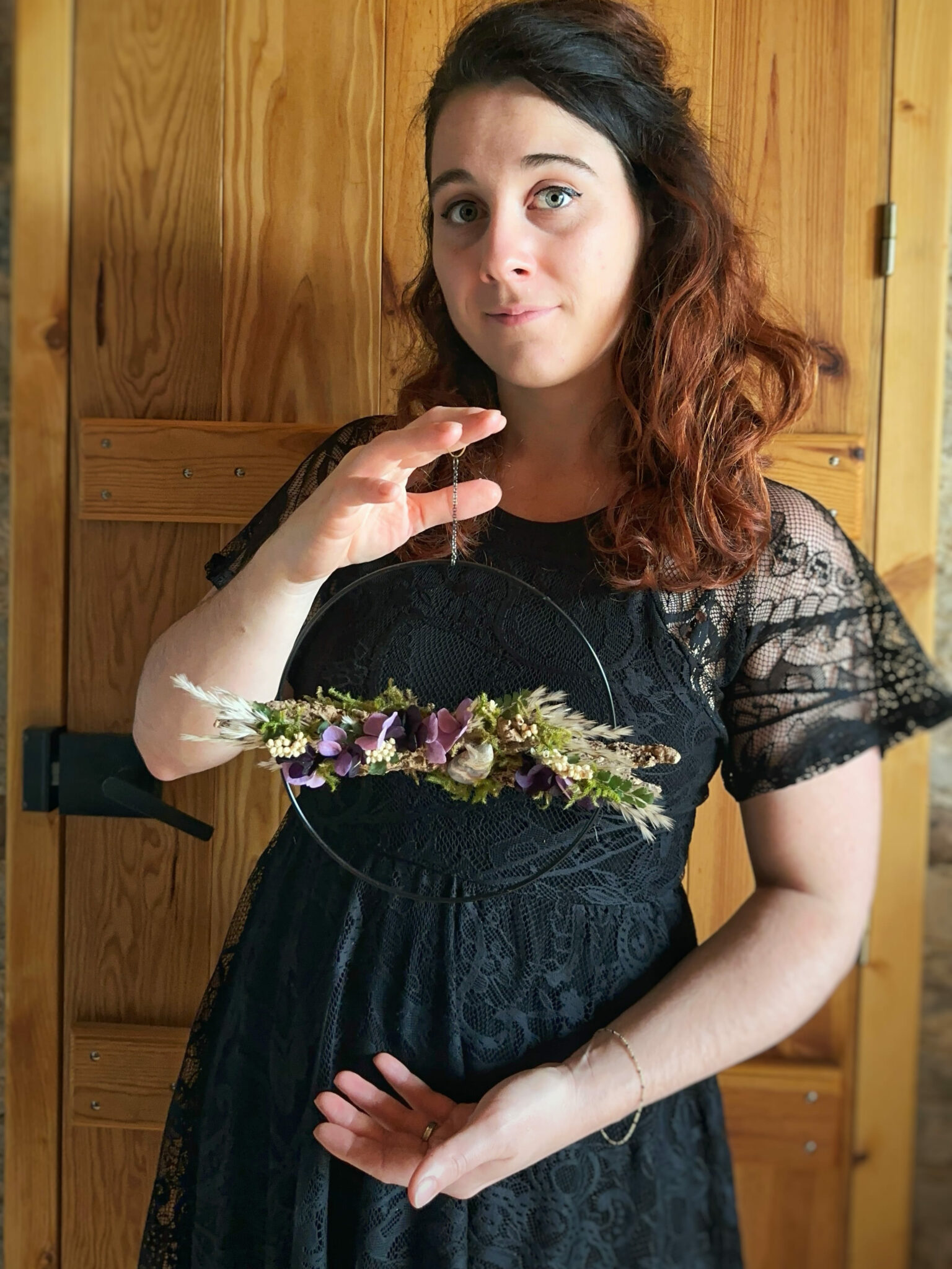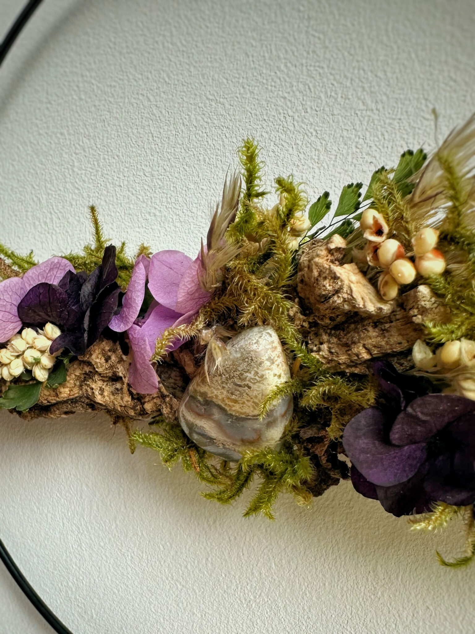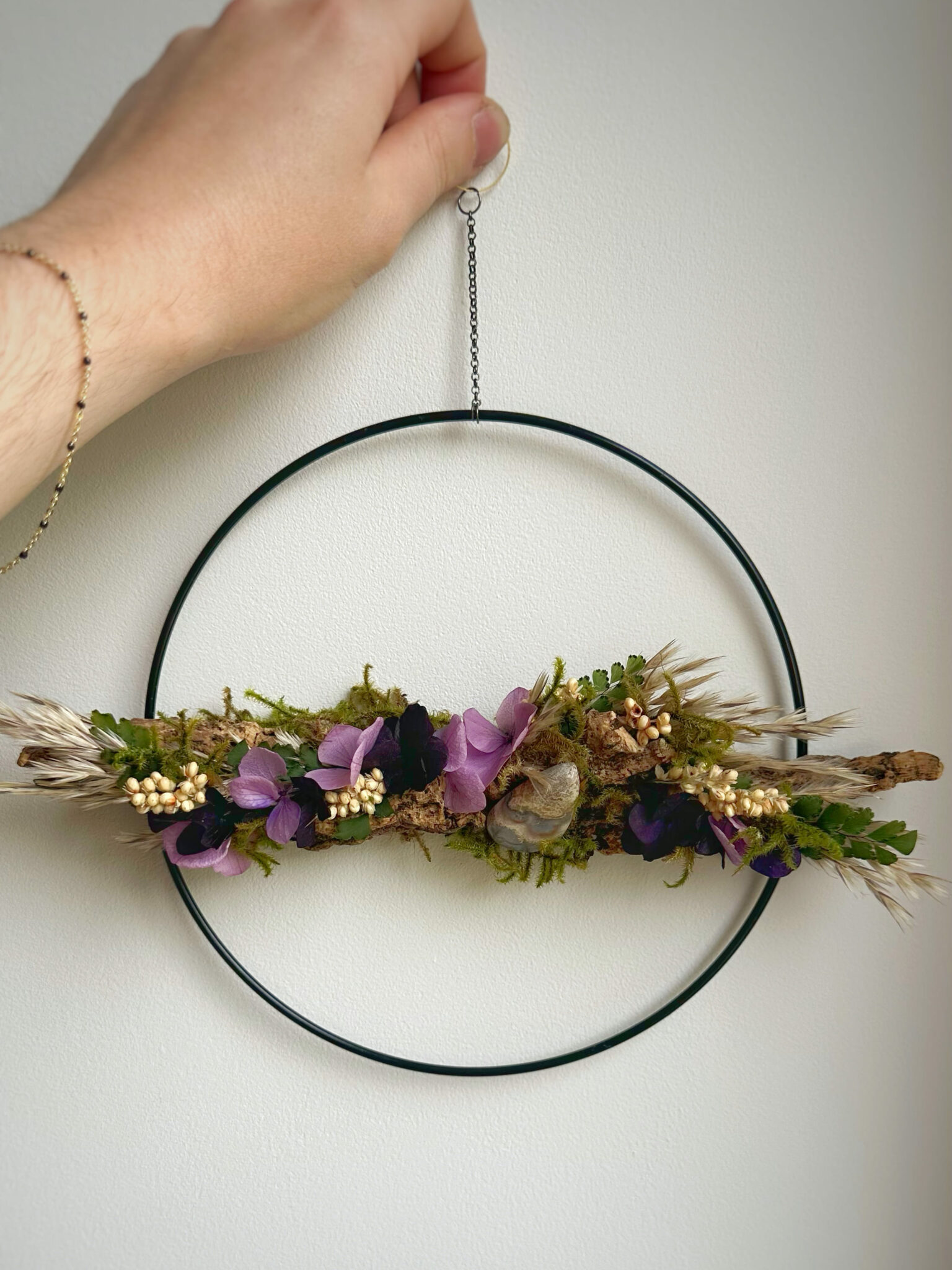 • Matériaux : Fleurs séchées et stabilisées, Agate taillée en goutte, petits anneaux et chaîne en métal doré pour pouvoir l’accrocher au mur.