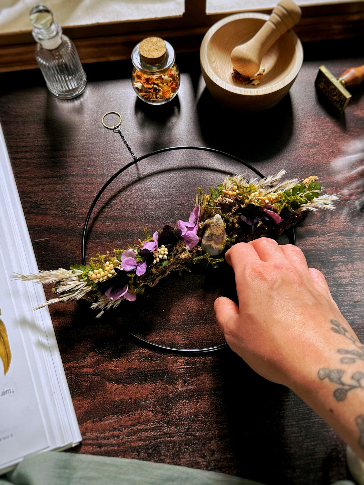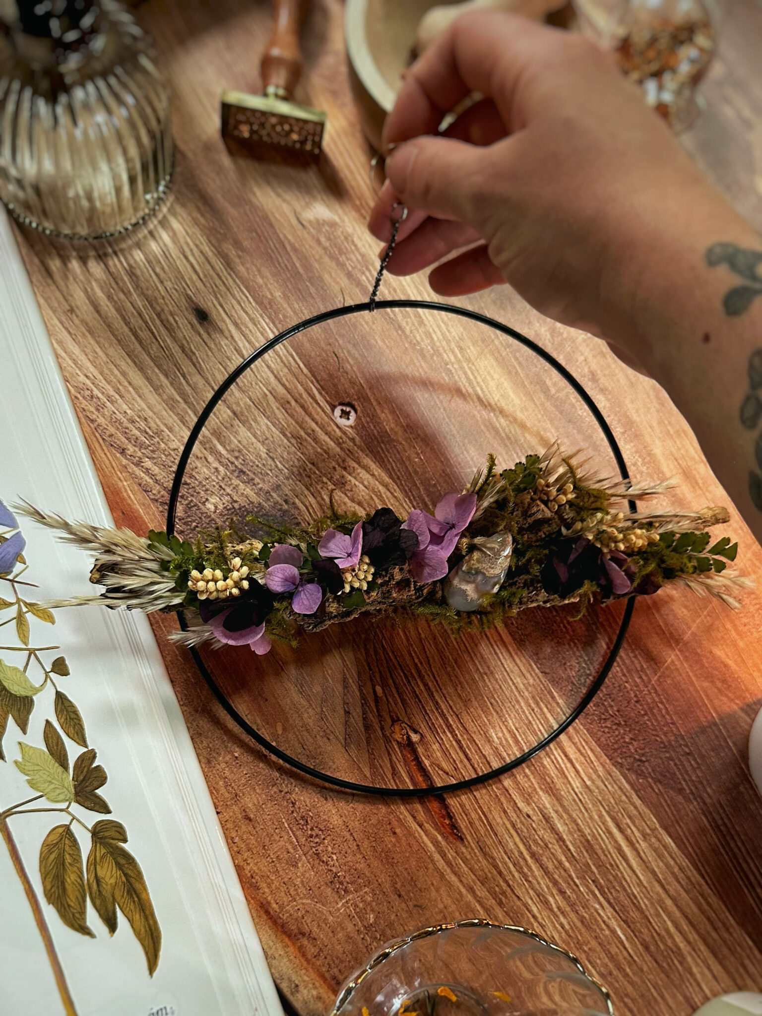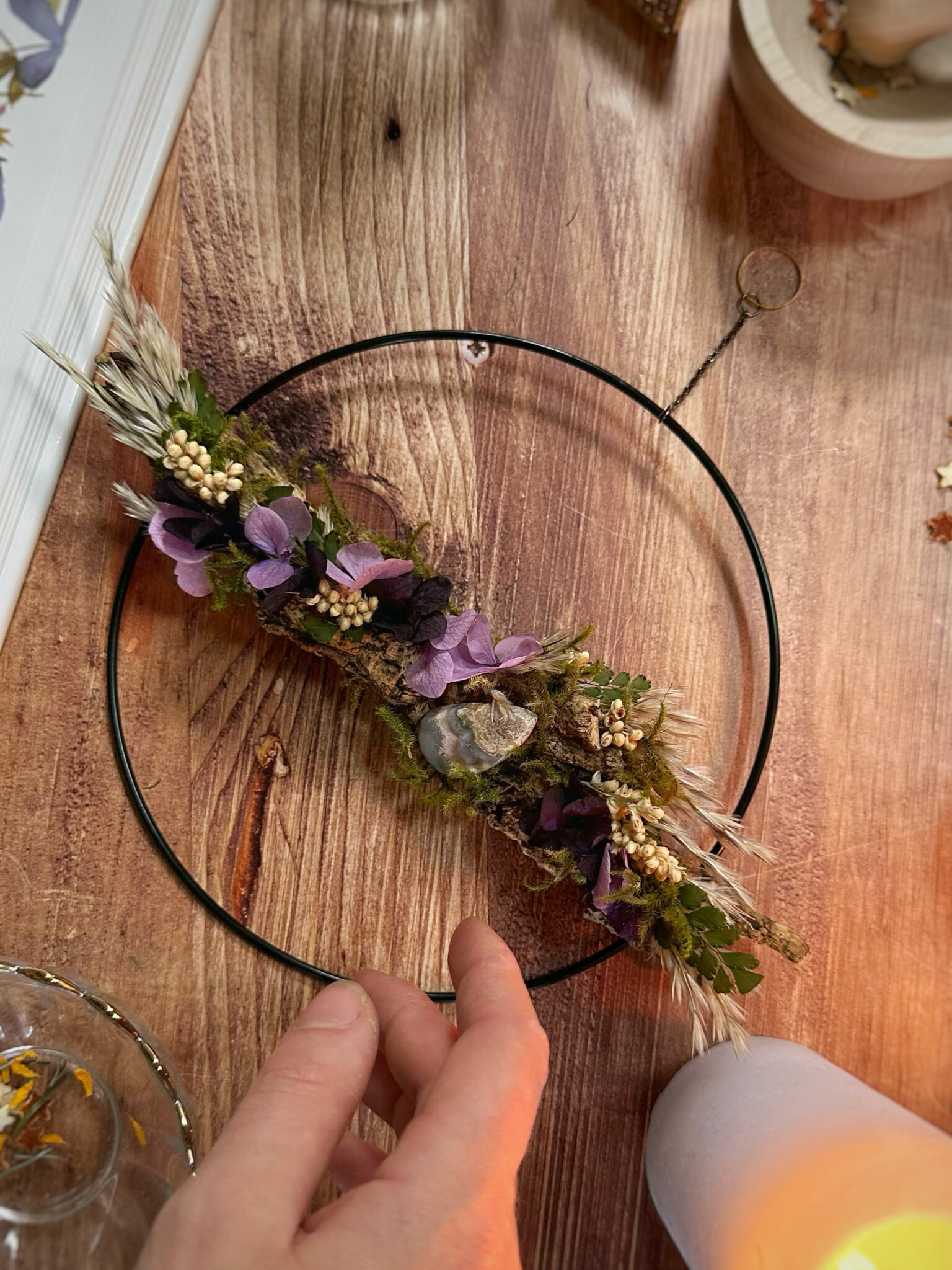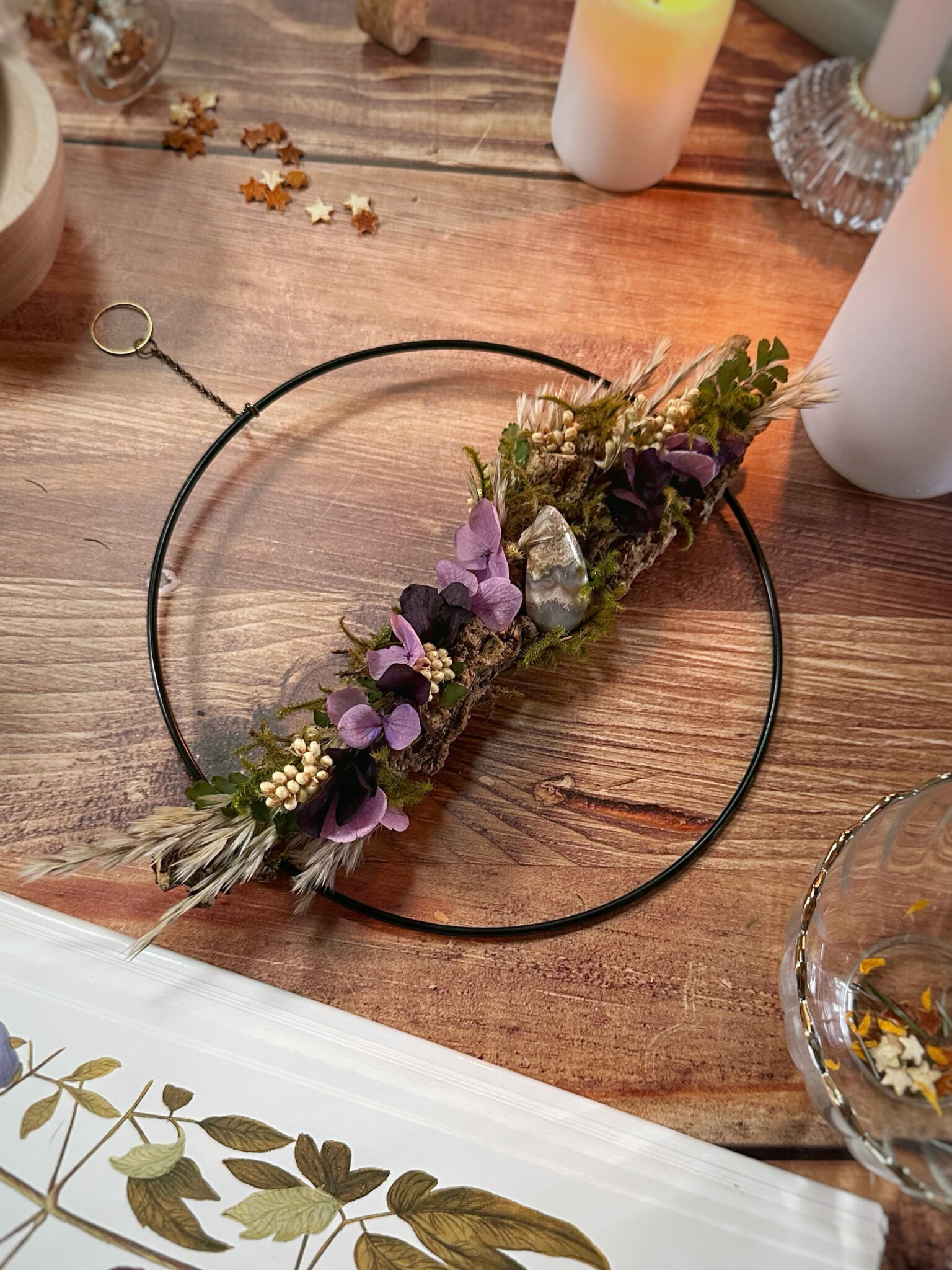 • Matériaux : Fleurs séchées et stabilisées, Agate taillée en goutte, petits anneaux et chaîne en métal doré pour pouvoir l’accrocher au mur.