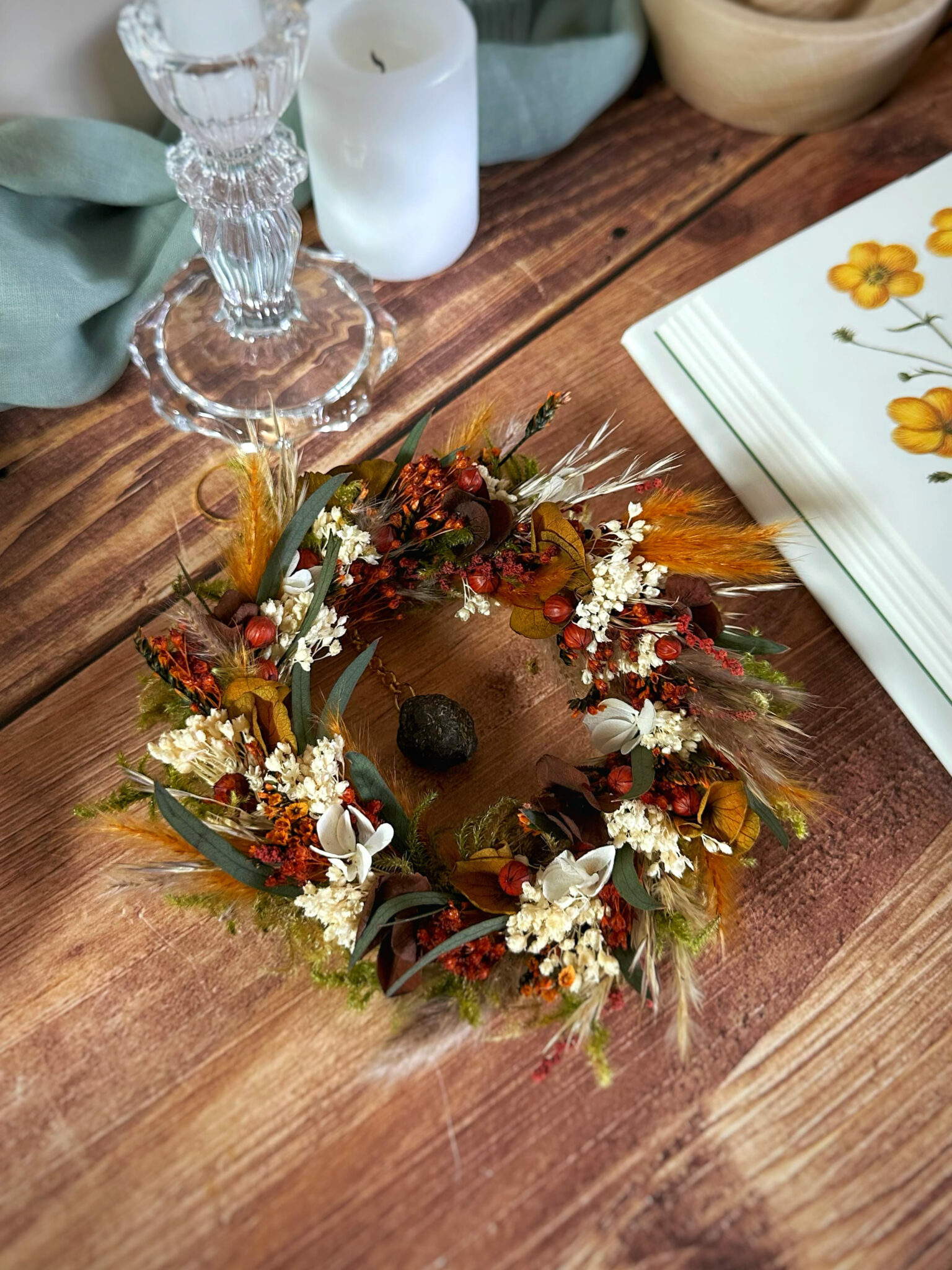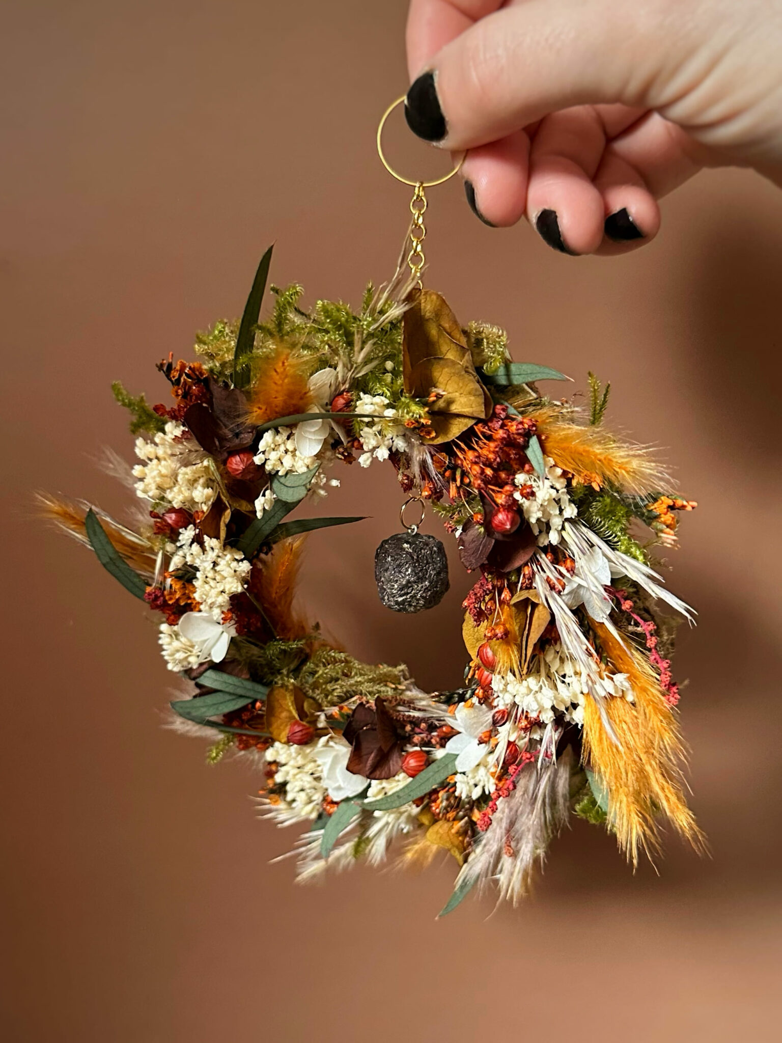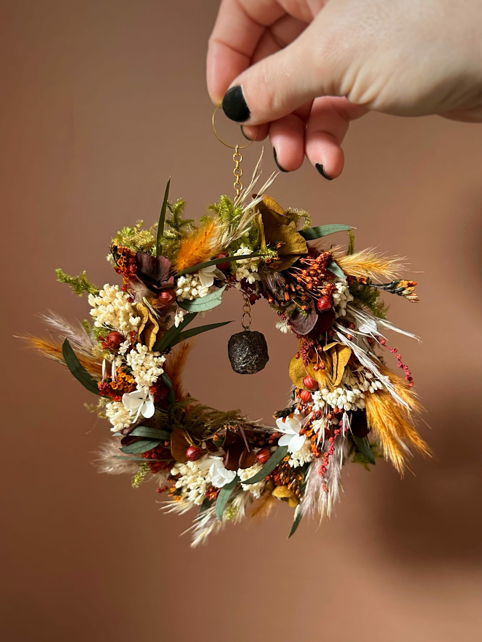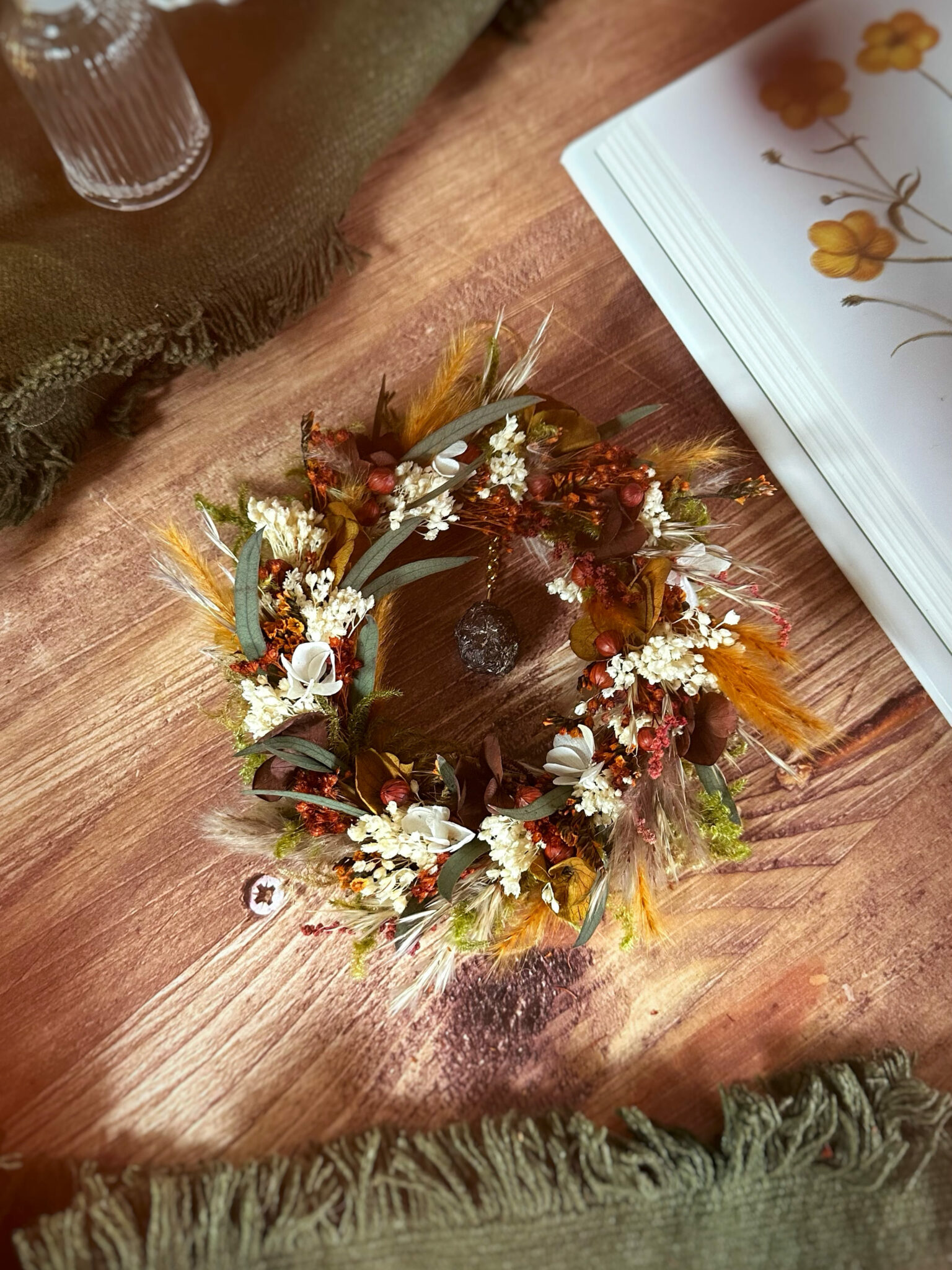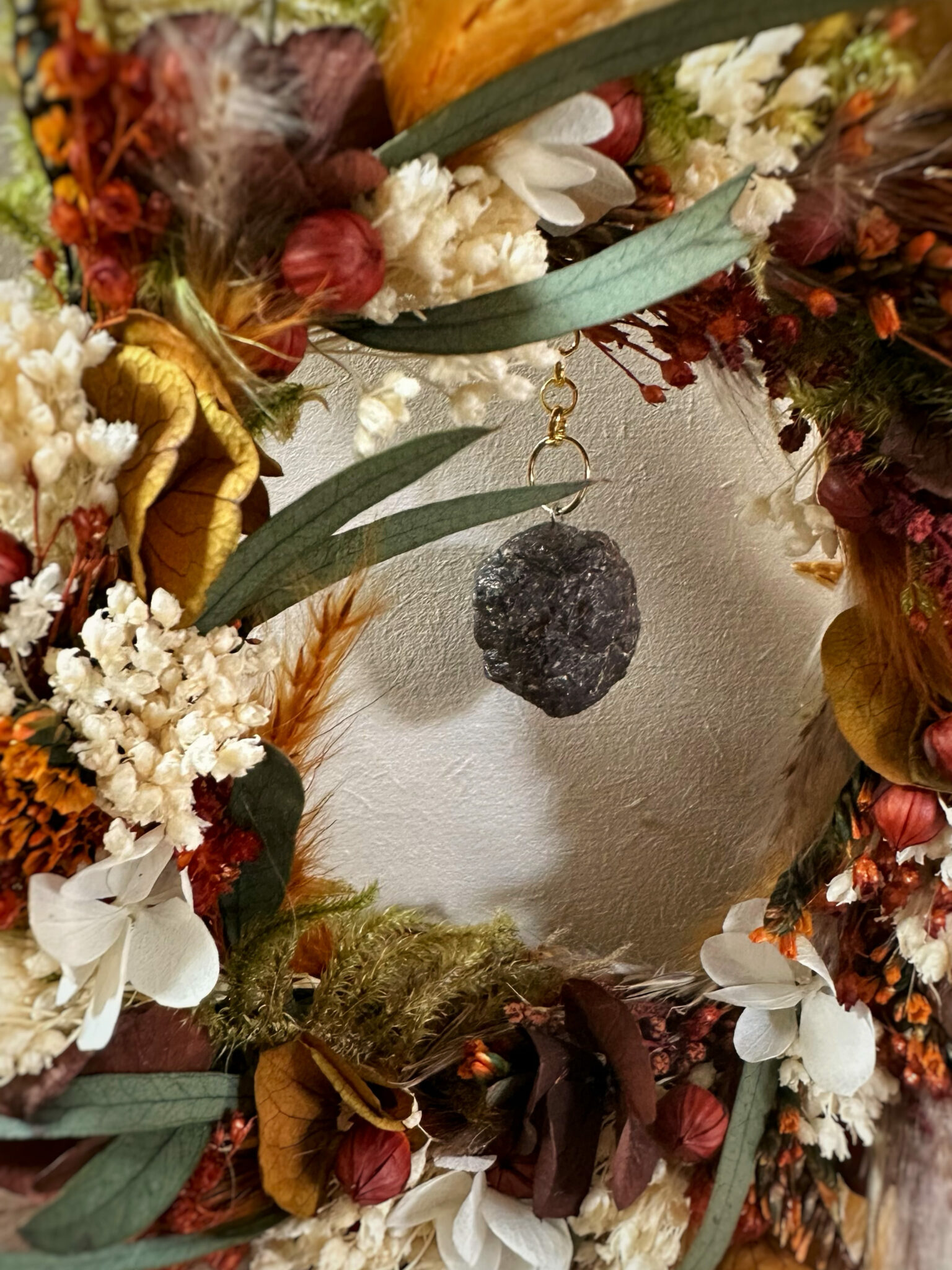 Une couronne ronde entièrement recouverte de fleurs séchées et stabilisées, inspirée par la force silencieuse des racines qui ancrent la Terre.