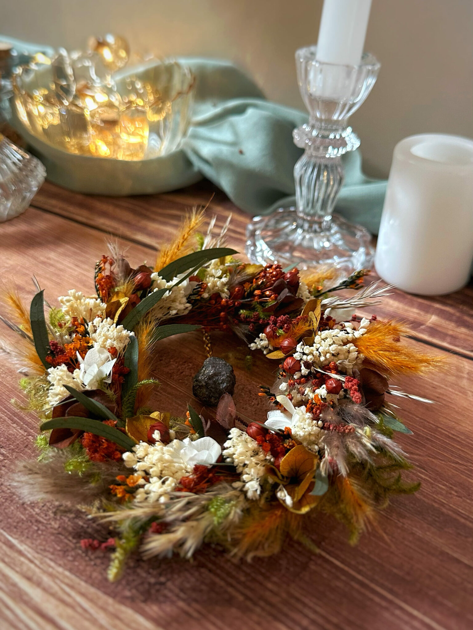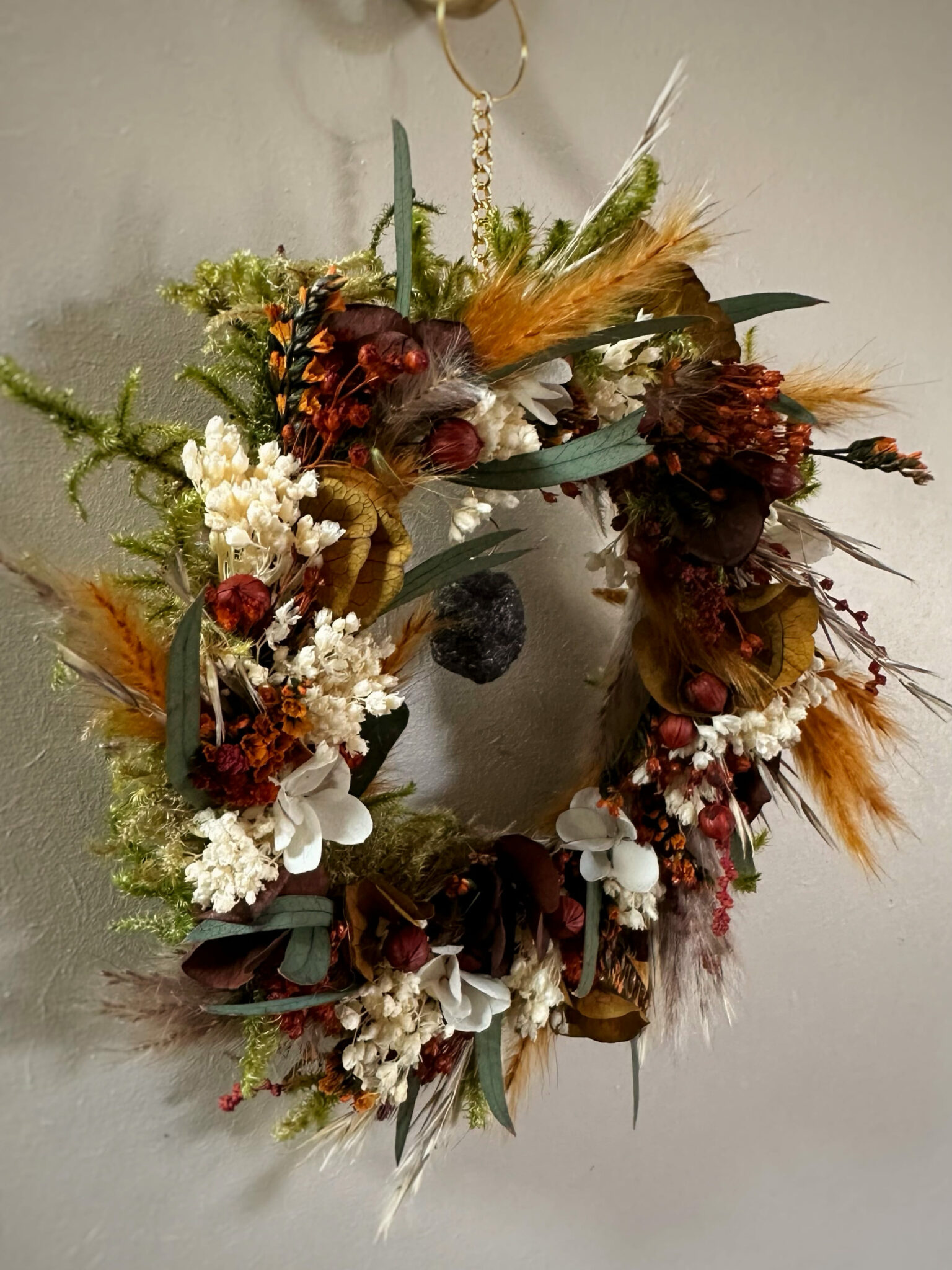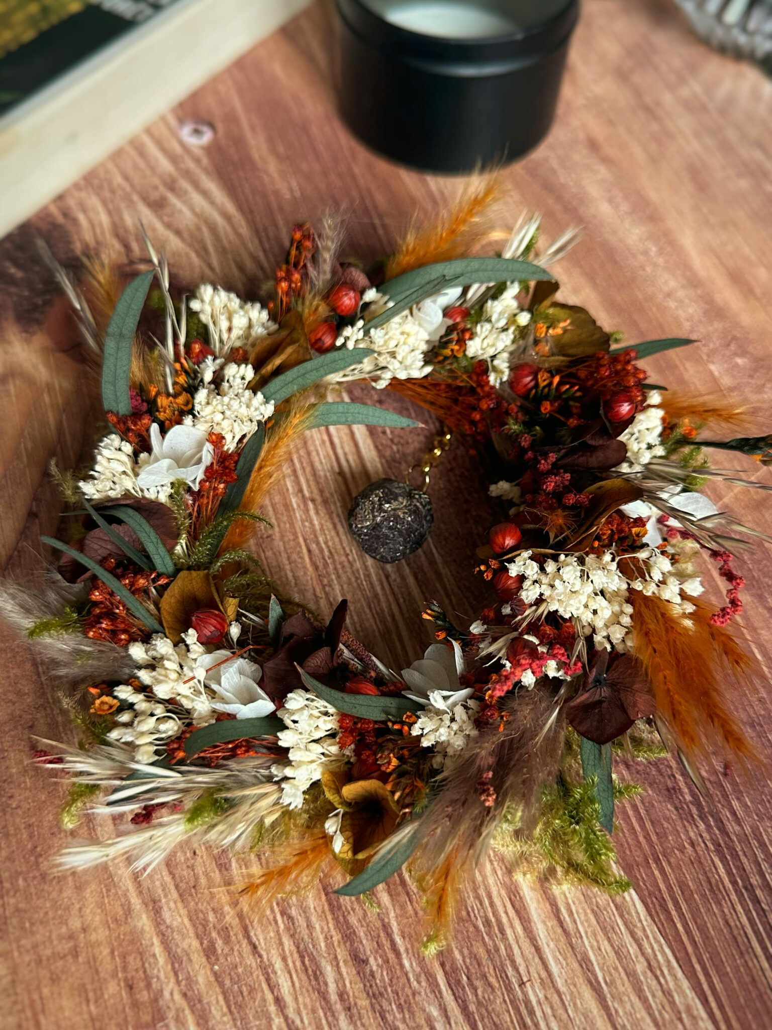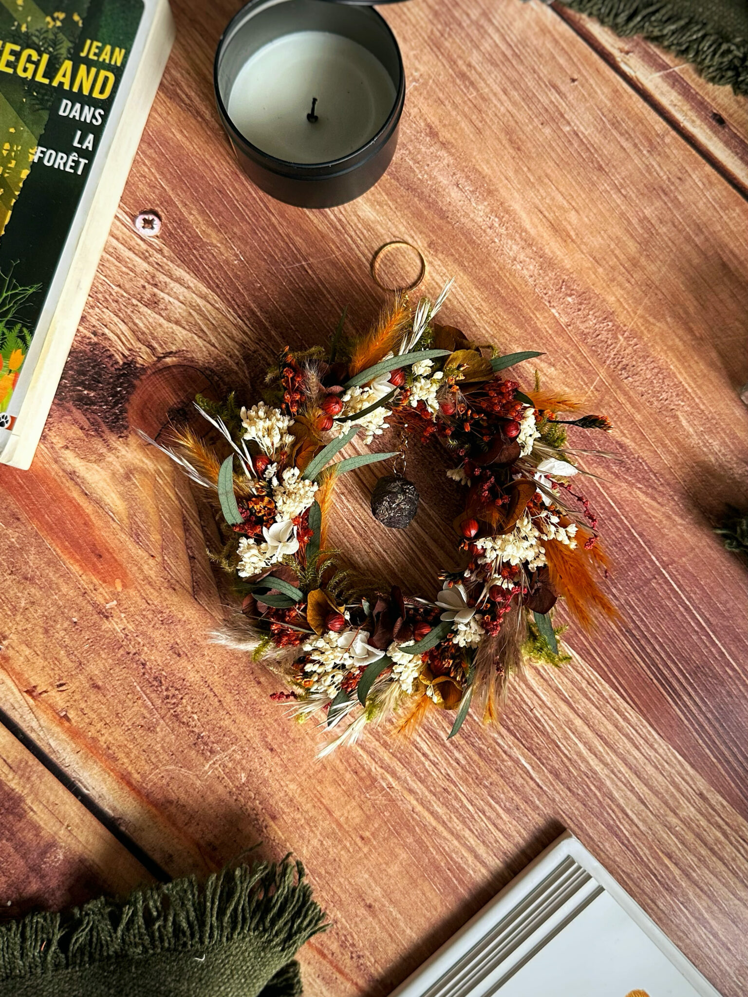 Une couronne ronde entièrement recouverte de fleurs séchées et stabilisées, inspirée par la force silencieuse des racines qui ancrent la Terre.