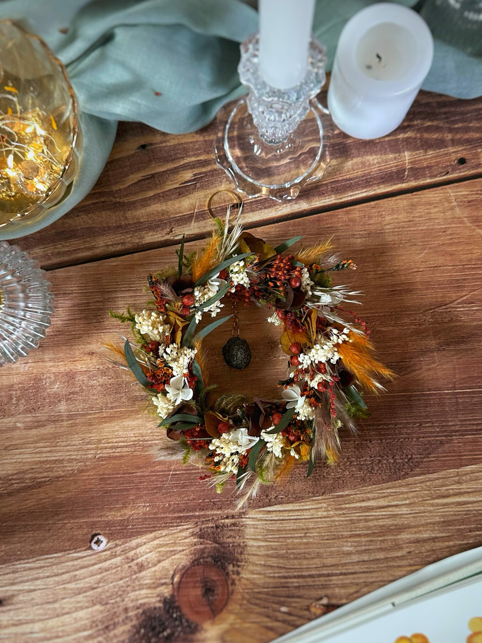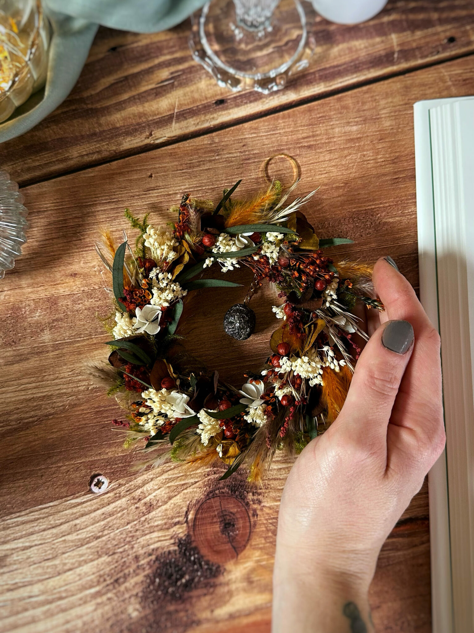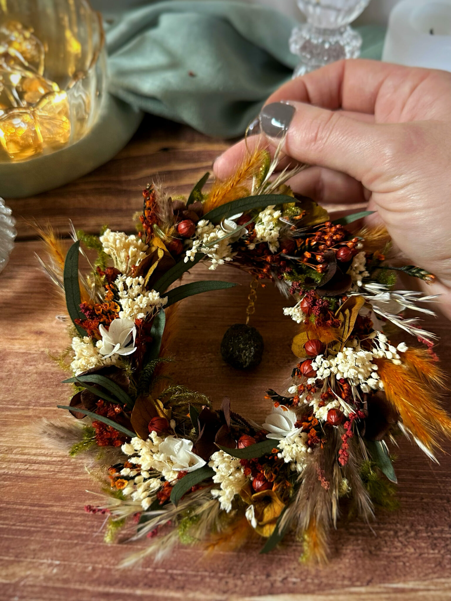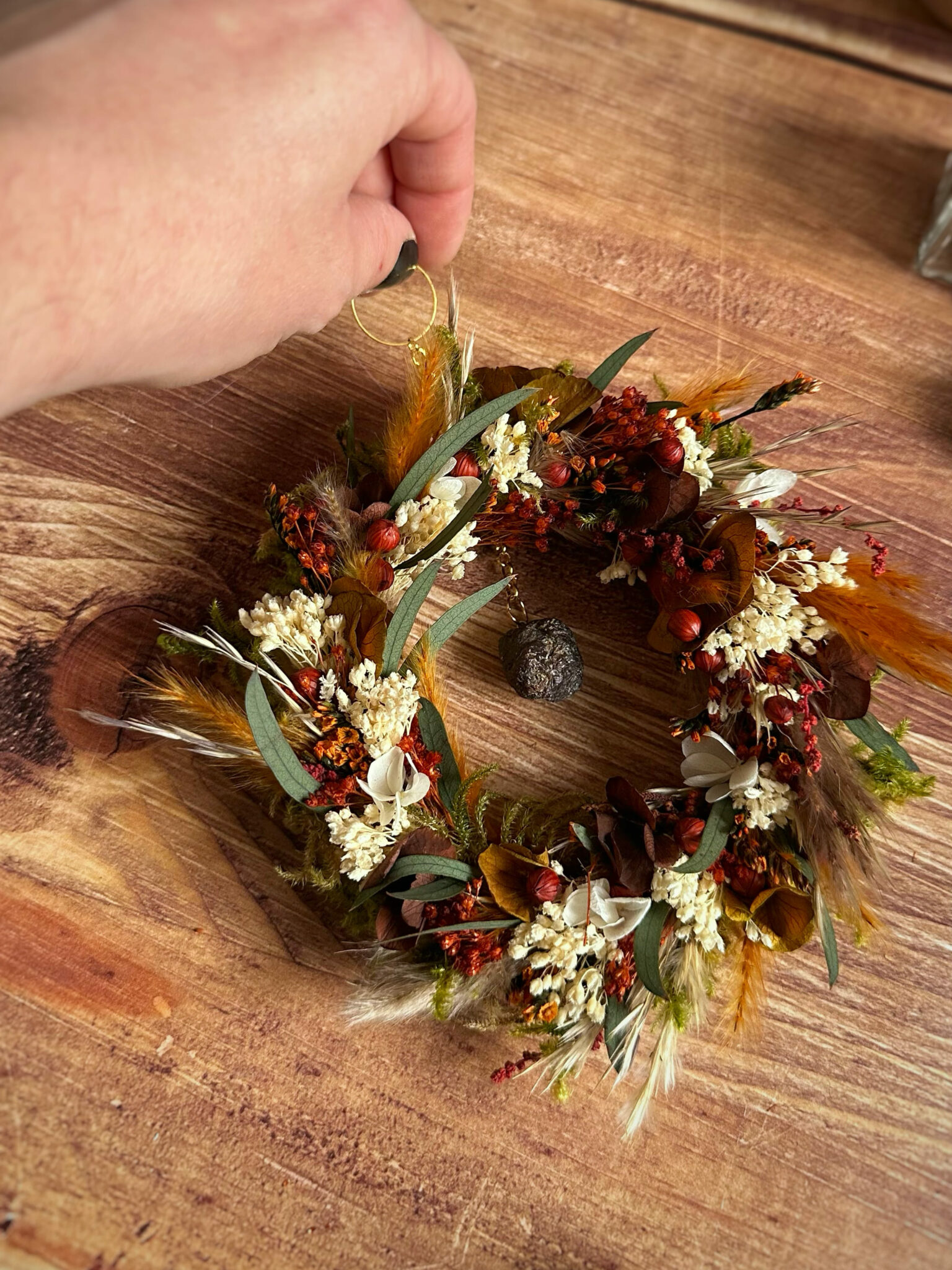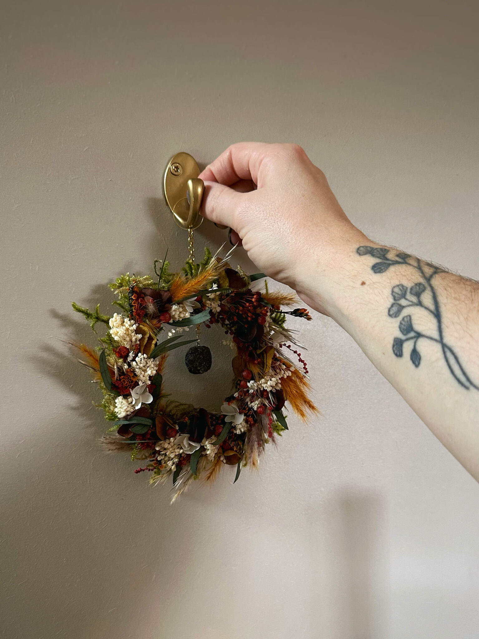 Une couronne ronde entièrement recouverte de fleurs séchées et stabilisées, inspirée par la force silencieuse des racines qui ancrent la Terre.