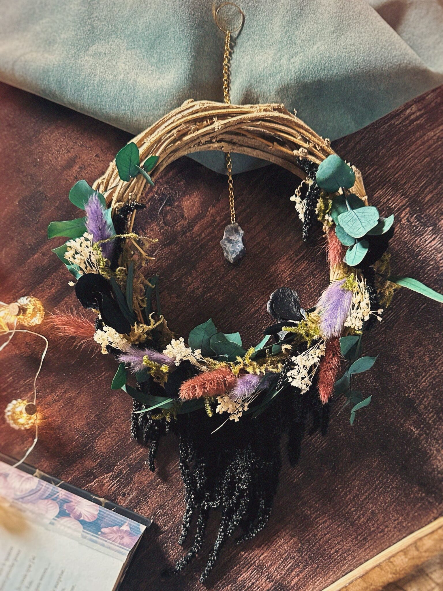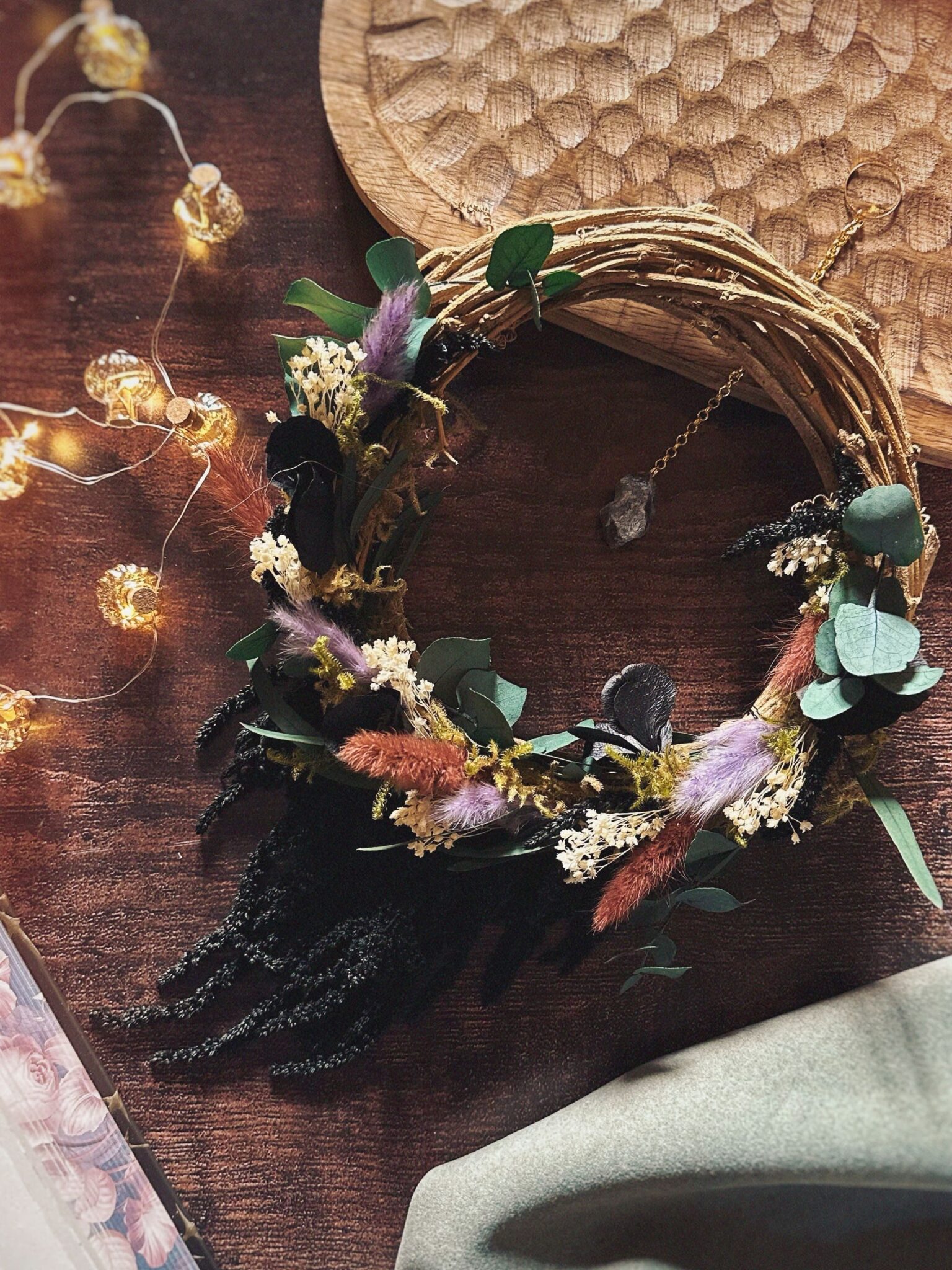 Cette couronne nommée « Résilience » est entièrement réalisée à la main dans mon atelier. Elle est un véritable symbole de Renaissance et de Renouveau, j’ai choisi les fleurs qui la composent pour te transmettre cette puissance et cette force, et qu’elles t’accompagnent au quotidien.