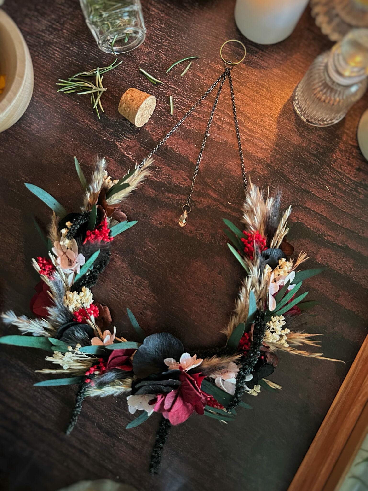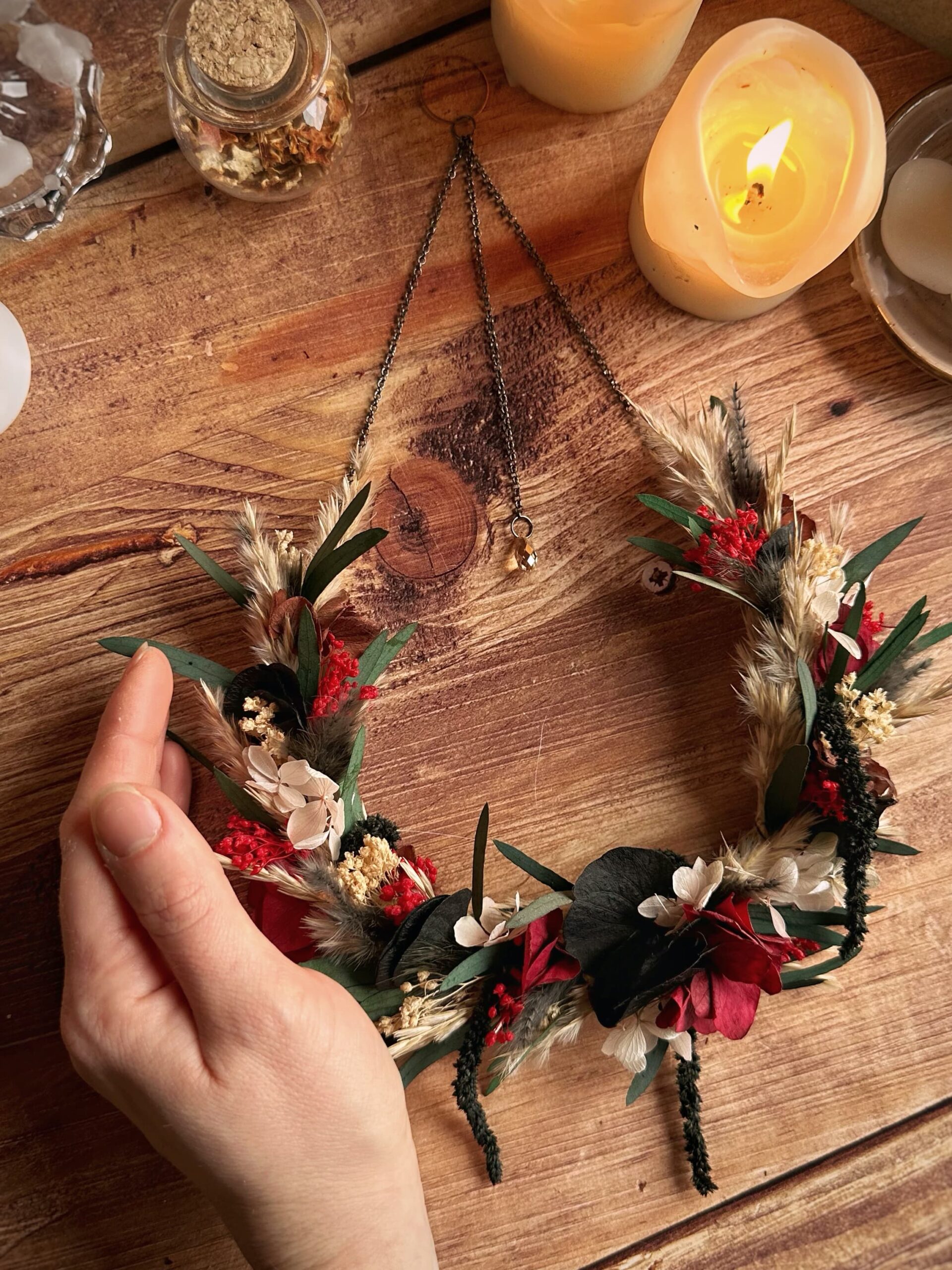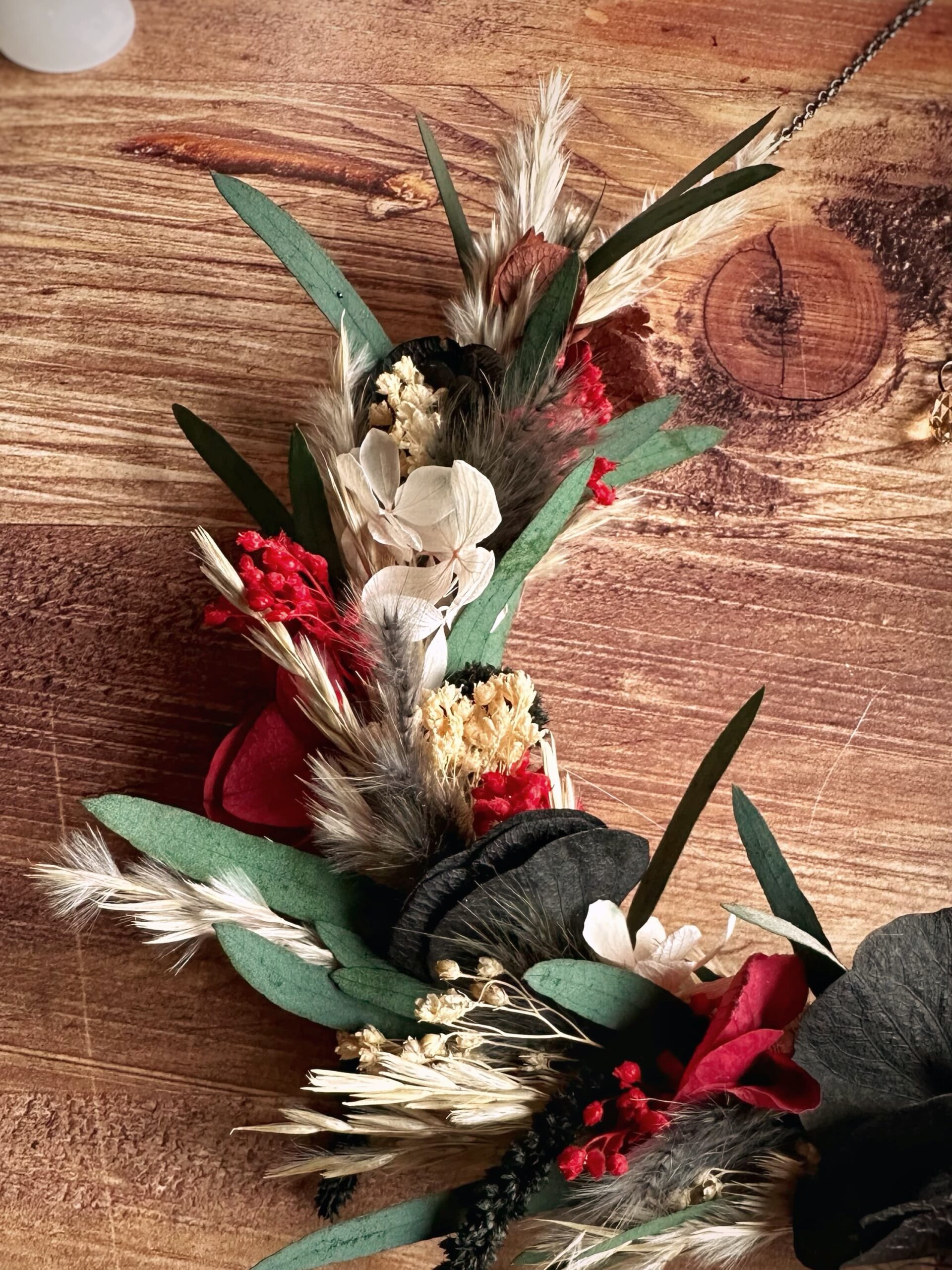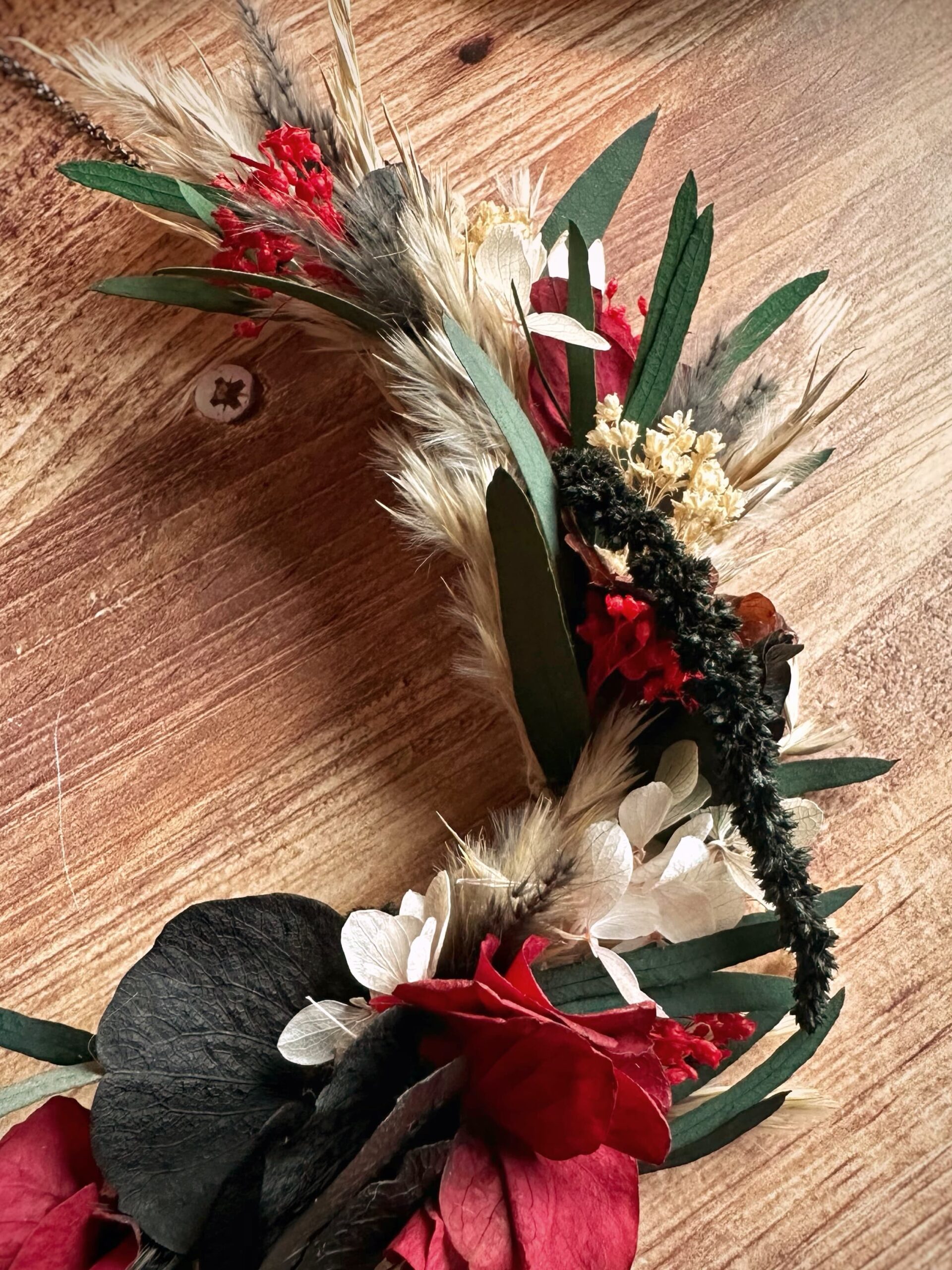 • Matériaux : Fleurs séchées et stabilisées, structure en Vigne, et anneau en métal pour pouvoir l’accrocher au mur.
