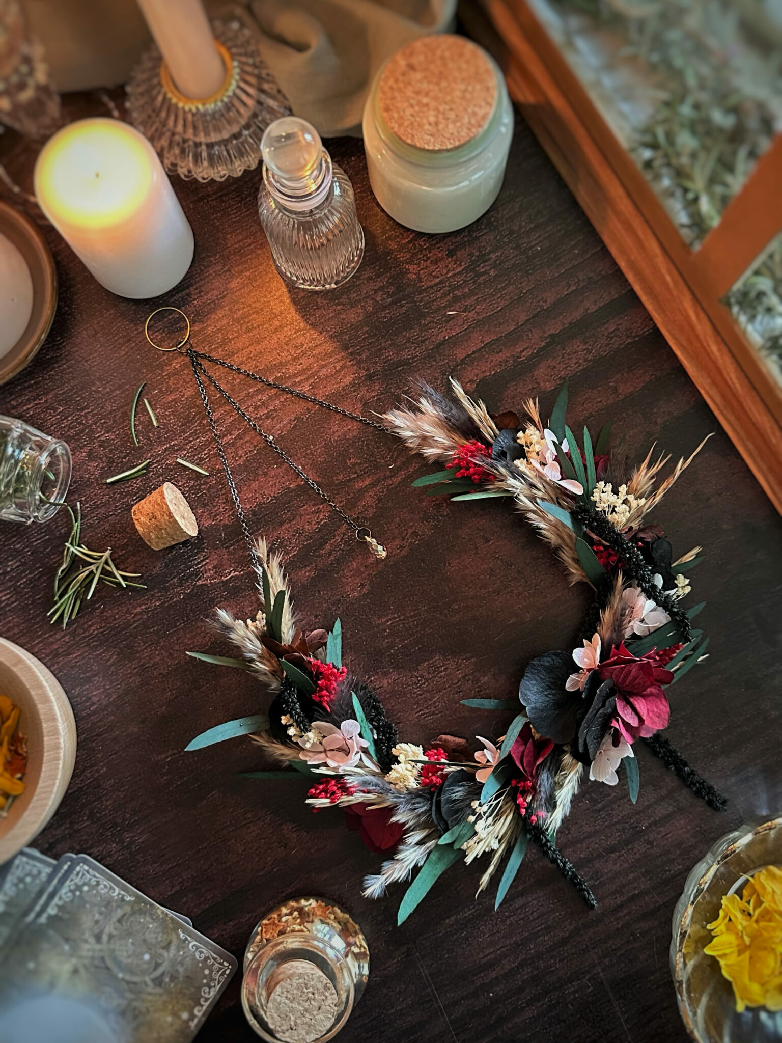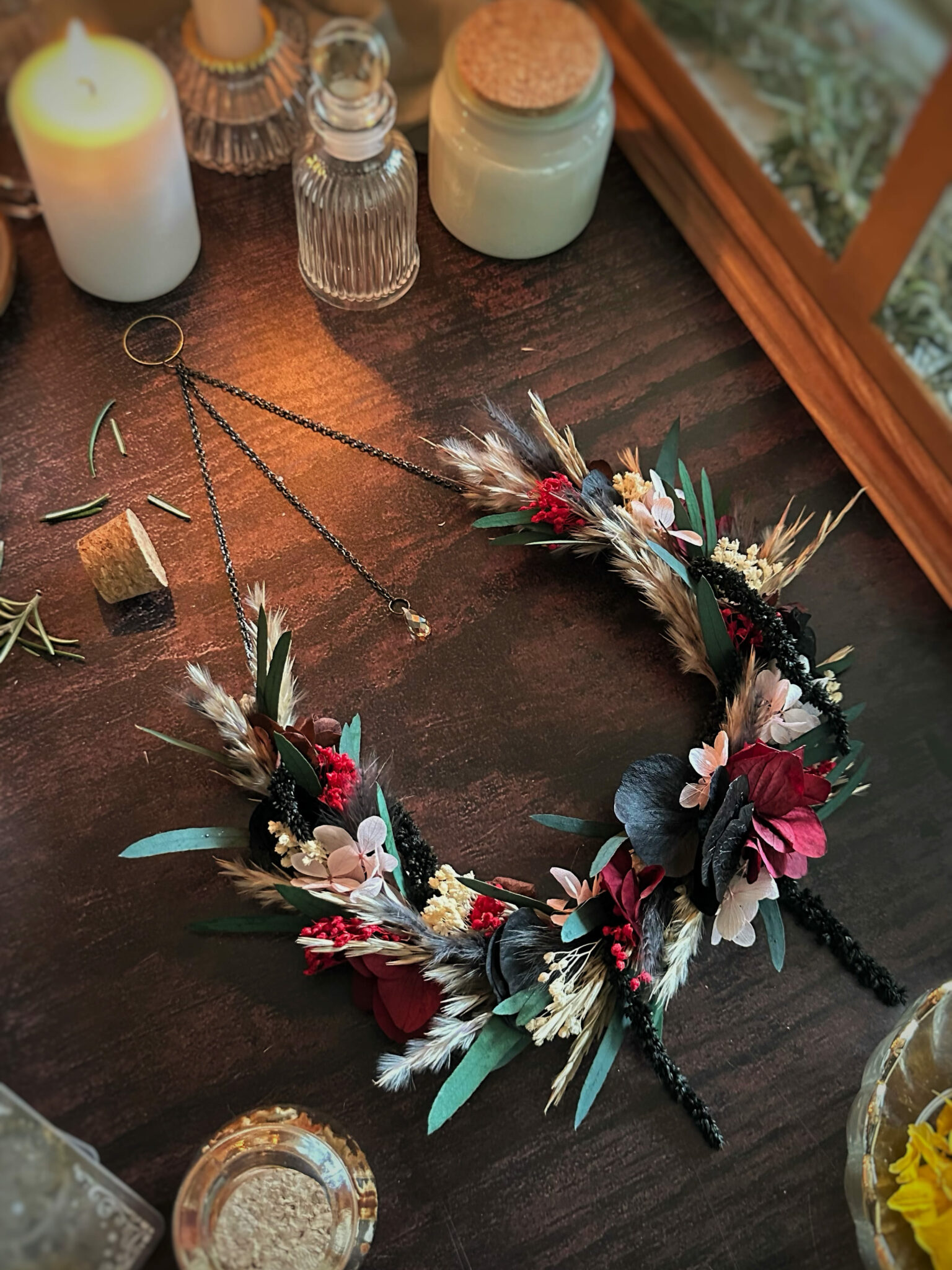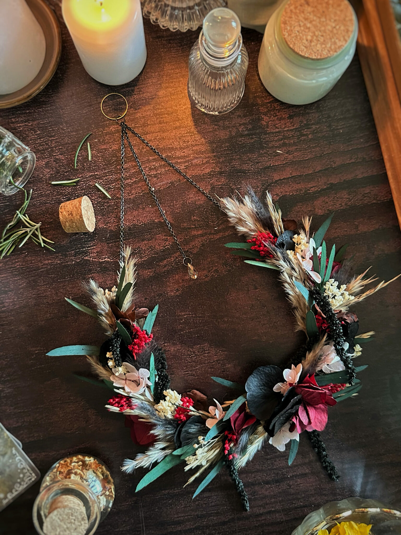 • Matériaux : Fleurs séchées et stabilisées, structure en Vigne, et anneau en métal pour pouvoir l’accrocher au mur.