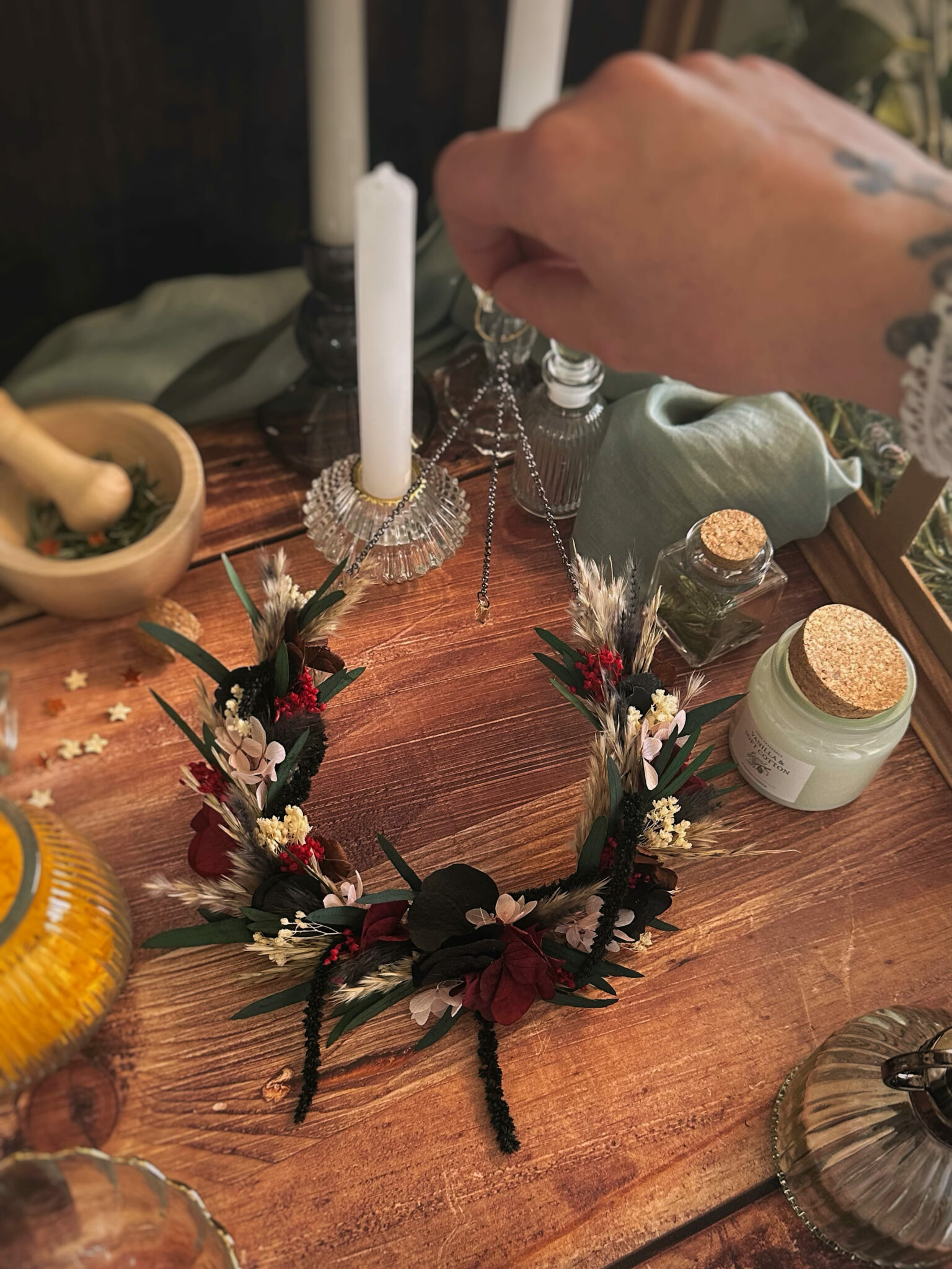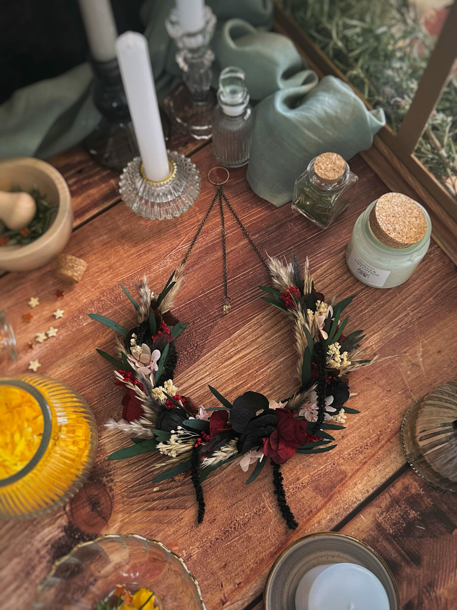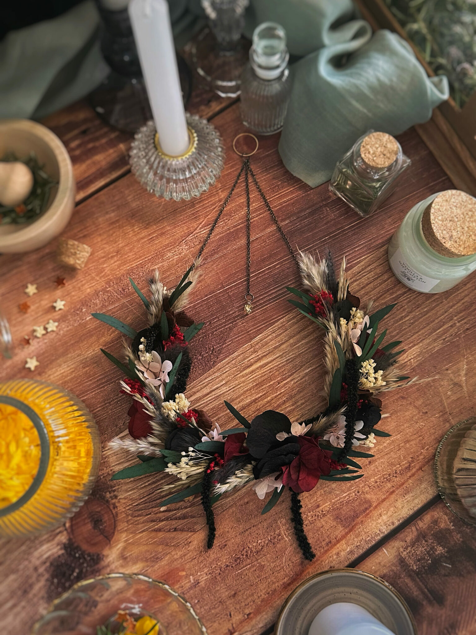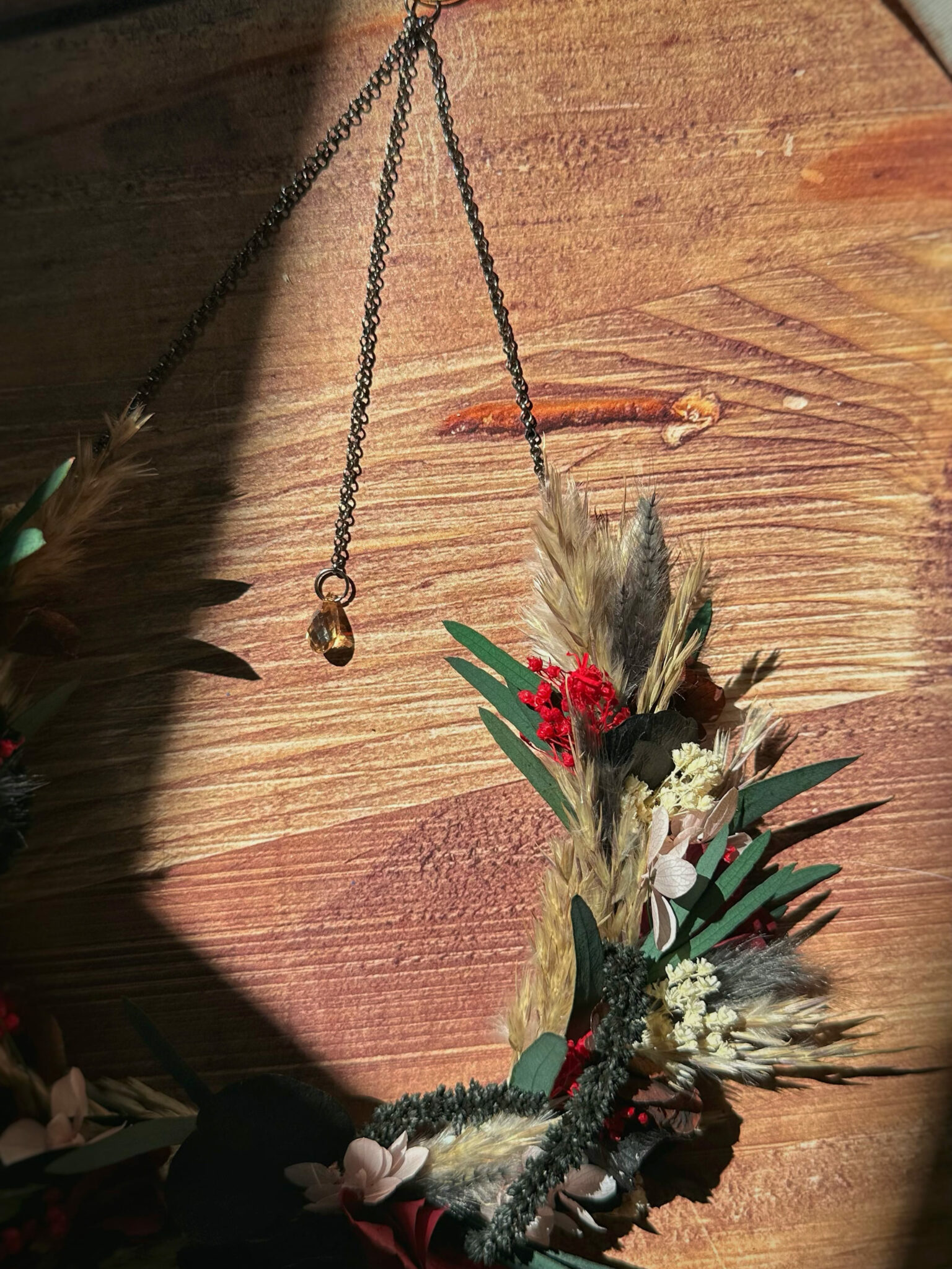 • Matériaux : Fleurs séchées et stabilisées, structure en Vigne, et anneau en métal pour pouvoir l’accrocher au mur.