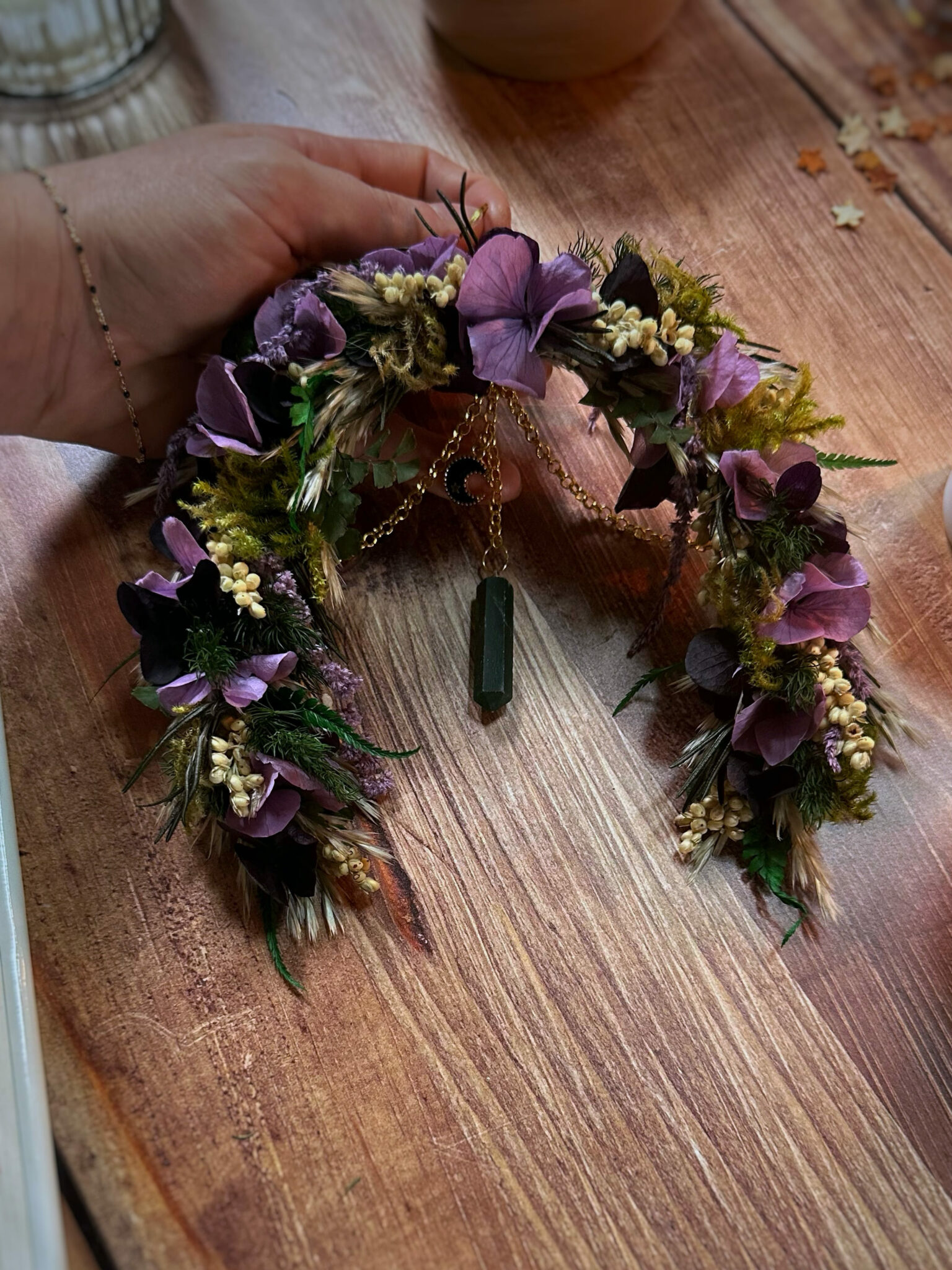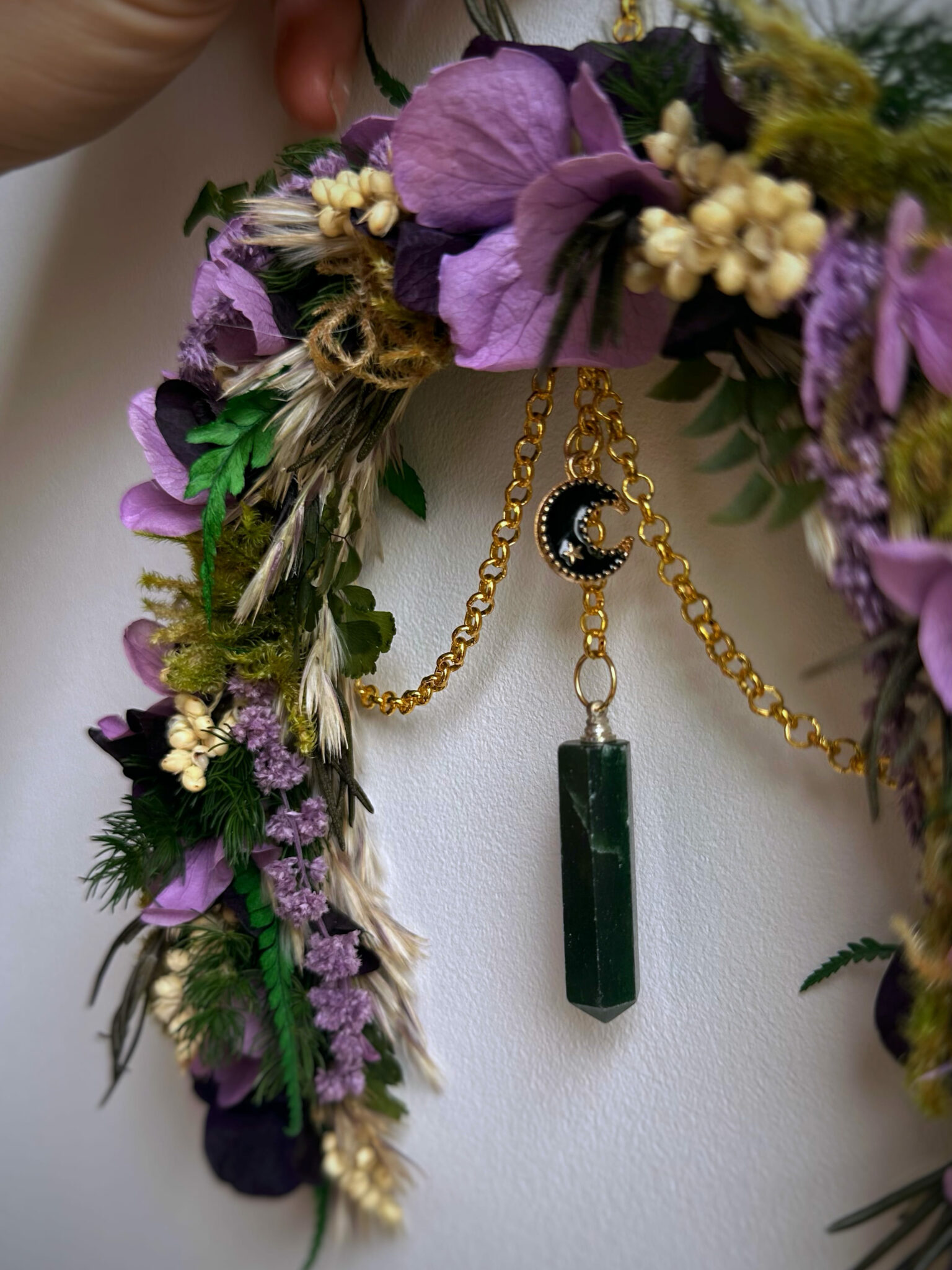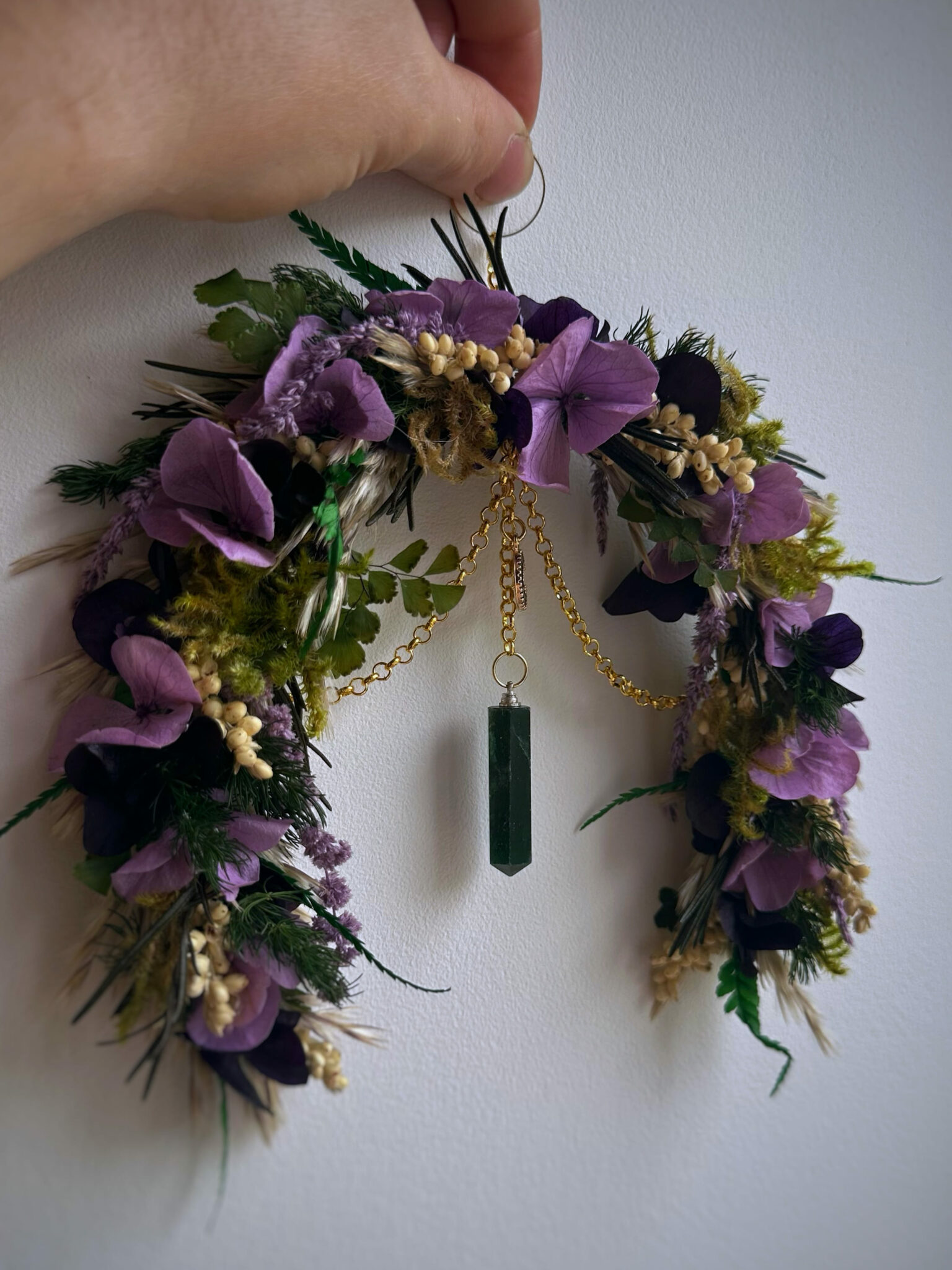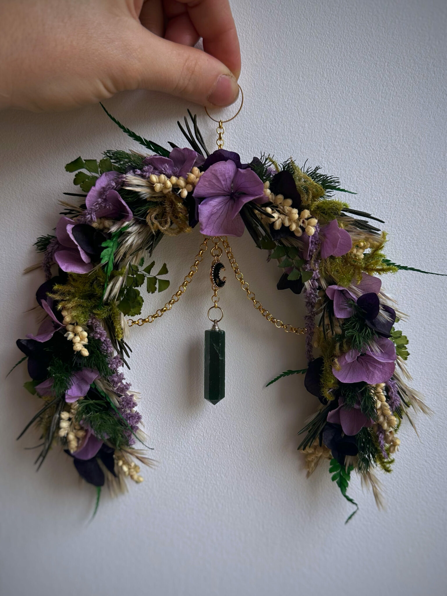 • Matériaux : Fleurs séchées et stabilisées, pierre d’Aventurine en pointe, petite breloque Lune noire, petit anneau et chaîne en métal doré pour pouvoir l’accrocher au mur.