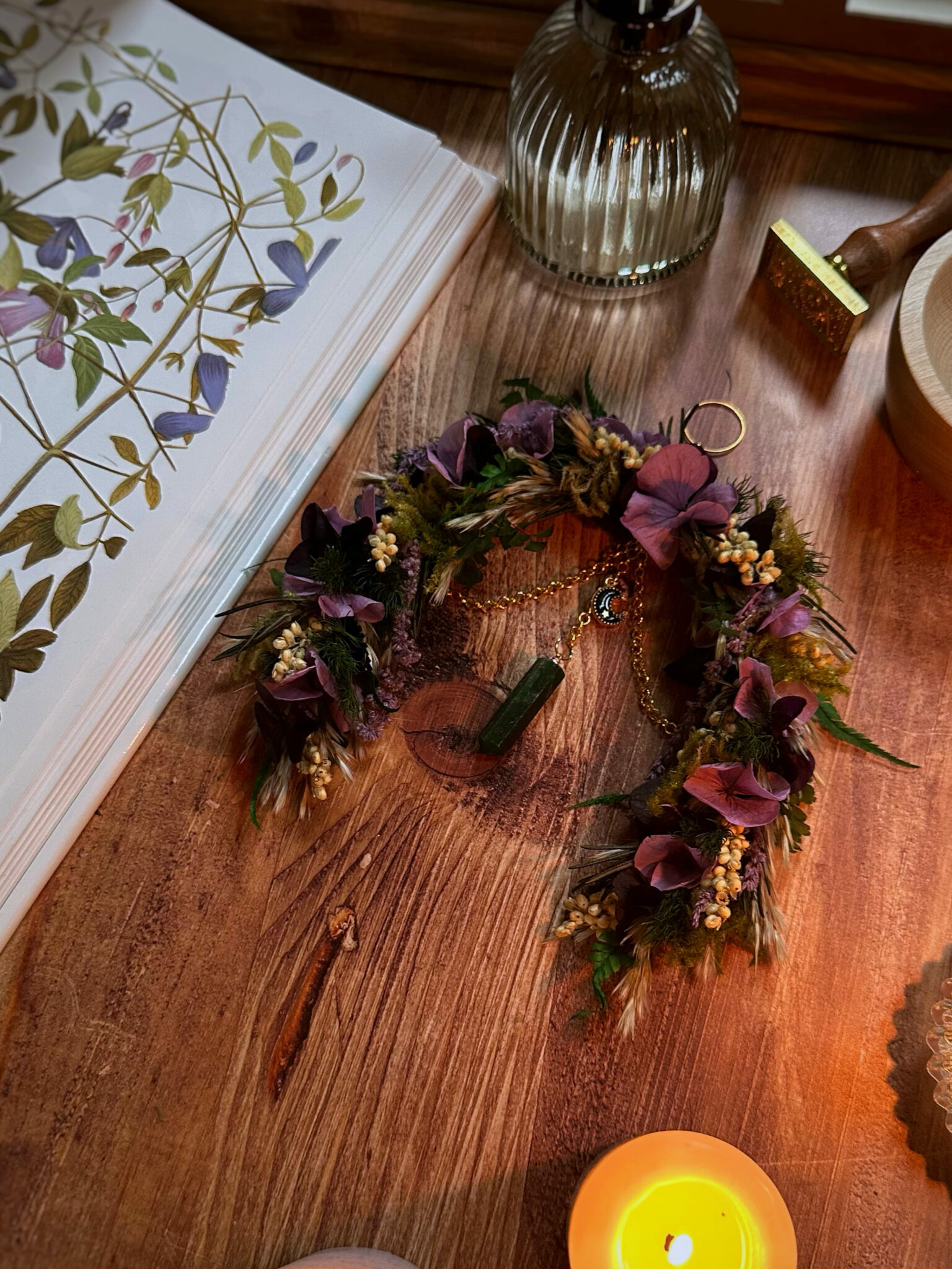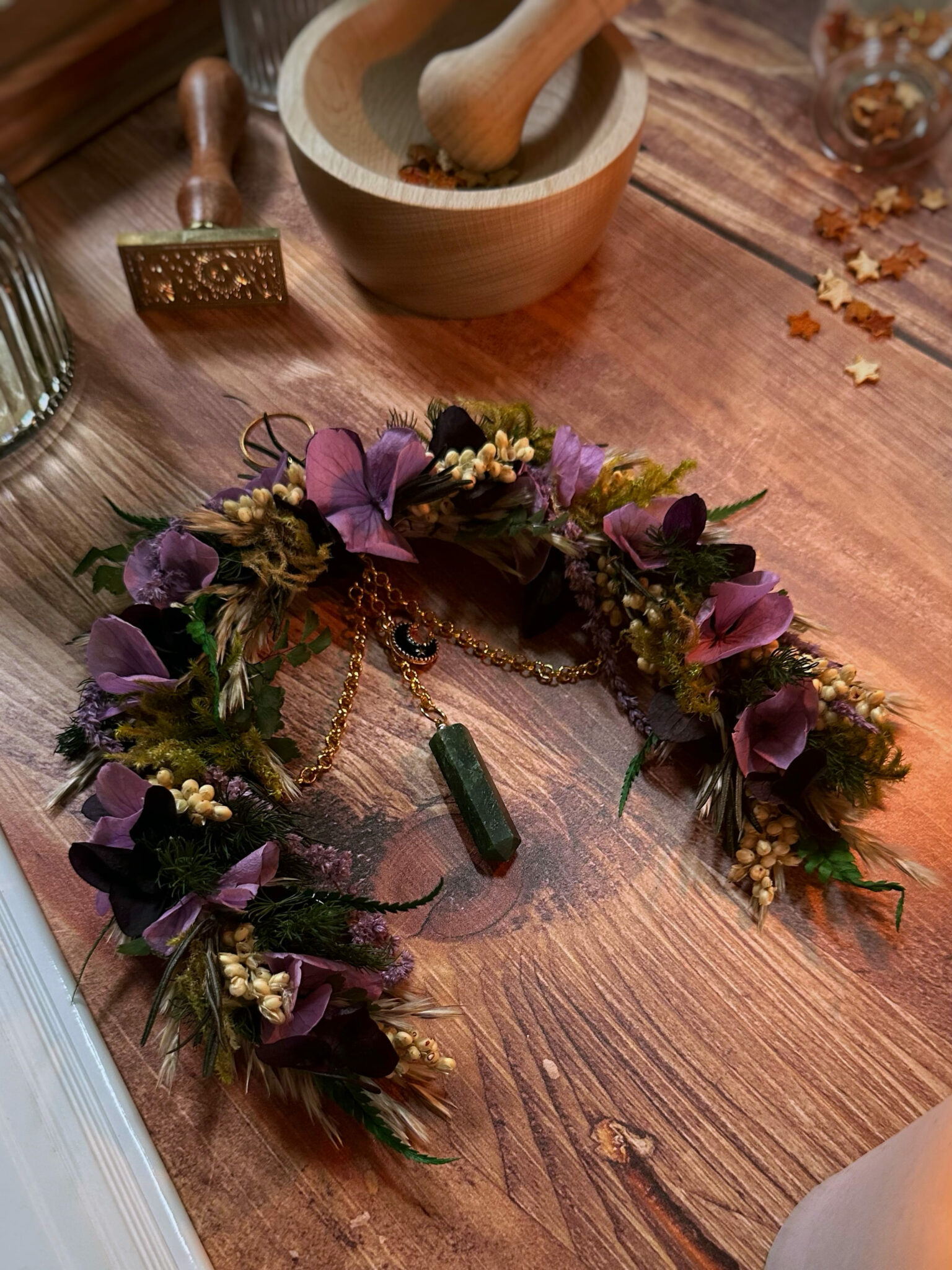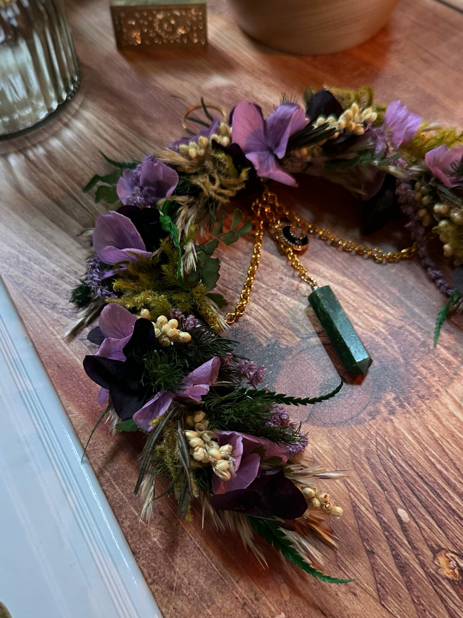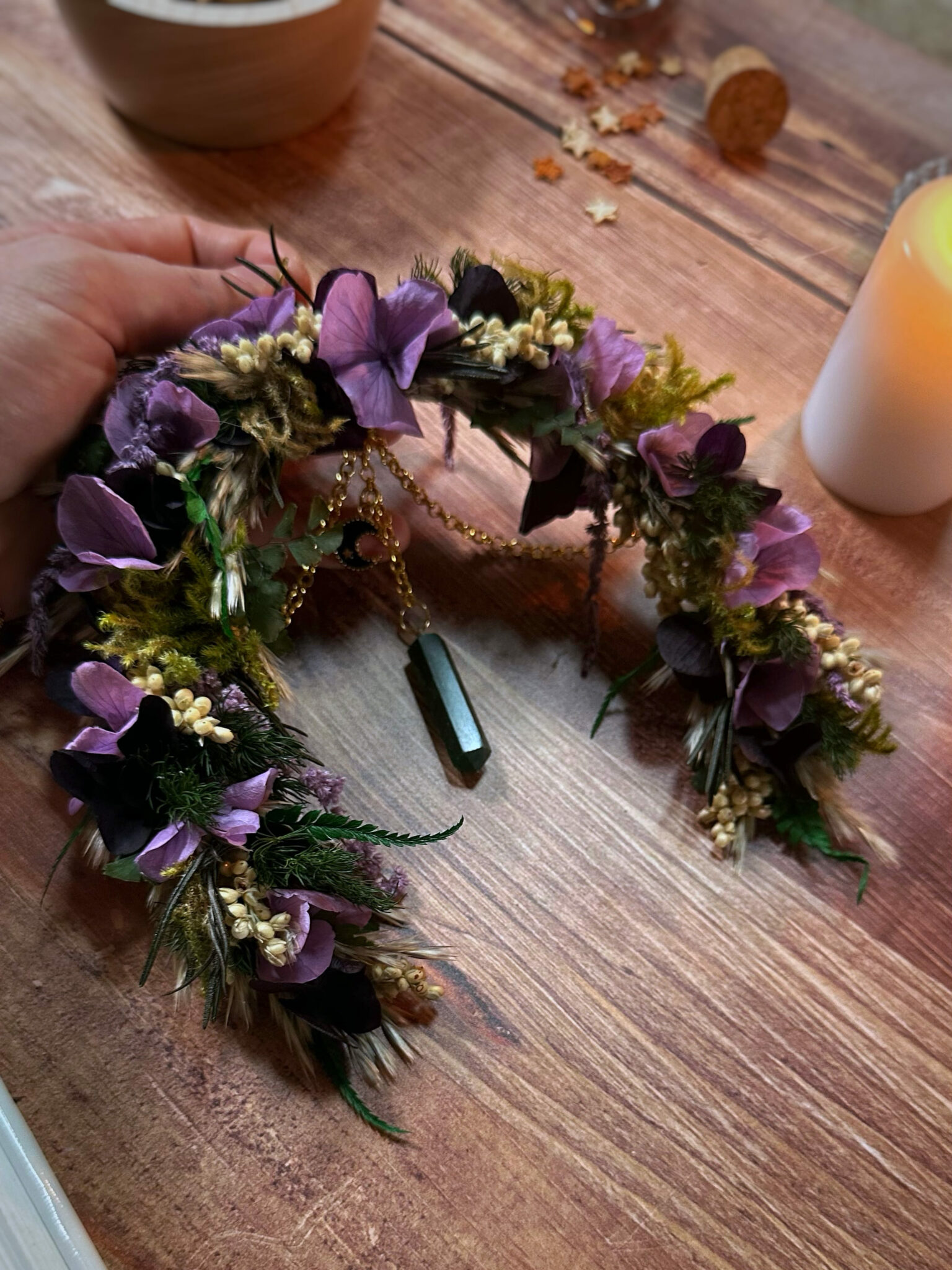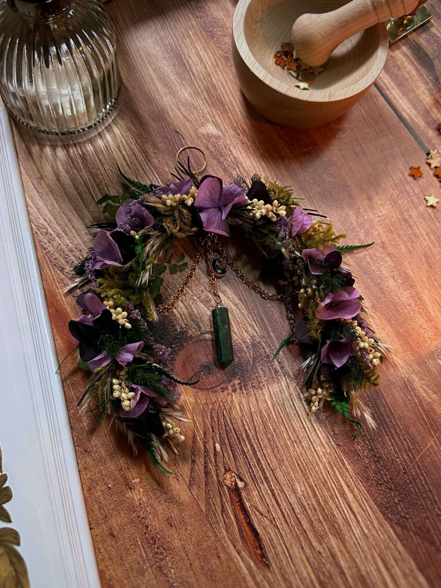 • Matériaux : Fleurs séchées et stabilisées, pierre d’Aventurine en pointe, petite breloque Lune noire, petit anneau et chaîne en métal doré pour pouvoir l’accrocher au mur.