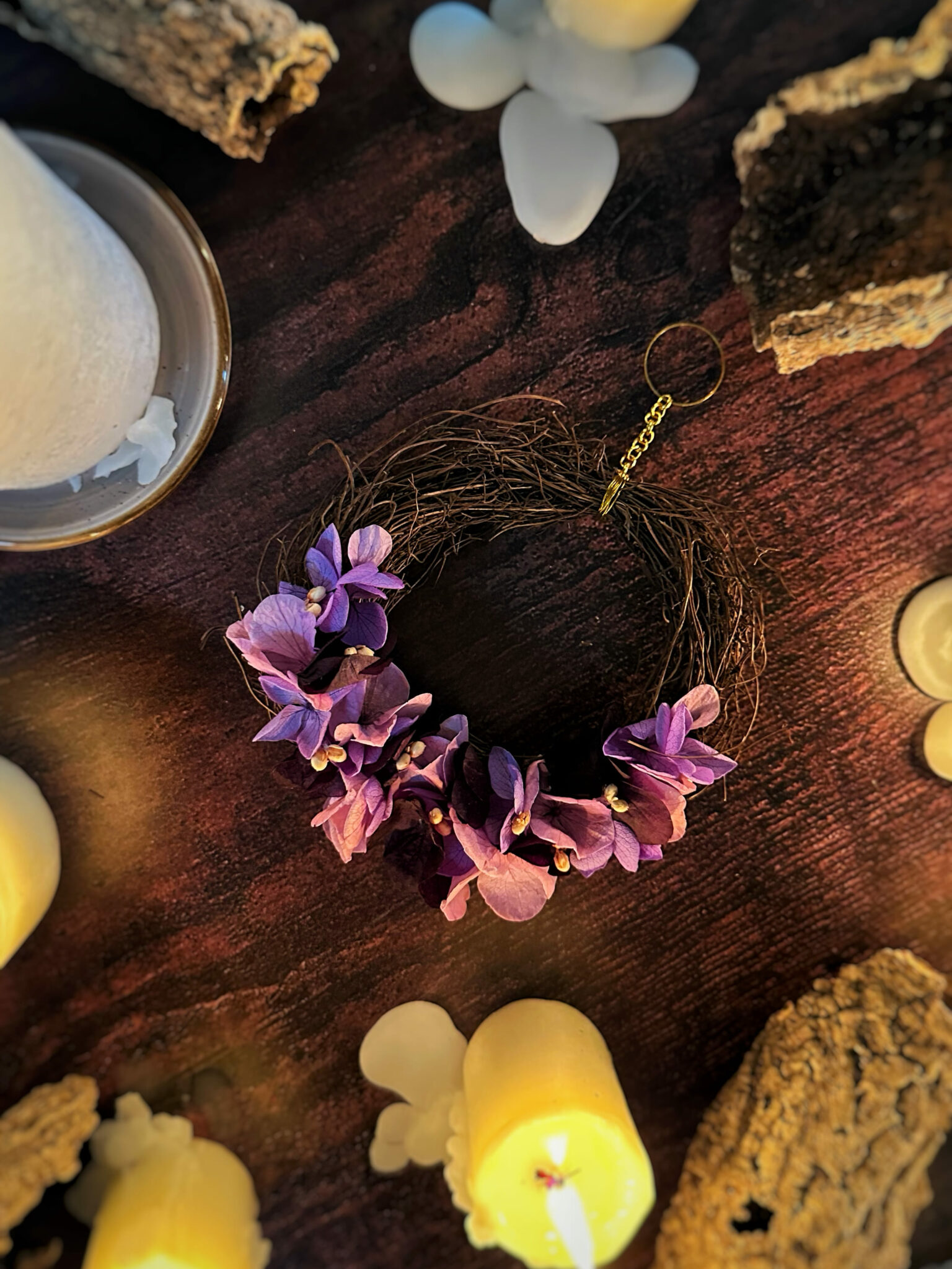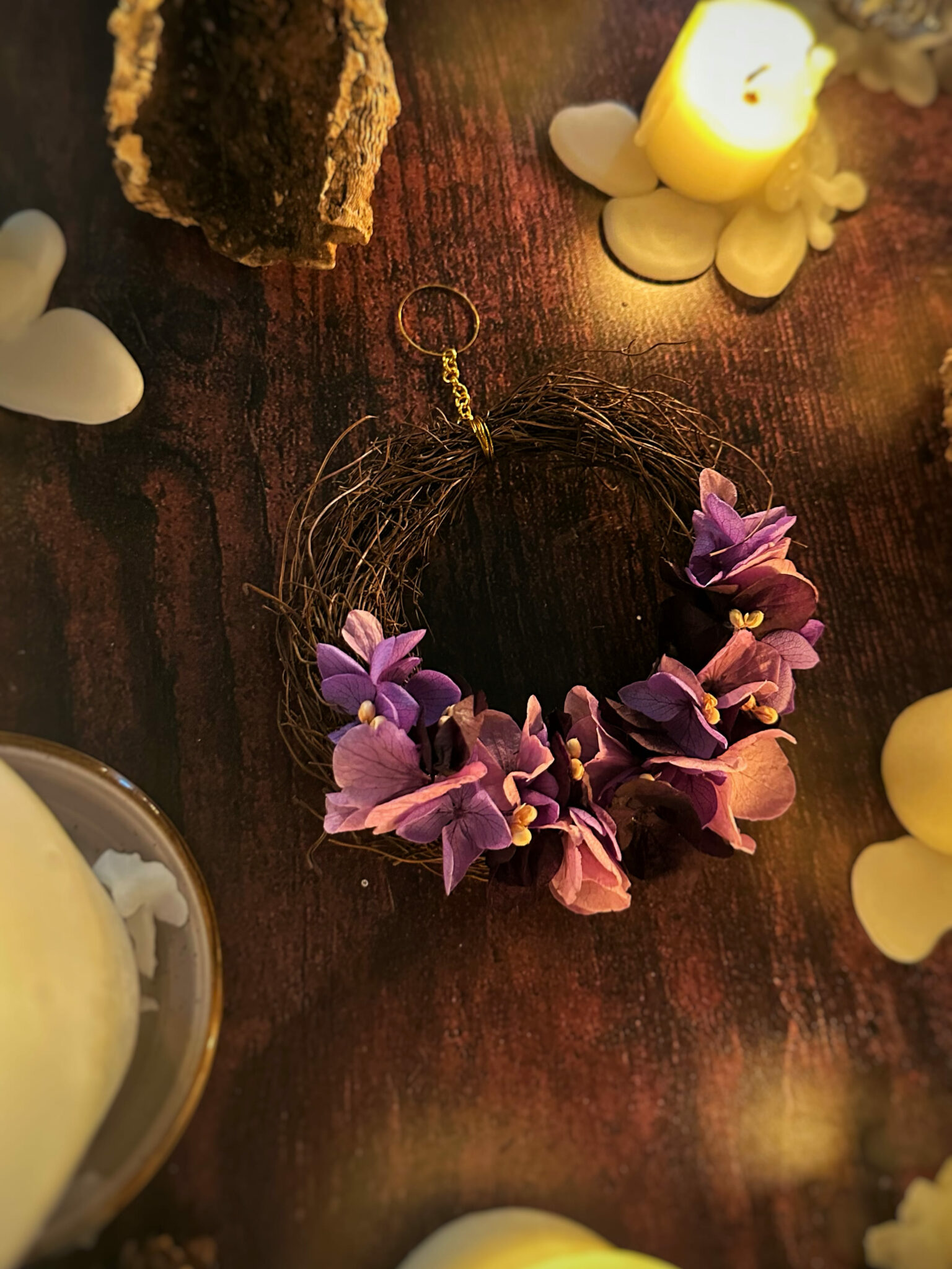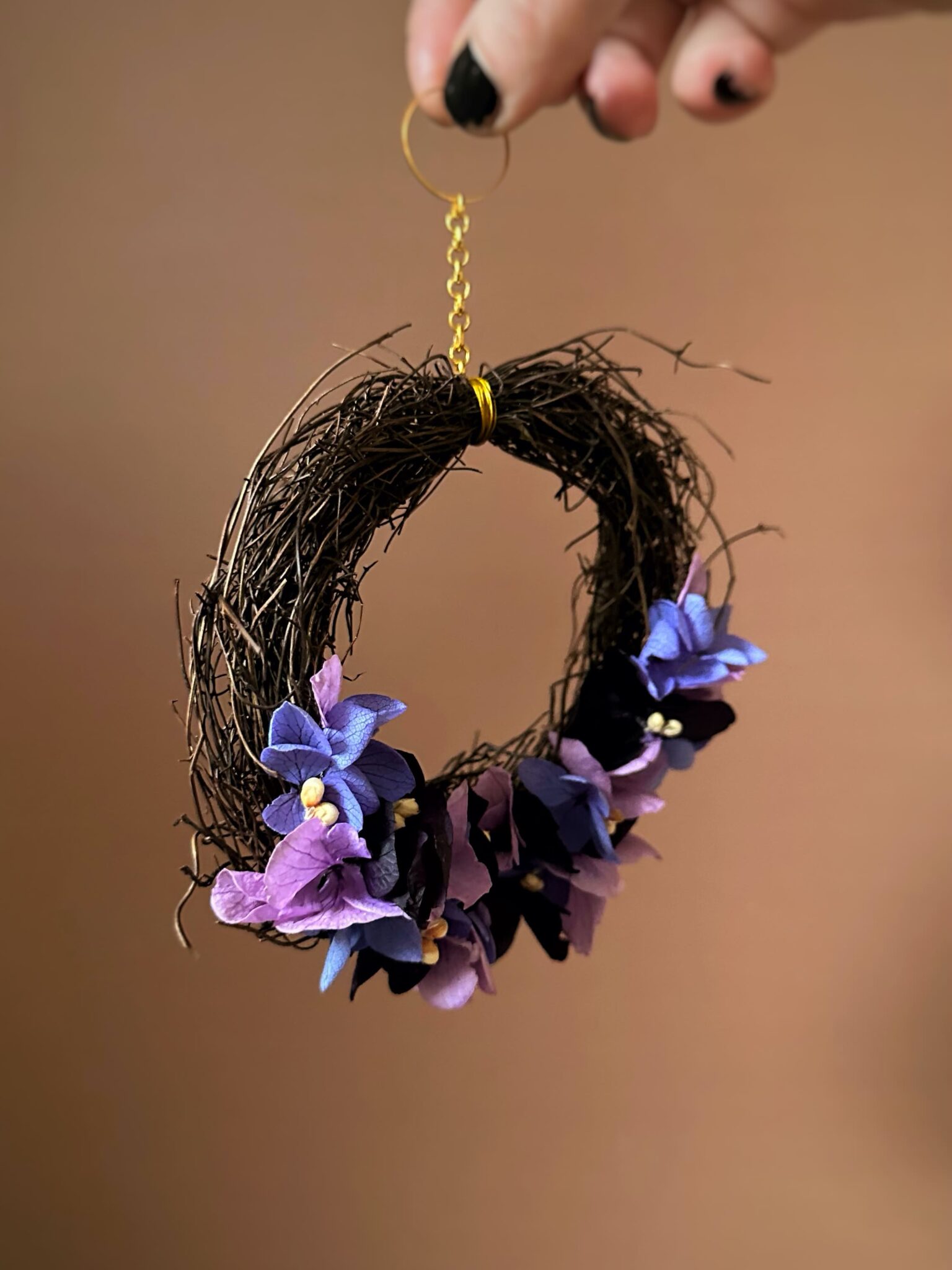 Une couronne ronde en tiges de Muehlenbeckia entièrement réalisée à la main, et poétiquement recouverte de fleurs séchées et stabilisées par mes soins.