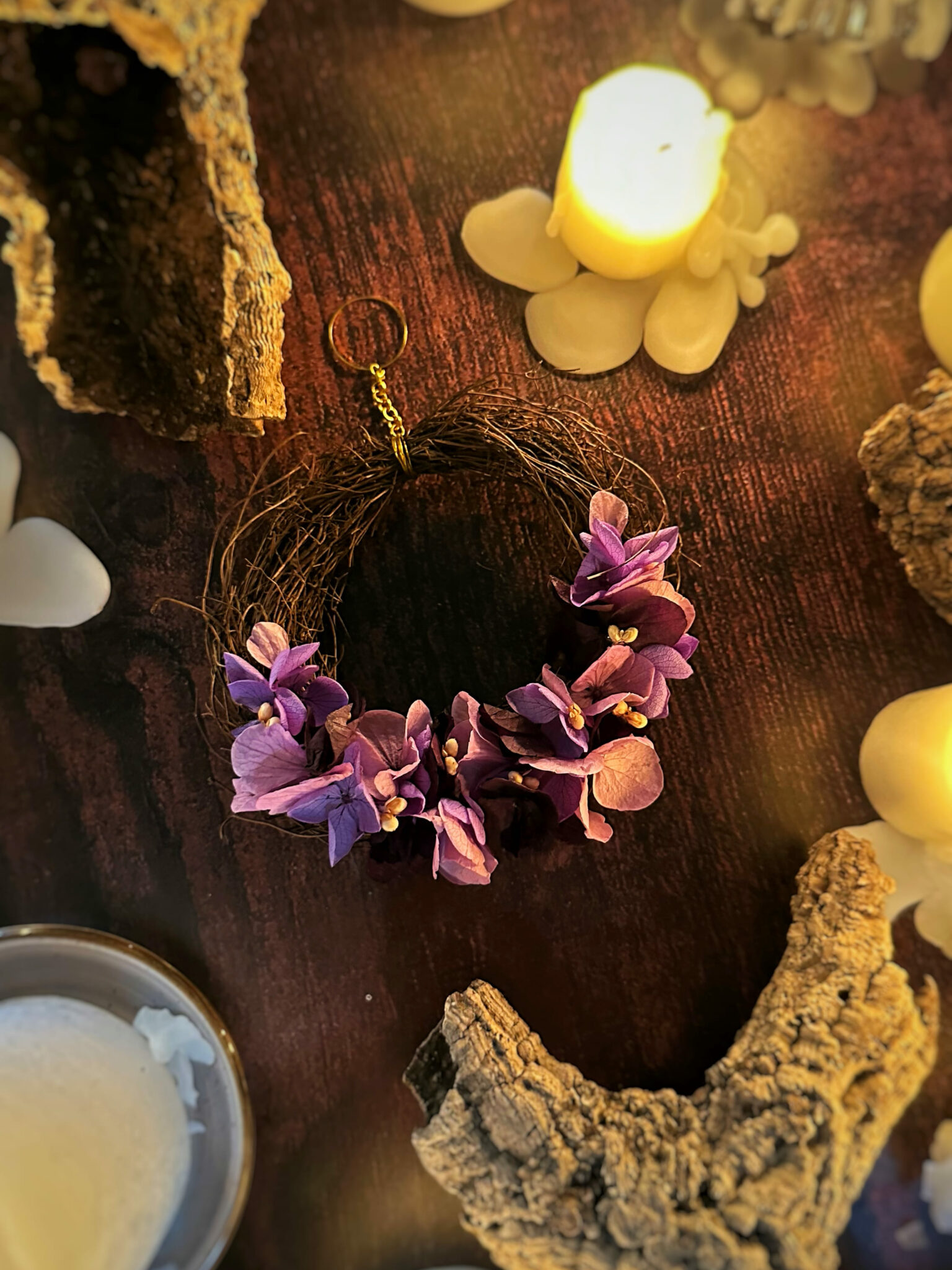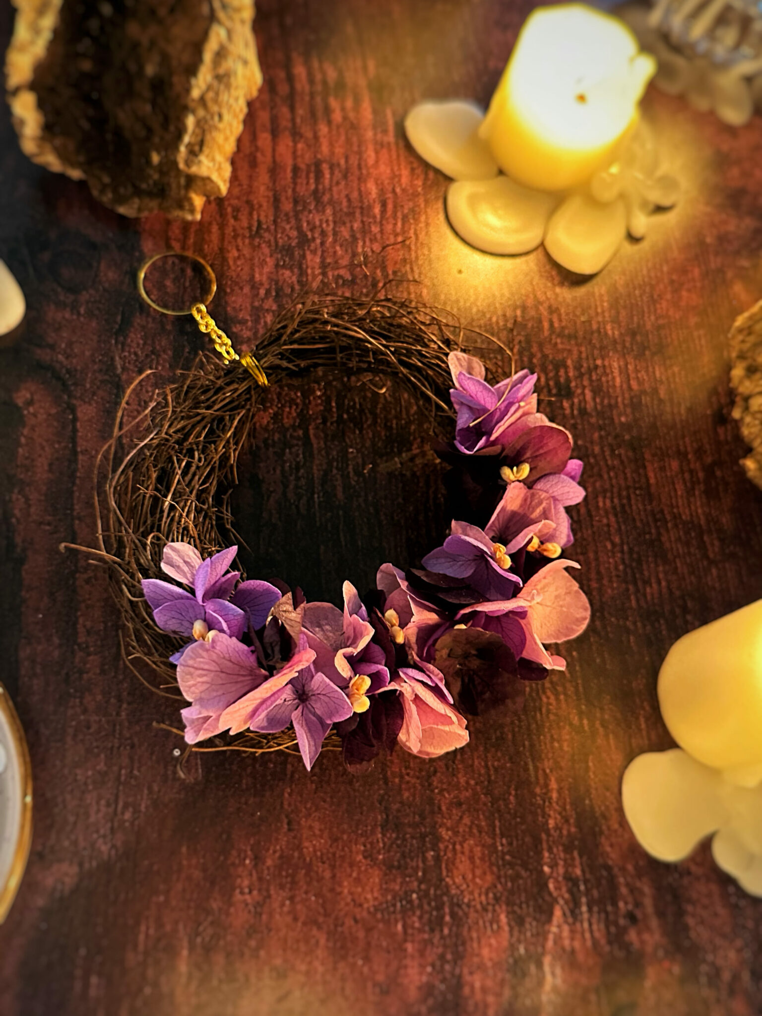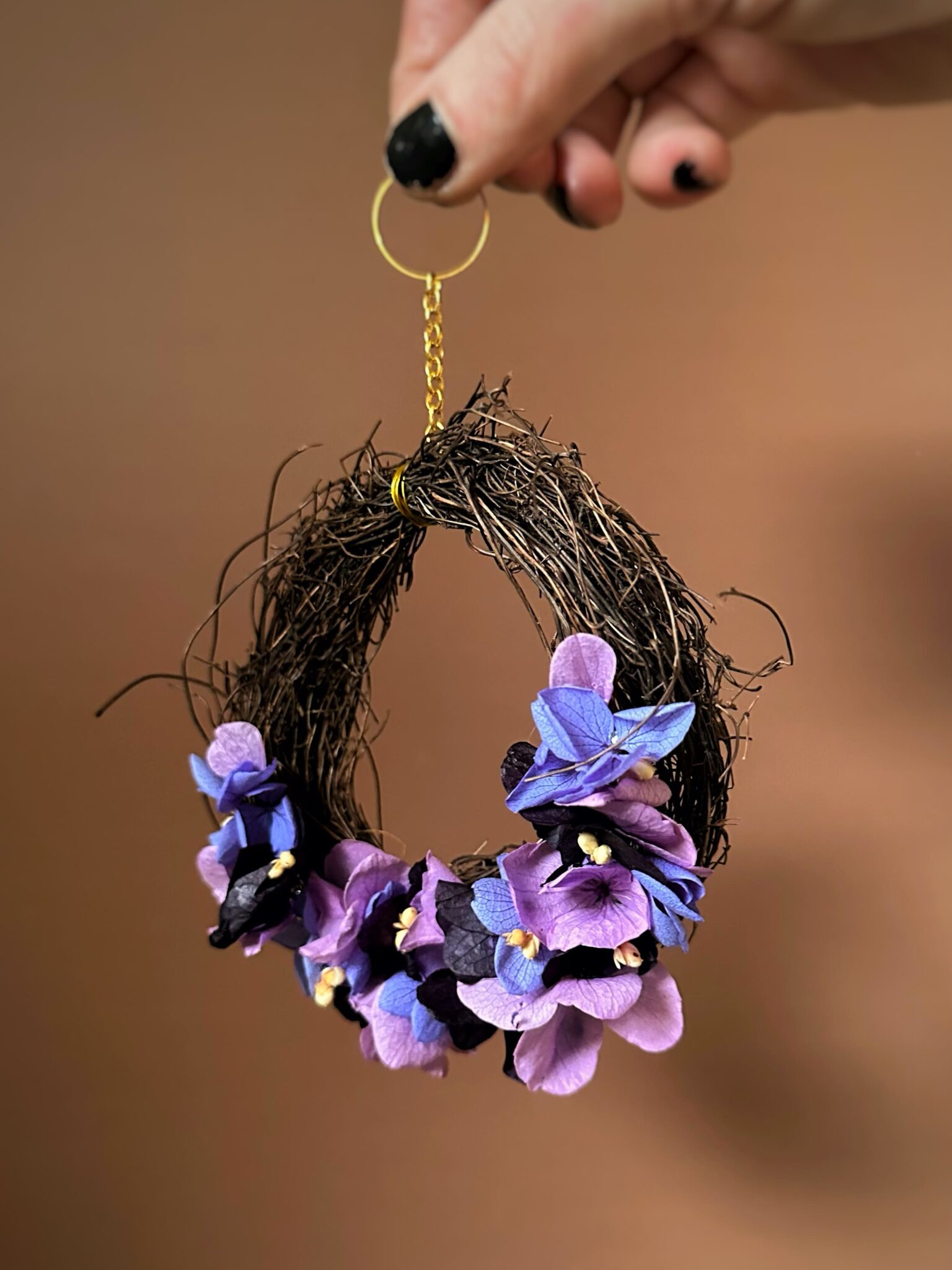 Une couronne ronde en tiges de Muehlenbeckia entièrement réalisée à la main, et poétiquement recouverte de fleurs séchées et stabilisées par mes soins.
