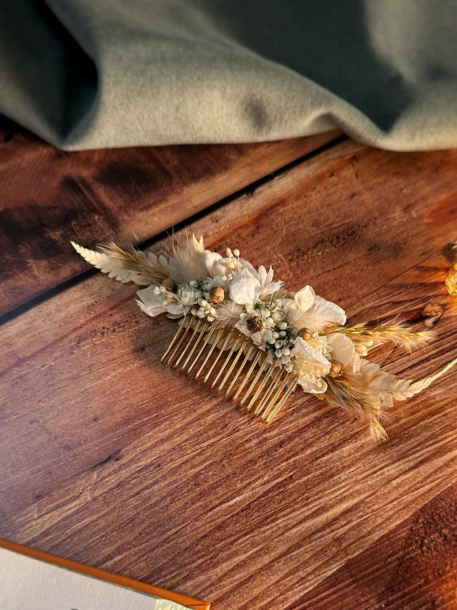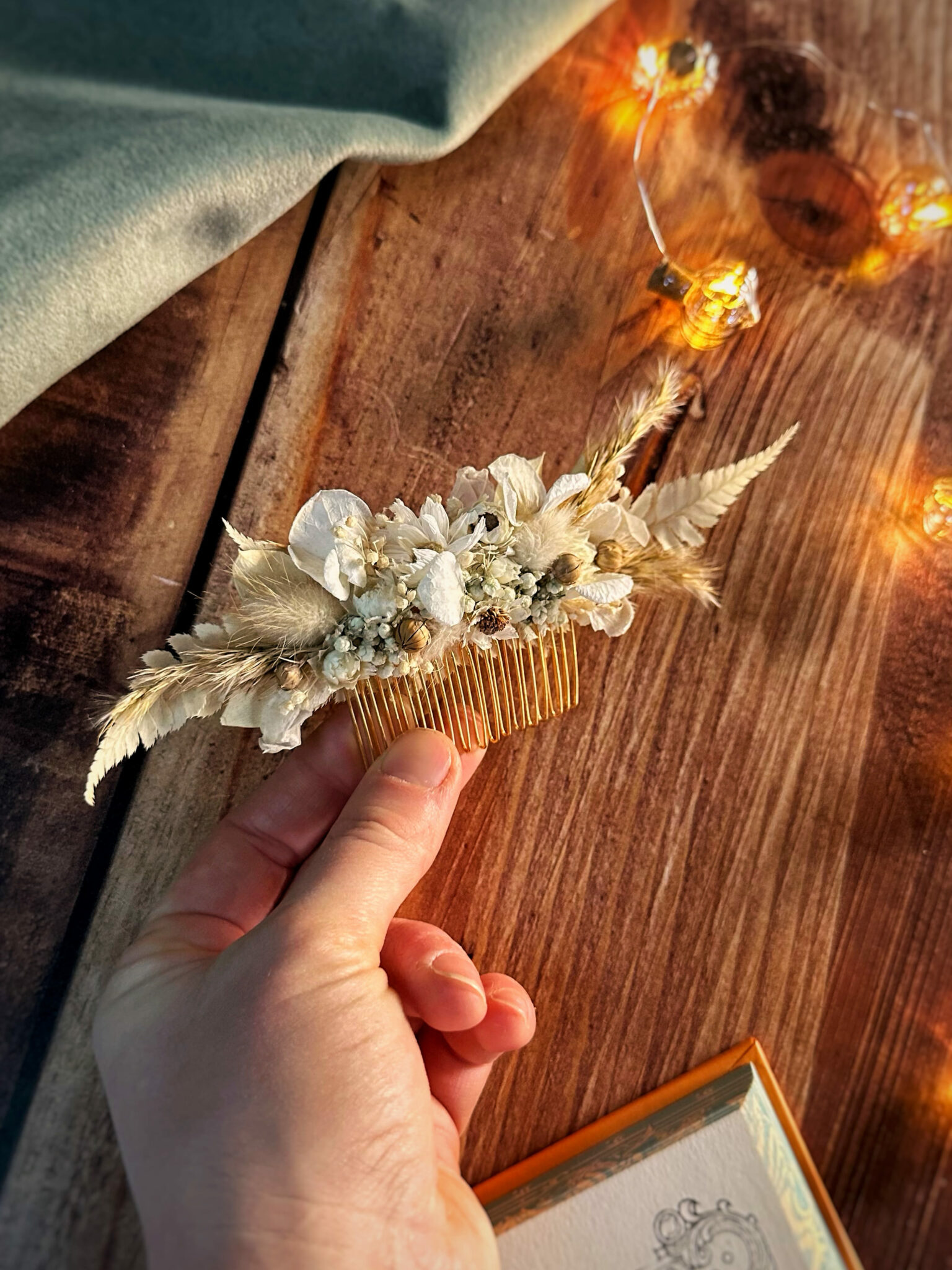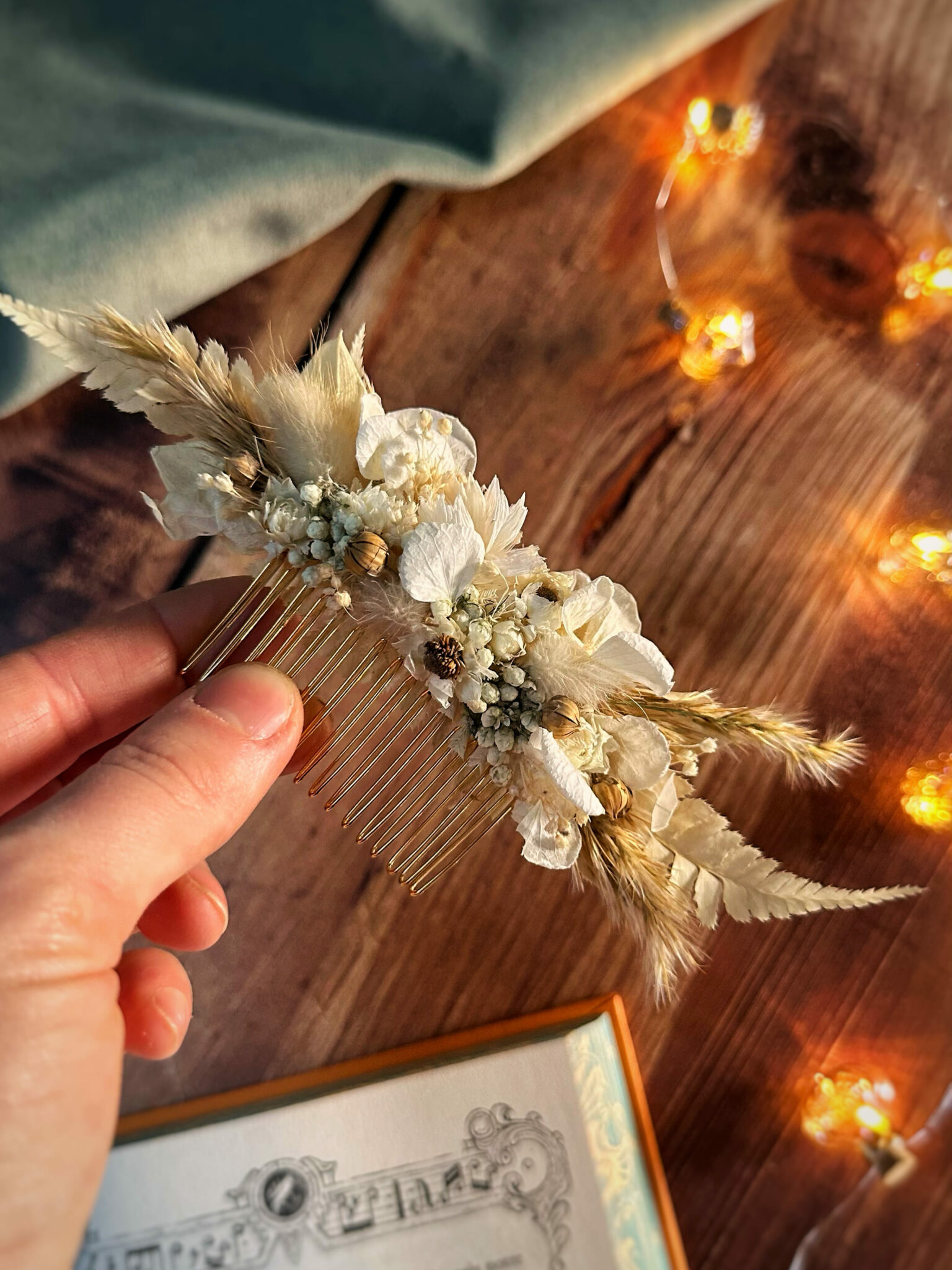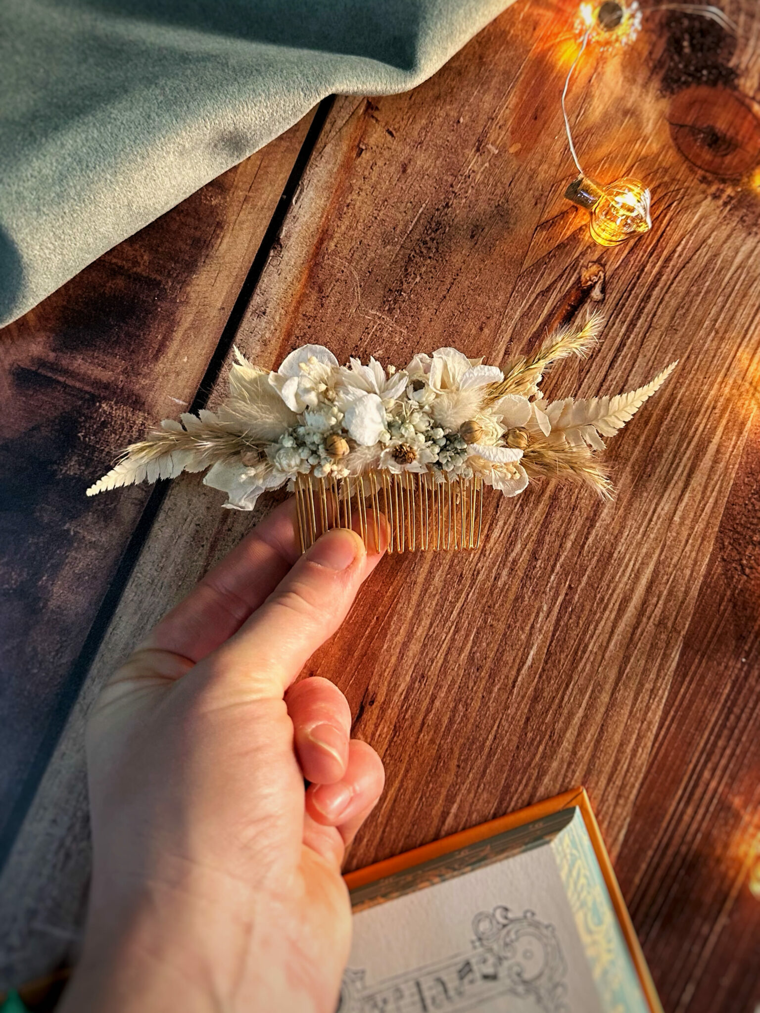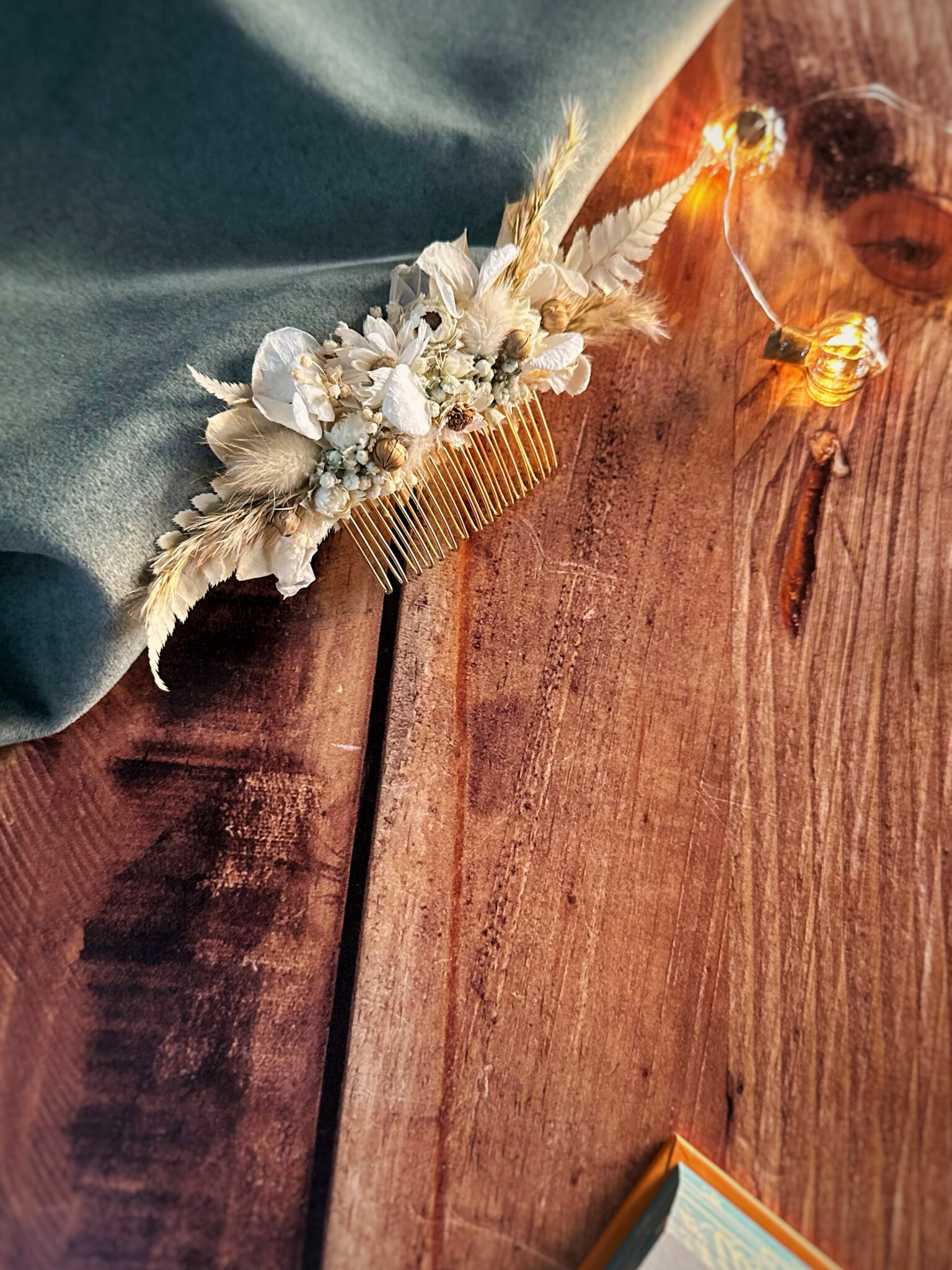 Séléna – Pièce unique – Peigne en fleurs séchées et stabilisées blanc