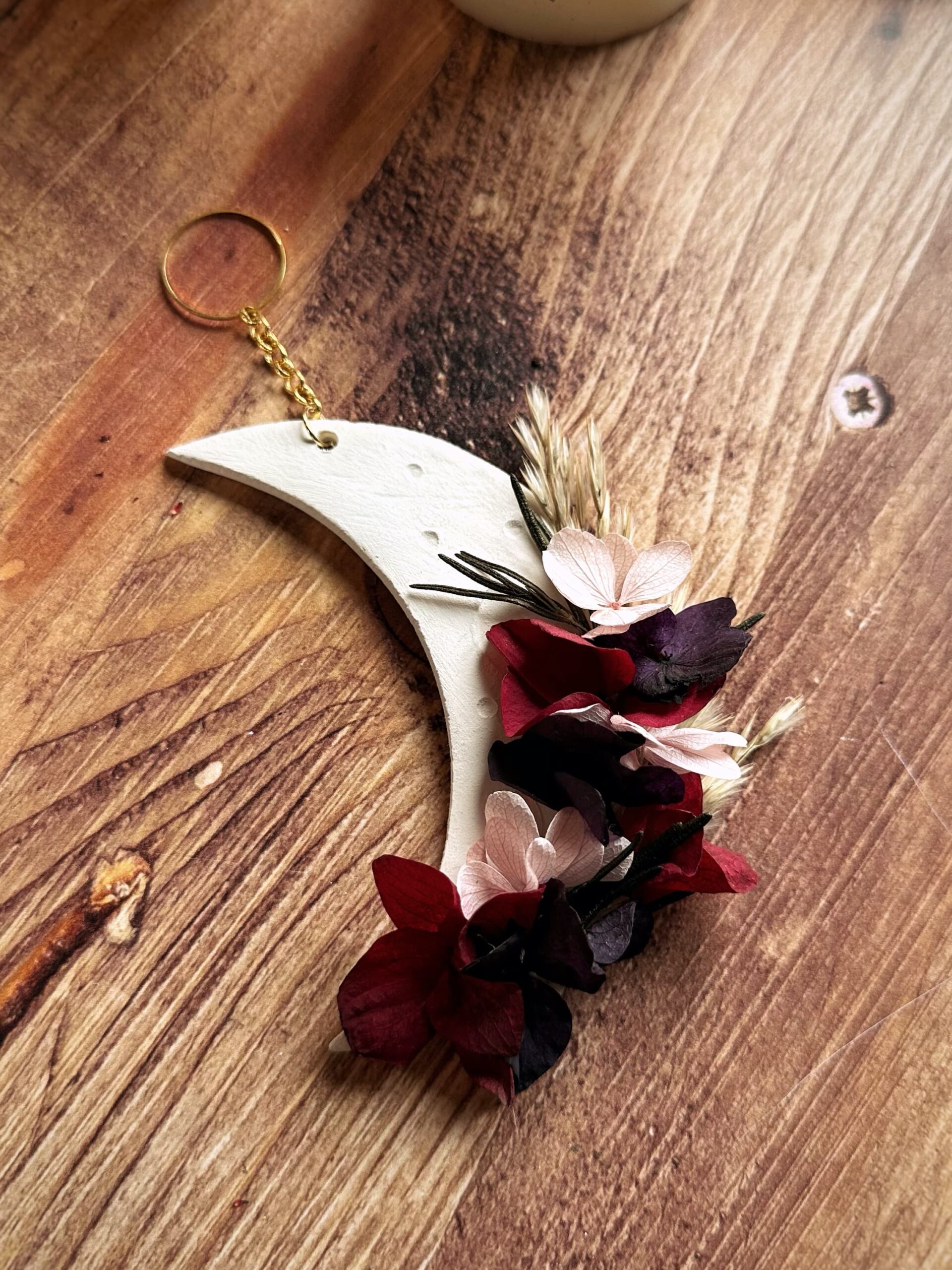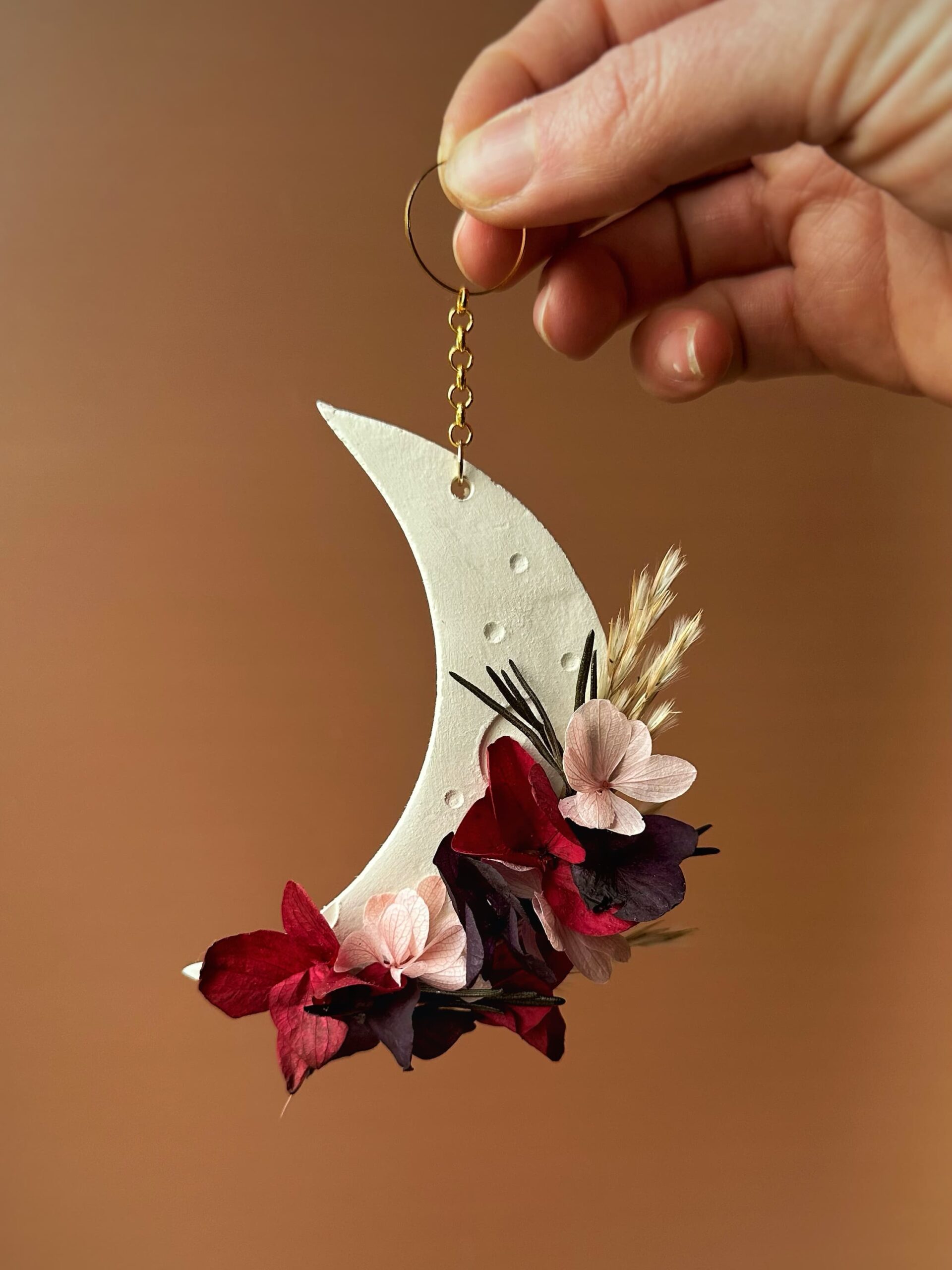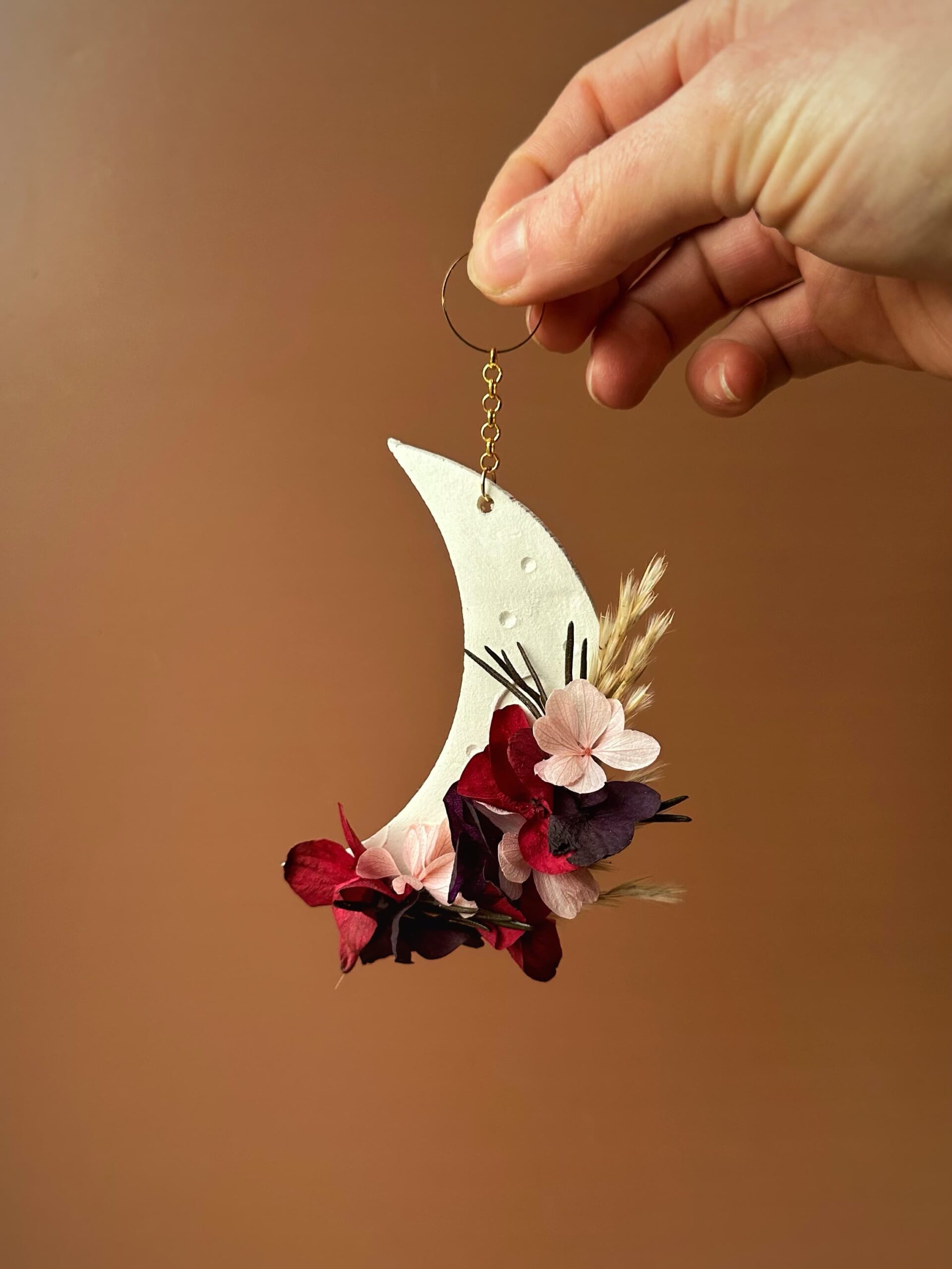Velours – Suspension demie-lune en fleurs séchées et stabilisées et argile