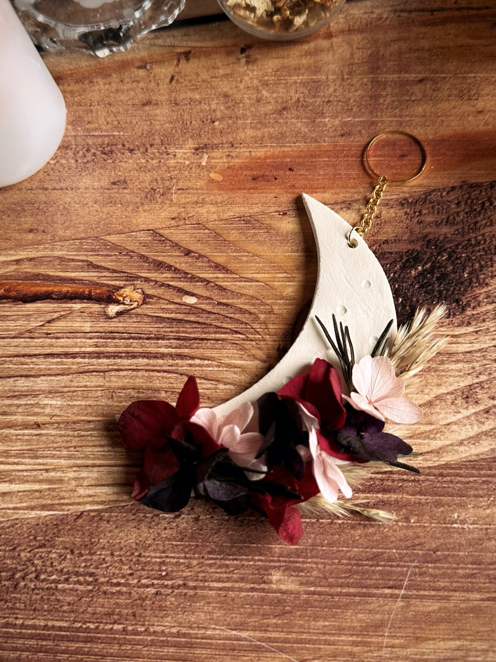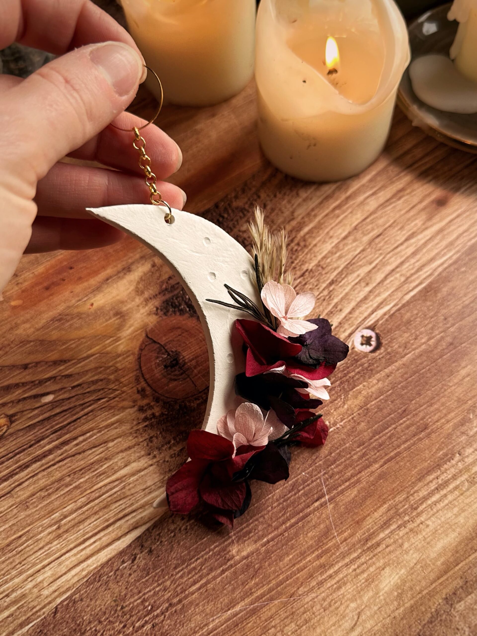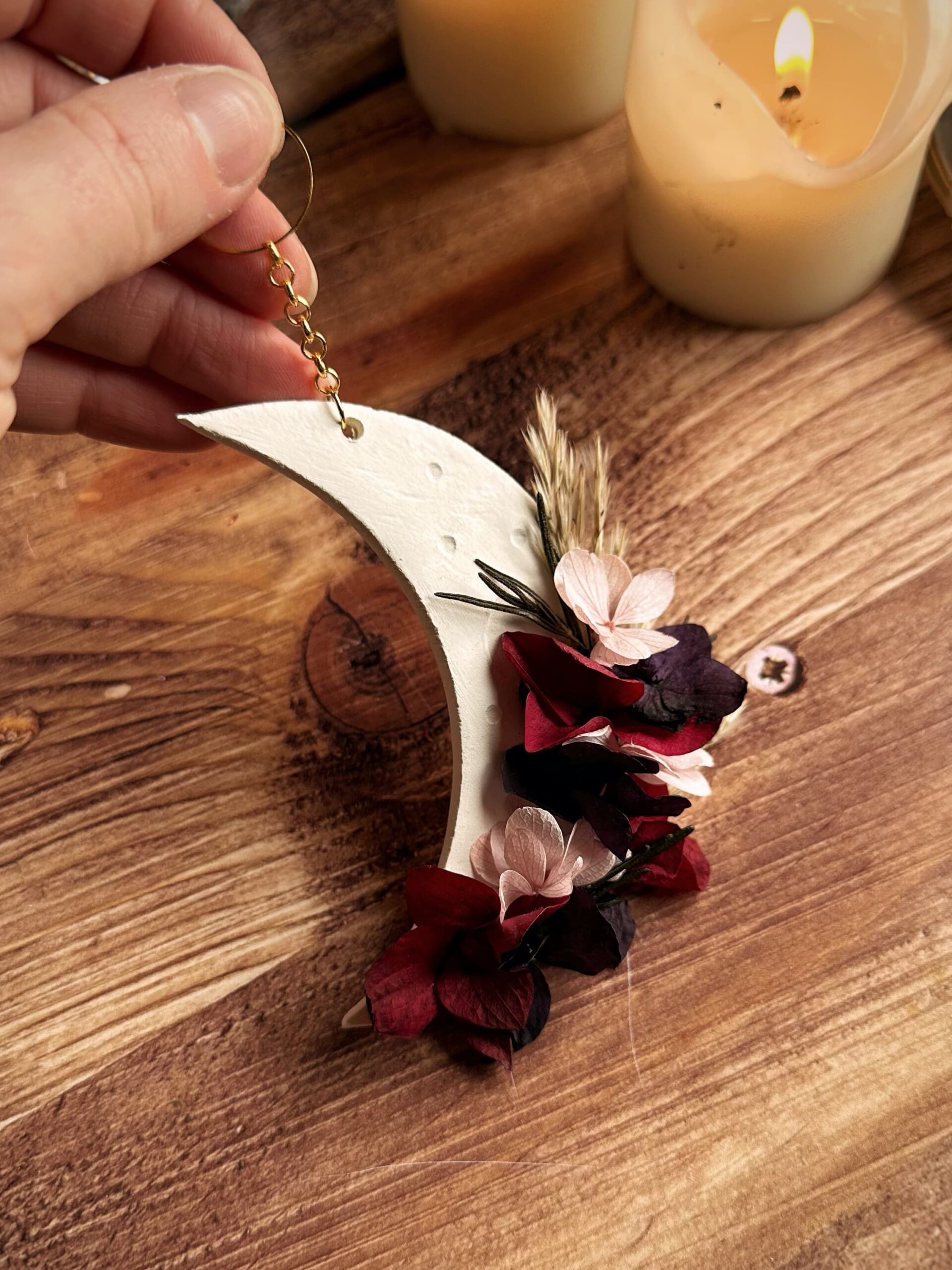 Velours – Suspension demie-lune en fleurs séchées et stabilisées et argile